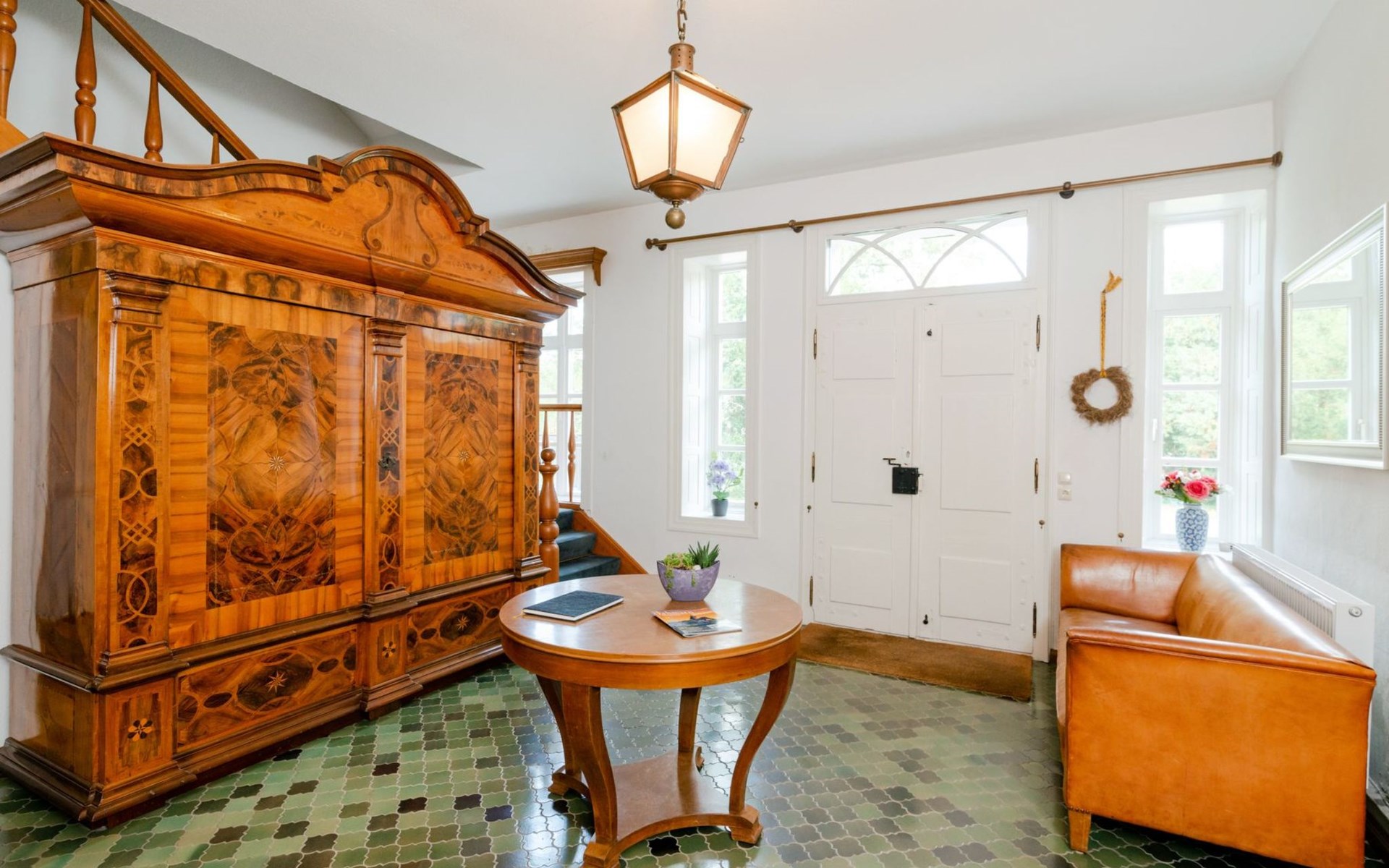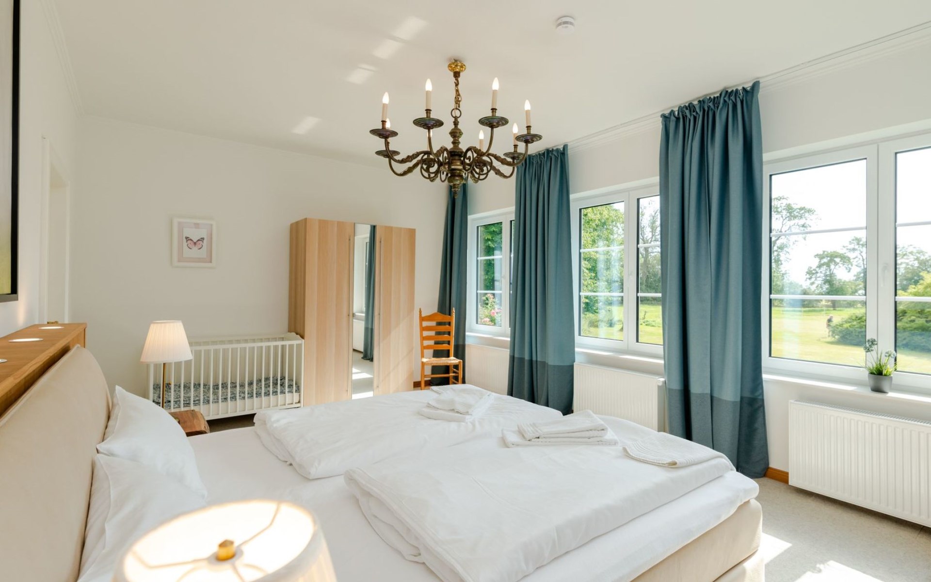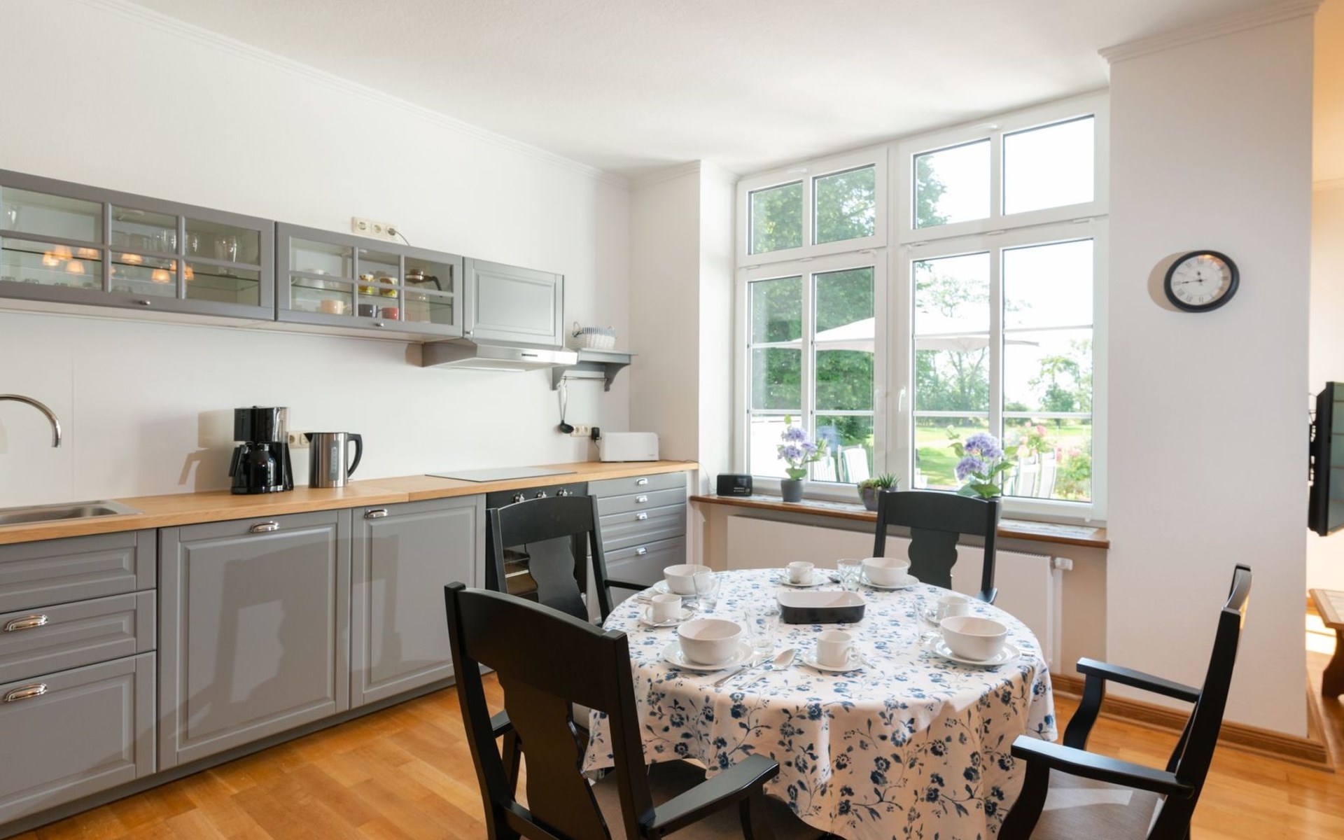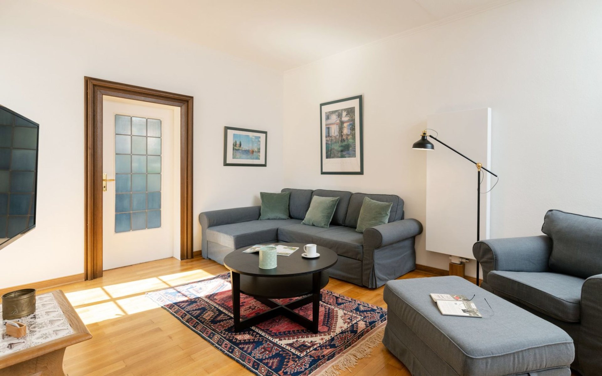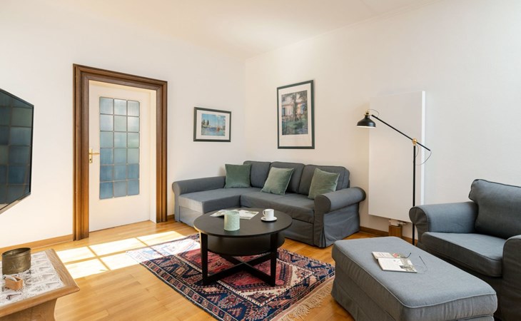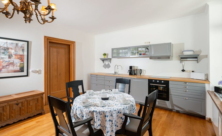 The flat is characterised by well thought-out furnishings that will make your stay comfortable and pleasant. A washing machine is available for communal use in the building. In the kitchen you will find a ceramic hob, a filter coffee machine, a kettle and a dishwasher to make your everyday life easier. The fireplace provides cosy warmth and comfort on cooler days. Although the flat does not have air conditioning or underfloor heating, the use of renewable energy and solar power guarantees an environmentally conscious stay.