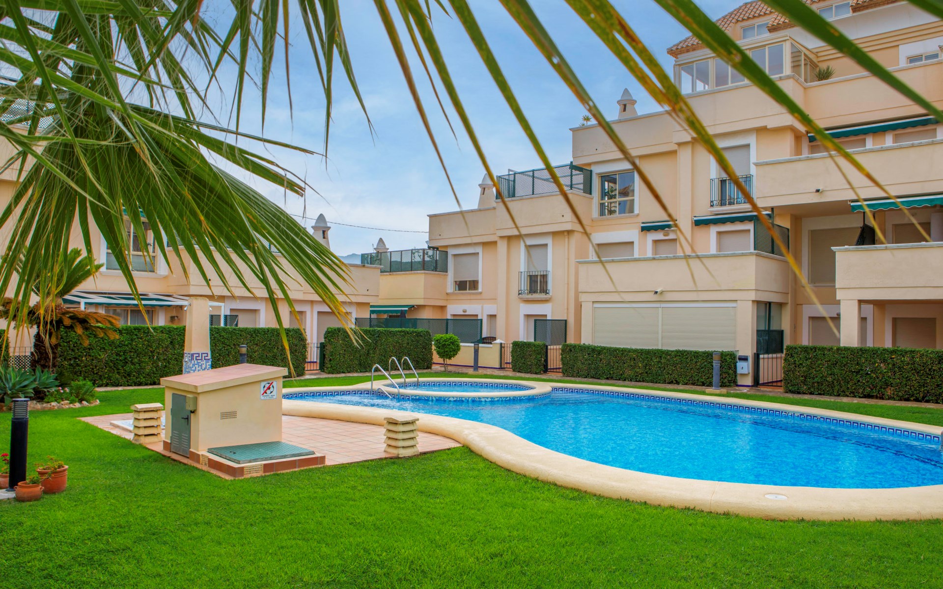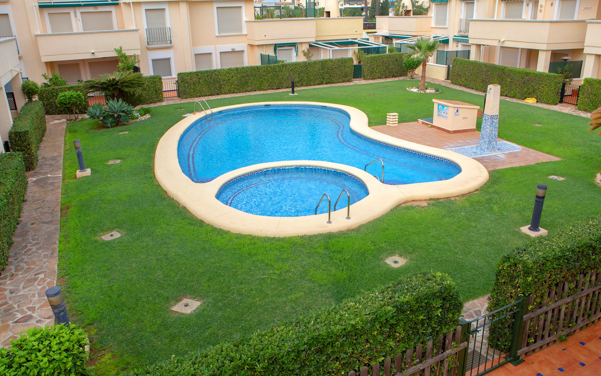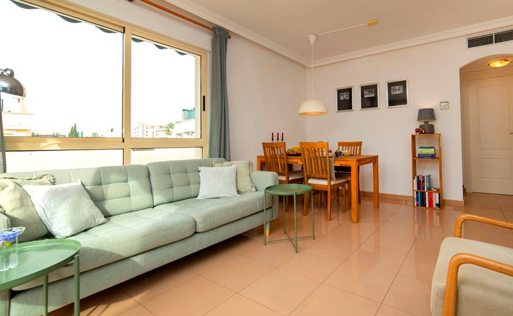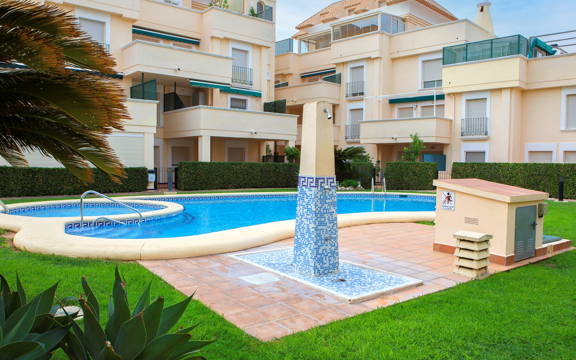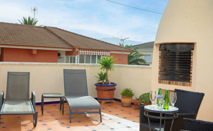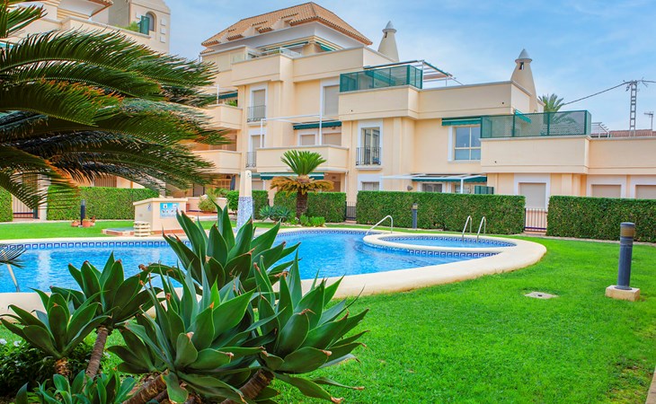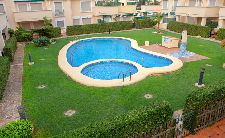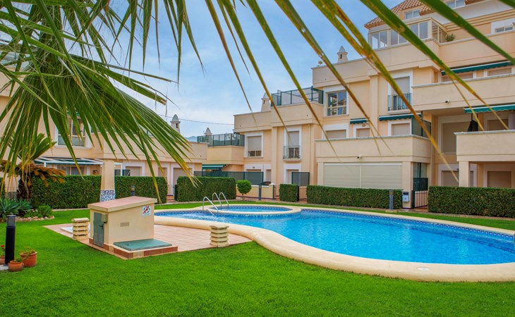Cosy, comfortable apartment block "Medina del Sol I". 4.5 km from the centre of Denia, in a quiet position, 230 m from the sea, 230 m from the beach. For shared use: garden (fenced) with lawn and flowers, swimming pool (15 x 7 m, depth 110 - 210 cm, seasonal availability: 01.Jan. - 31.Dec.) with internal staircase. Children's pool, outdoor shower, public car park. Supermarket 150 m, restaurant, bar, café, bus stop, sandy beach 230 m. Sports harbour 4.5 km, tennis 3 km. The owner does not accept any youth groups.