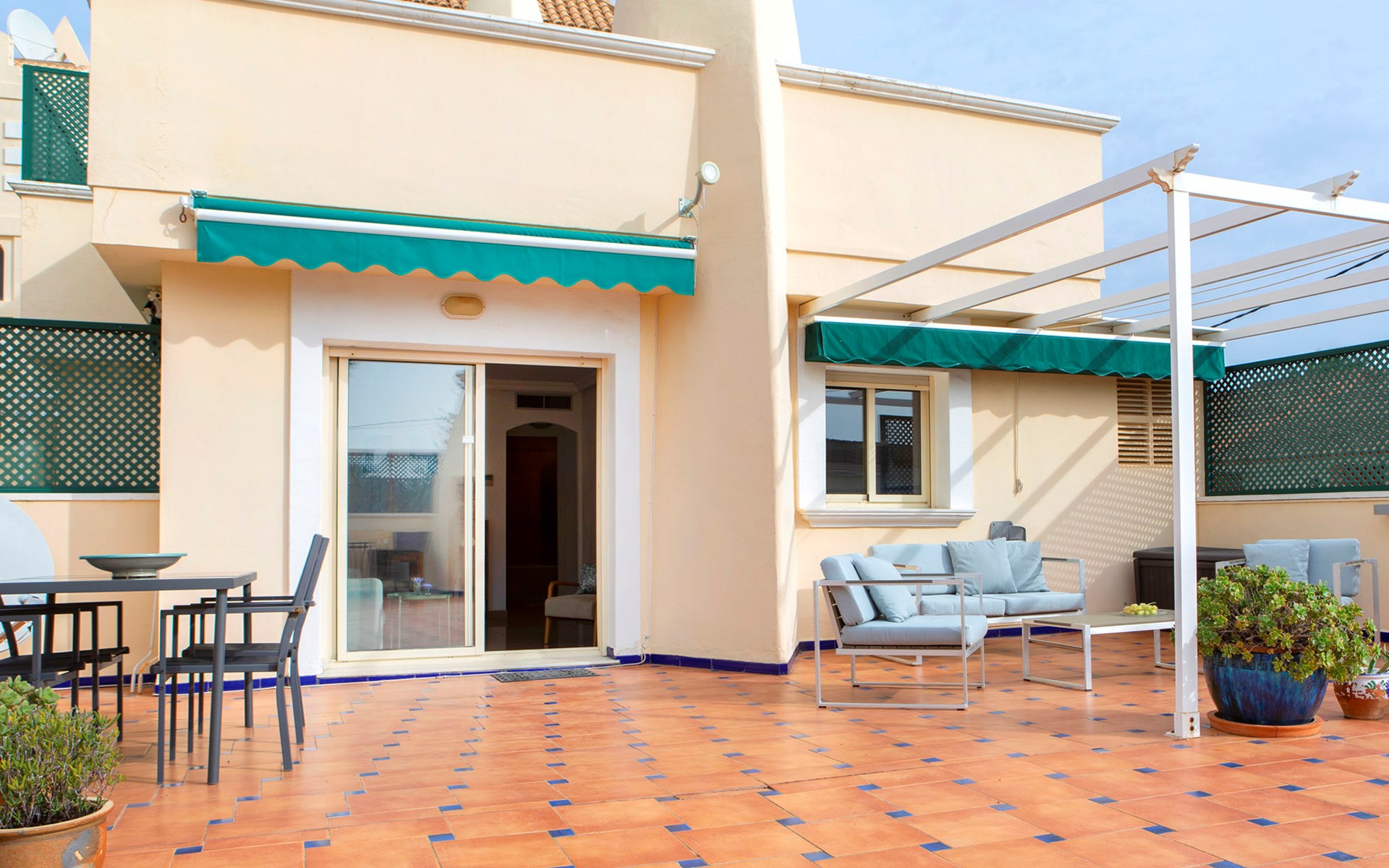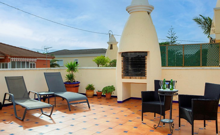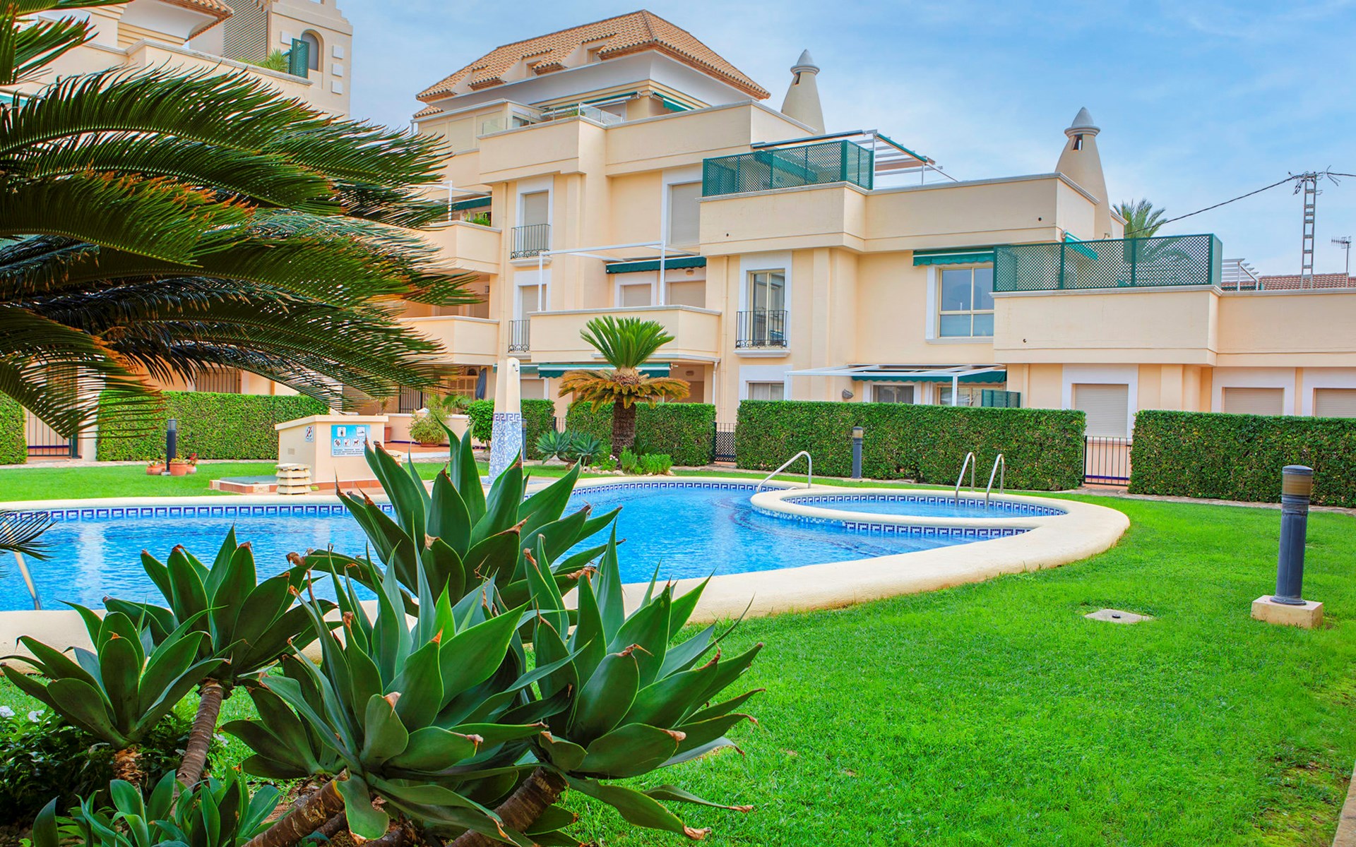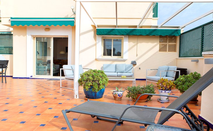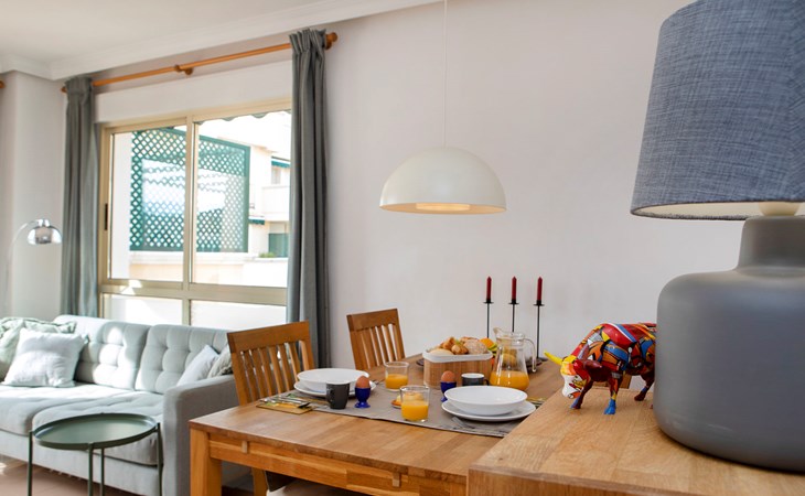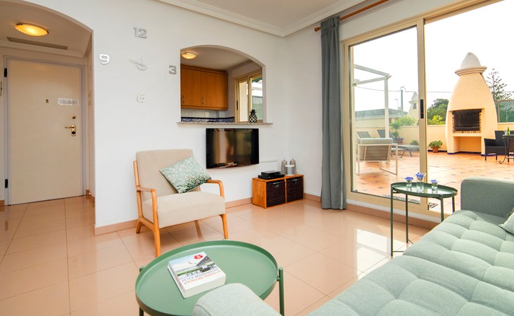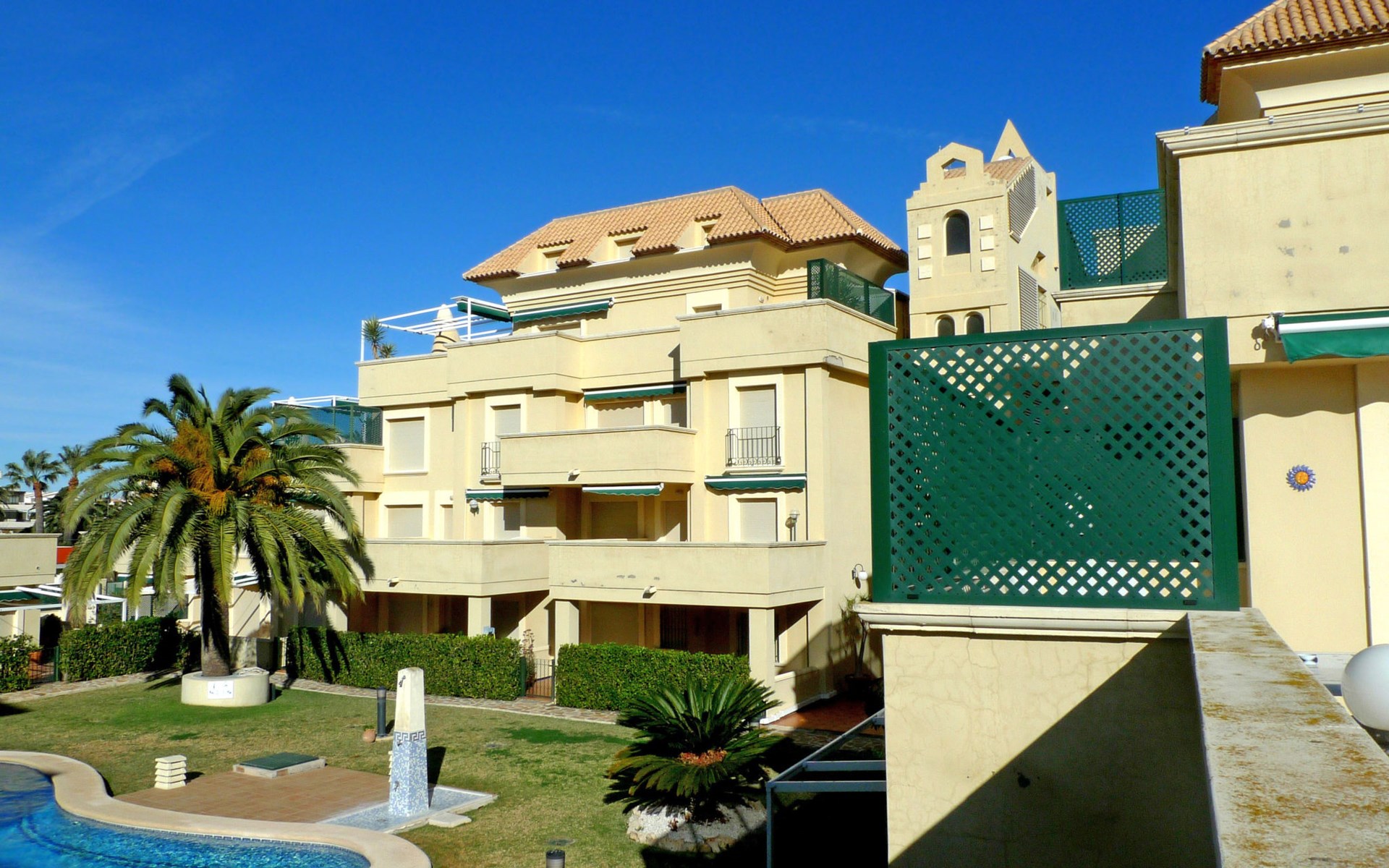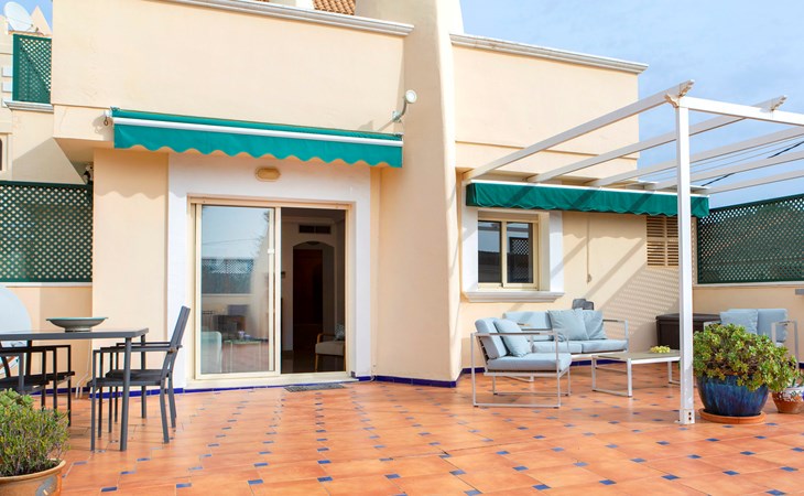 Cosy, comfortable apartment block "Medina del Sol I". 4.5 km from the centre of Denia, in a quiet position, 230 m from the sea, 230 m from the beach. For shared use: garden (fenced) with lawn and flowers, swimming pool (15 x 7 m, depth 110 - 210 cm, seasonal availability: 01.Jan. - 31.Dec.) with internal staircase. Children's pool, outdoor shower, public car park. Supermarket 150 m, restaurant, bar, café, bus stop, sandy beach 230 m. Sports harbour 4.5 km, tennis 3 km. The owner does not accept any youth groups.