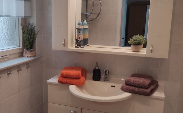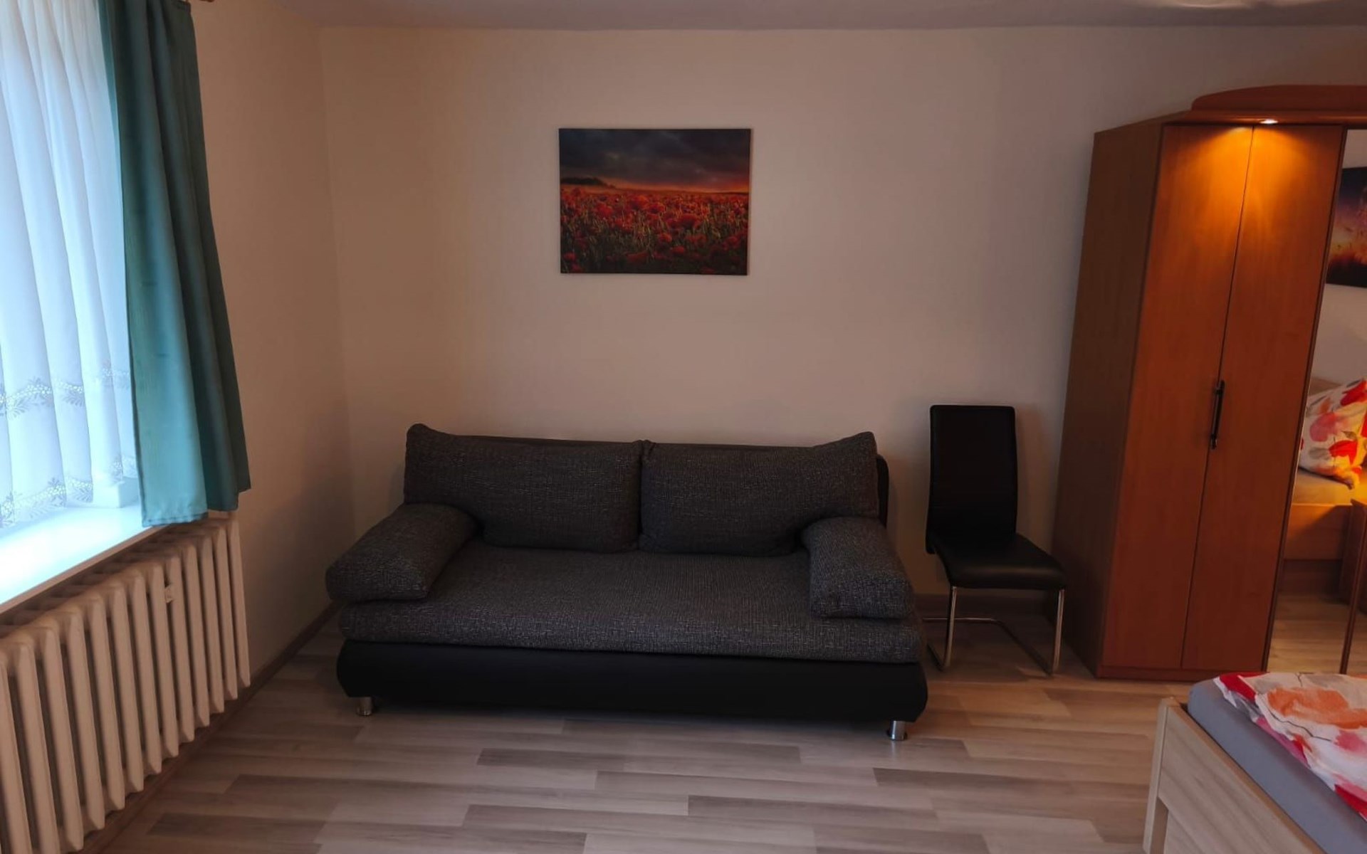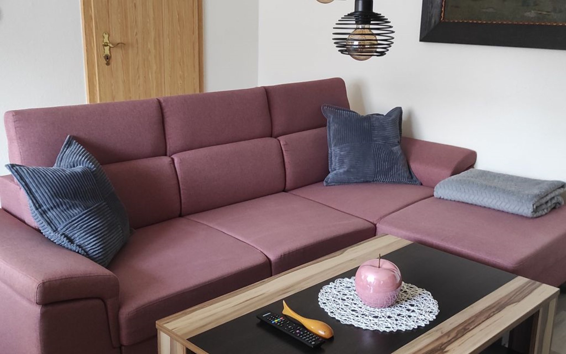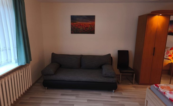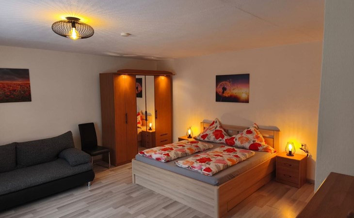 Our non-smoking holiday home is heated all year round and can accommodate 2-4 people. If required, we can also provide a cot for children up to 2 years old free of charge. There is a double bed in the bedroom. There is a sofa bed in the living room or bedroom for 2 more people. The bathroom is equipped with a washbasin, shower and toilet. Our small modern kitchen has an electric cooker with oven, sink, fridge, kettle, toaster and microwave. The living area is furnished with a corner sofa, parlour table and large dining table with 6 chairs. SAT-TV and radio are also available. Free WLAN access is available in all rooms!