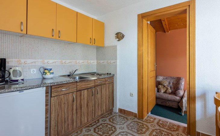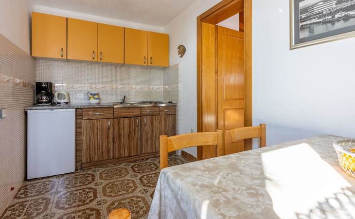 Stepping outside, the apartment boasts a lovely terrace that invites you to relax and soak in the splendid views of the sea. It's the perfect spot for sipping your morning coffee or unwinding in the evening breeze. Although the apartment itself does not offer a vast outdoor space, its proximity to the beach means you're never far from the opportunity to bask in the sun or dip your toes in the Adriatic Sea.