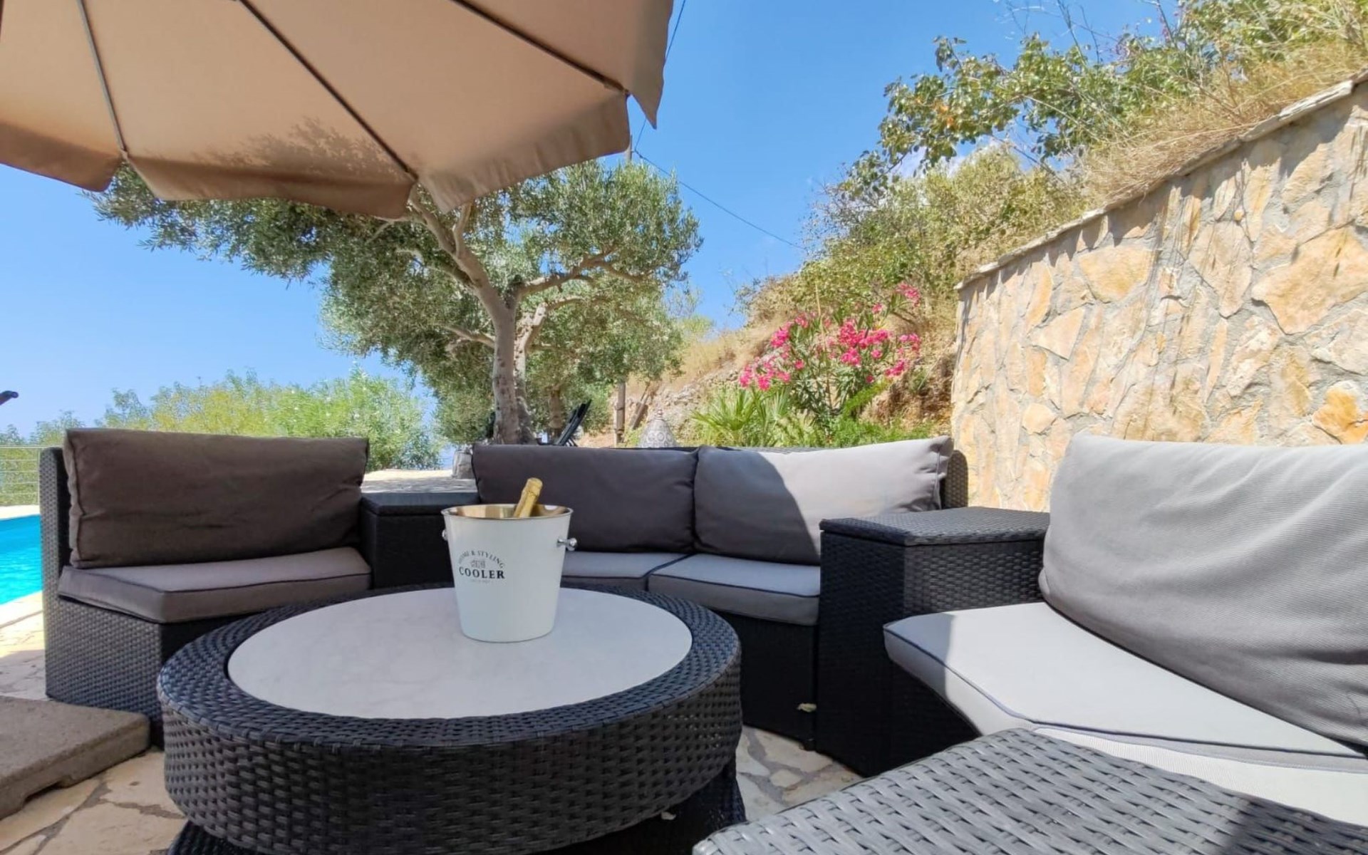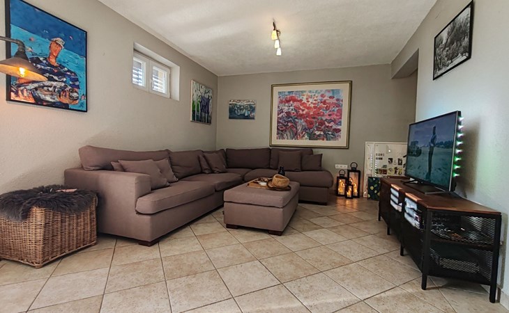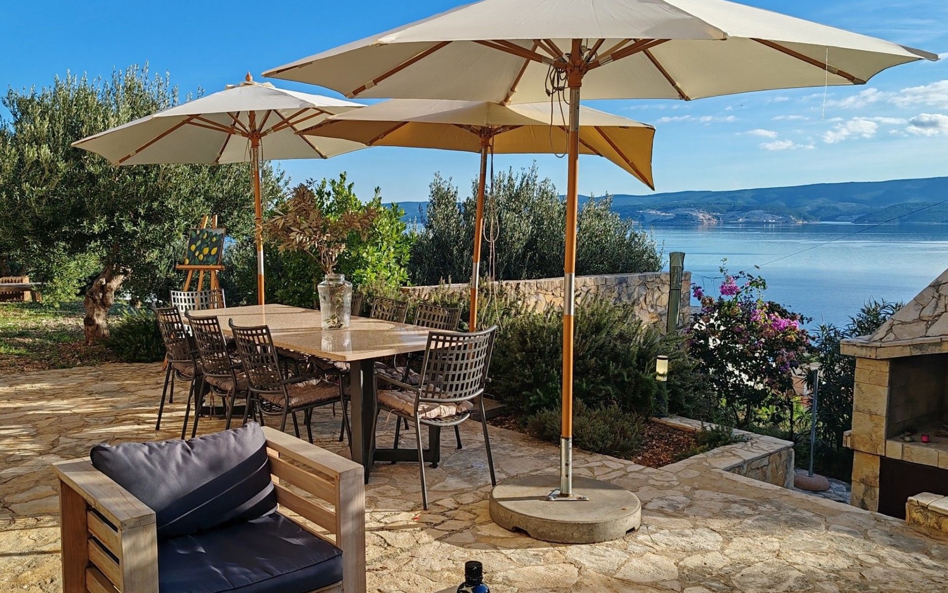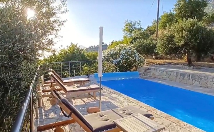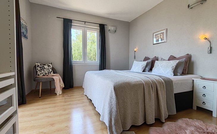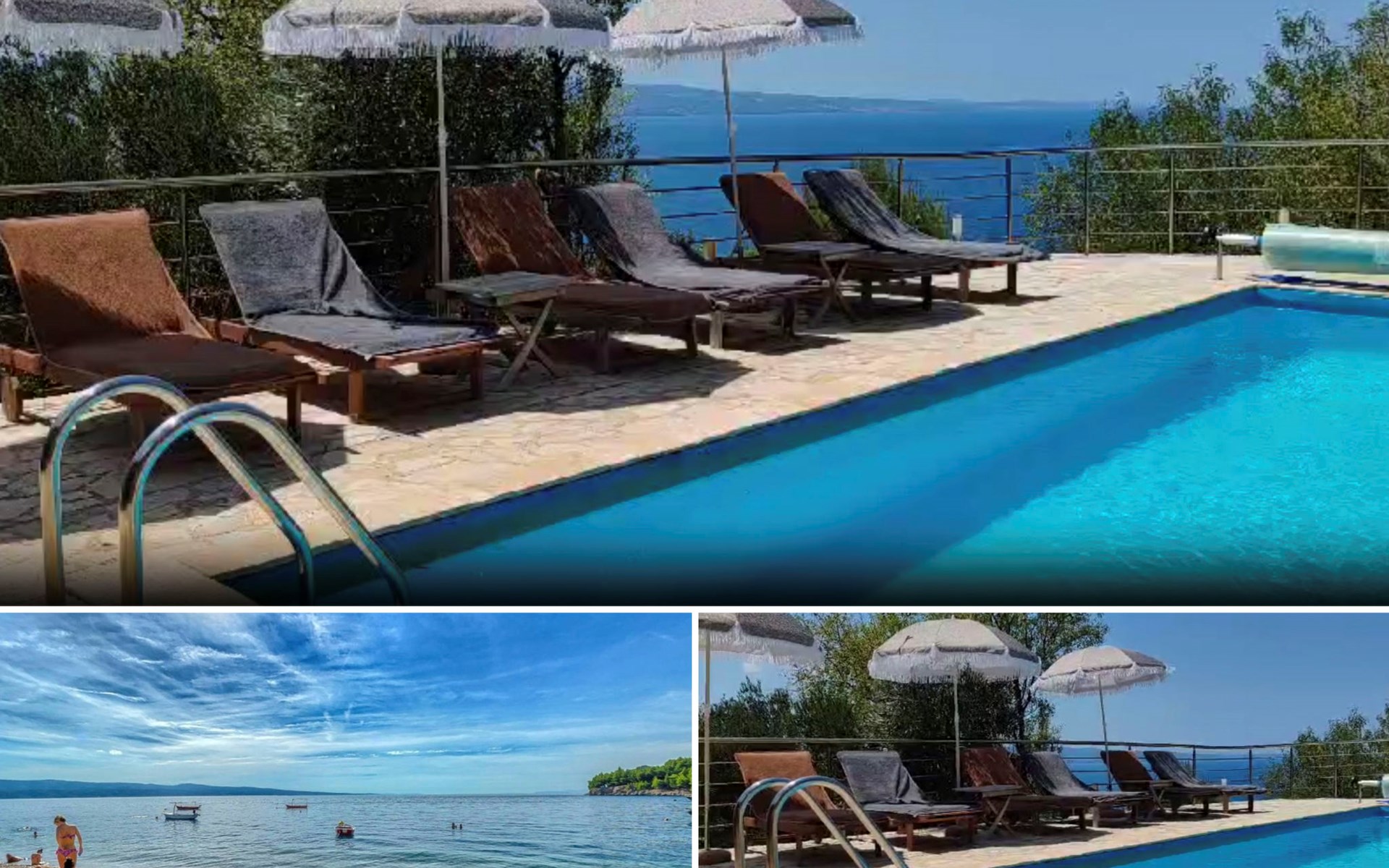 The outdoor area includes a swimming pool, a sunbathing area with sun loungers and parasols. You can also enjoy your evenings outdoors and prepare your meals on the barbecue. Relax by the private pool, enjoy the breathtaking views of the Adriatic Sea, the islands, and Biokovo National Park, and enjoy the ultimate comfort of the house.