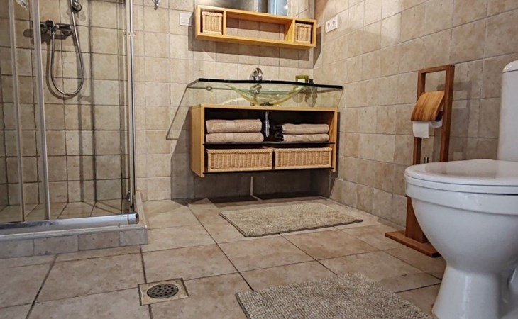 This unique house can accommodate up to 10 people and features 4 bedrooms with king-size beds, a pull-out sofa in the living room, and a fully equipped kitchen with a dishwasher, stove, oven, coffee maker, kettle, refrigerator, and other kitchen utensils. There are 2 bathrooms with showers and two additional toilets.