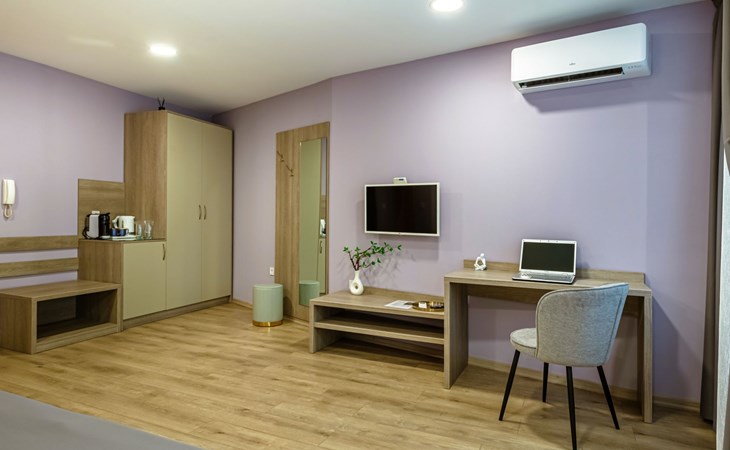 Inside, each studio is a marvel of thoughtful design to meet your every need. Guests are treated to a host of amenities, including a flat-screen TV for your entertainment needs, alongside tea and coffee-making facilities for a warm start to your day. A small refrigerator keeps your beverages and snacks chilled, while the absence of a fan is amply compensated by air conditioning available throughout, ensuring your environment is always at a pleasant temperature. Despite the lack of a separate bedroom, the studio space is ingeniously planned to maximize comfort and functionality, making it a cozy base for your adventures in Plovdiv.