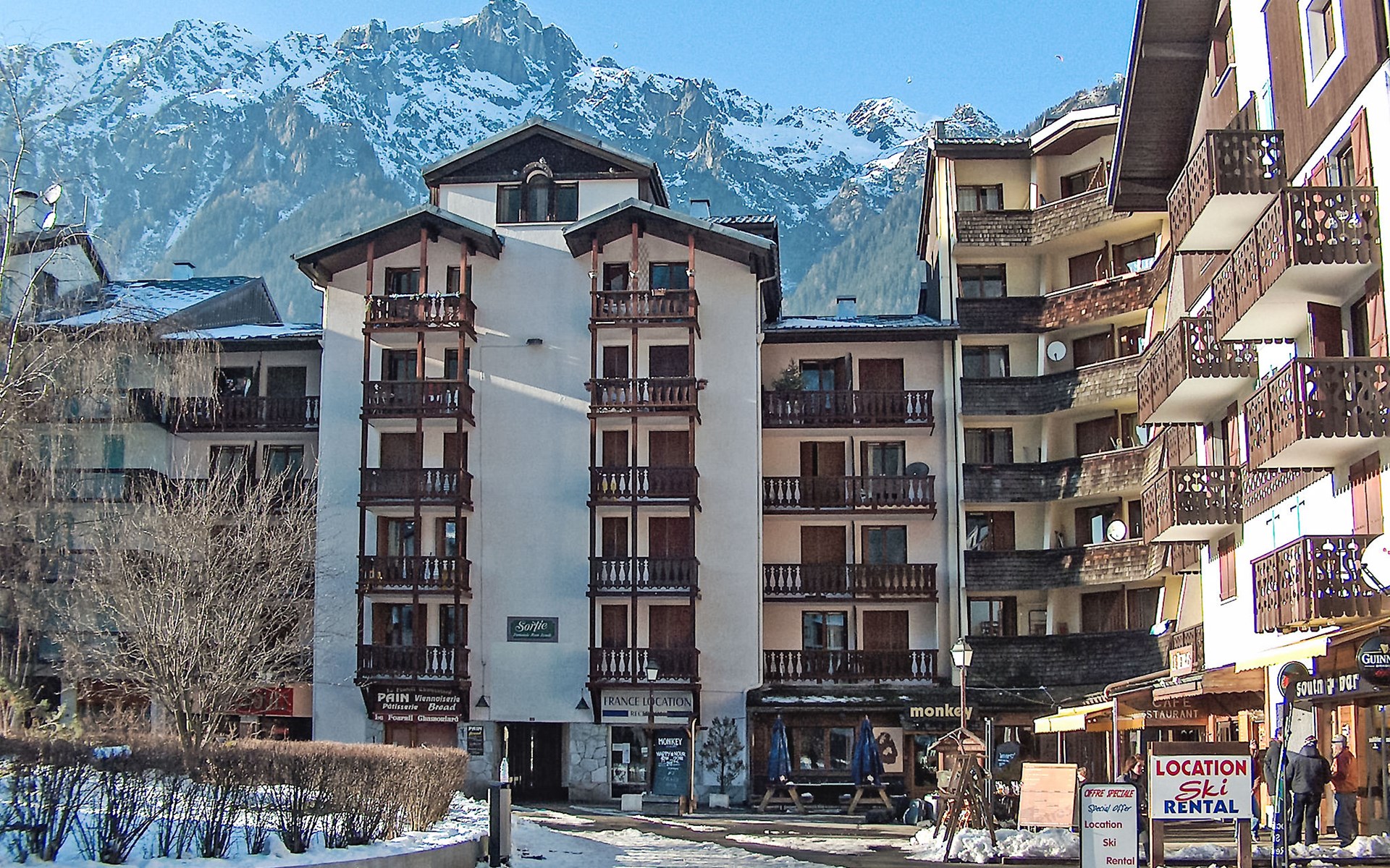 Residence "La Forclaz". In the district of Chamonix Sud, 350 m from the centre, in a busy position. In the complex: lift. Shop, supermarket, shopping centre 600 m, restaurant 50 m, bar 50 m, bus stop 200 m, railway station "Chamonix Mont-Blanc" 800 m. Golf course (18 hole) 4.4 km, sports centre 1 km, skisport facilities 1 km, cross country ski track 1 km. Nearby attractions: Téléphérique de l'Aiguille du Midi 200 m, Train du Montenvers Mer de Glace 900 m. Please note: nightclub/disco close by.