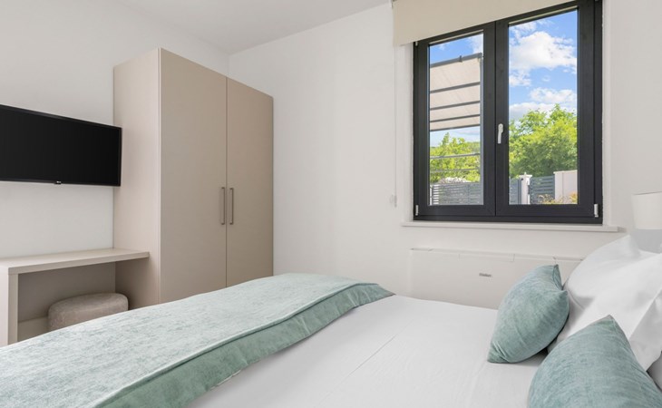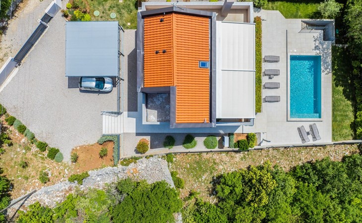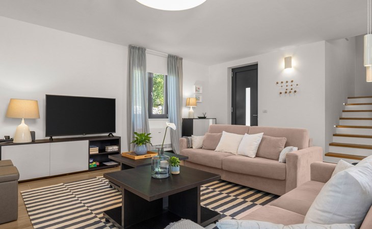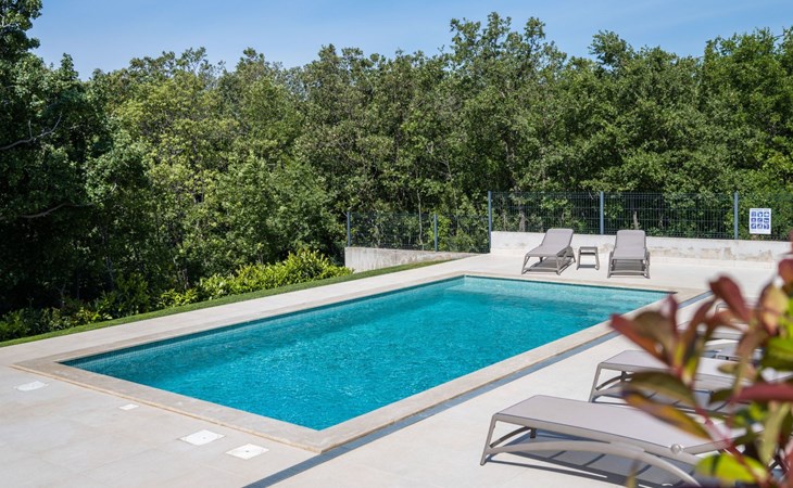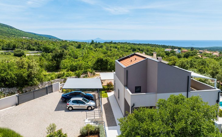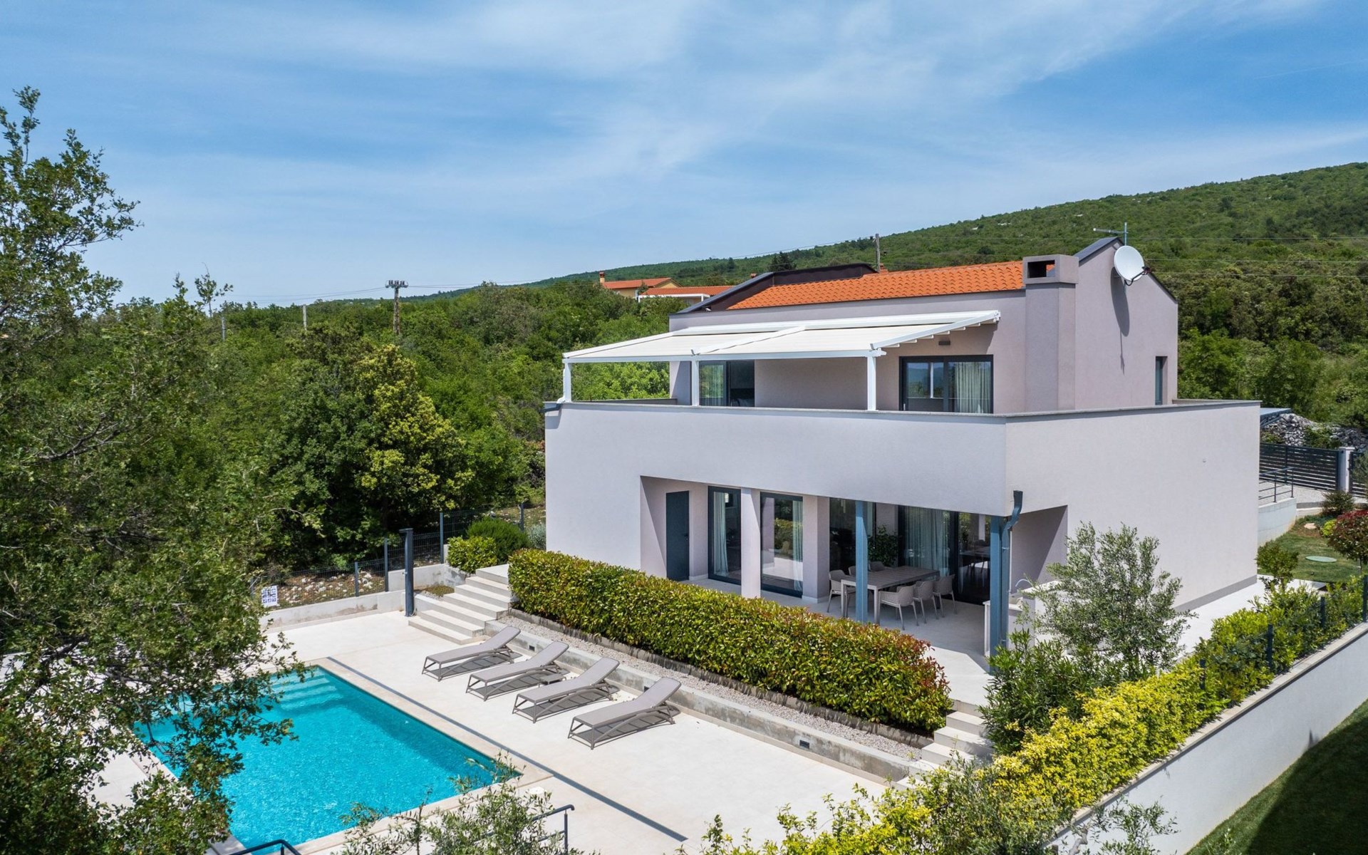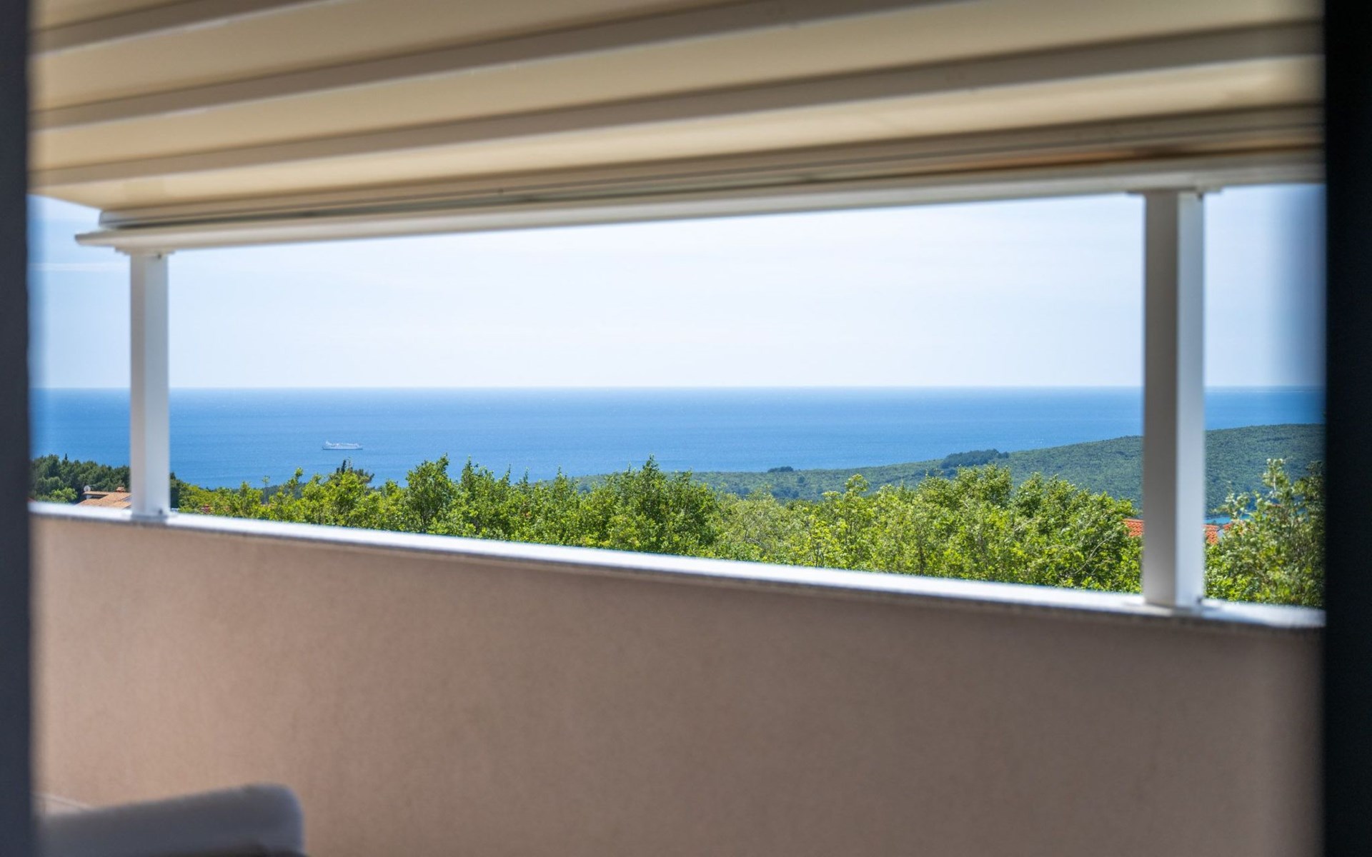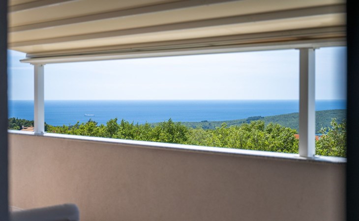 Inside Villa Alba, guests are greeted by a spacious and elegantly decorated interior. On the lower floor of the villa there is a modern kitchen equipped with everything necessary for preparing meals, including a ceramic hob, filter coffee machine, capsule coffee machine, dishwasher and kettle. There is also a spacious dining room and living room, along with one bedroom. Two additional bedrooms are located on the upper floor, each with its own bathroom and terrace overlooking the Kvarner Bay, and each bedroom can be darkened for maximum privacy and comfort.