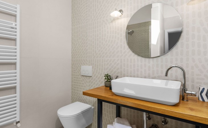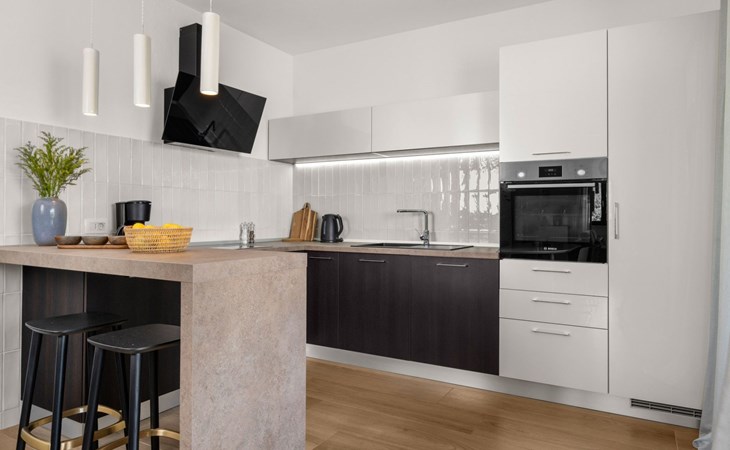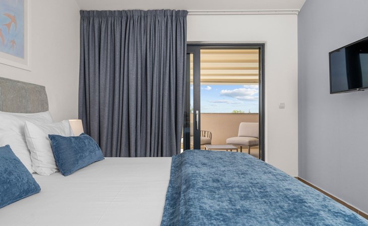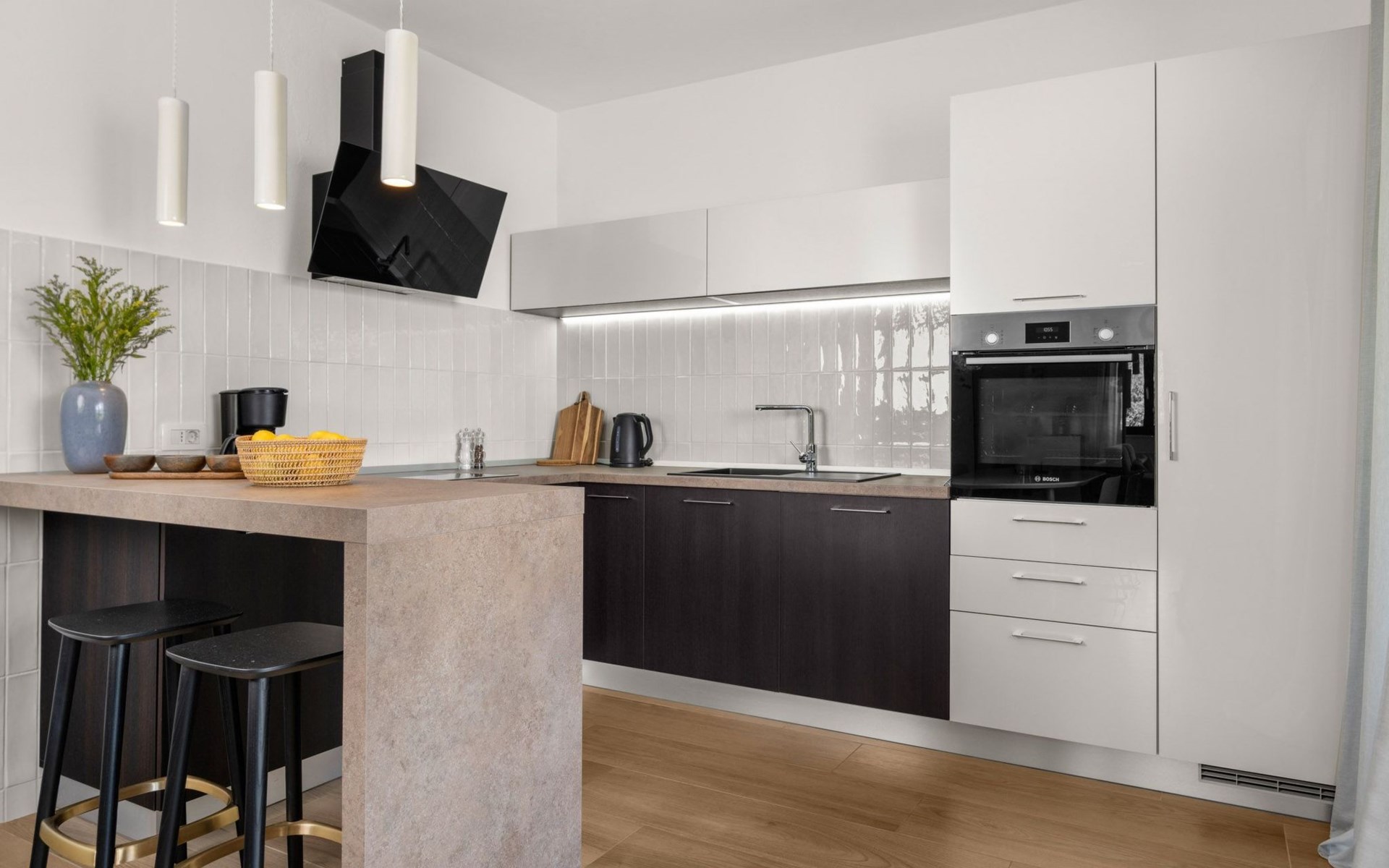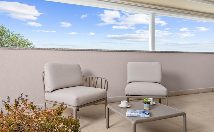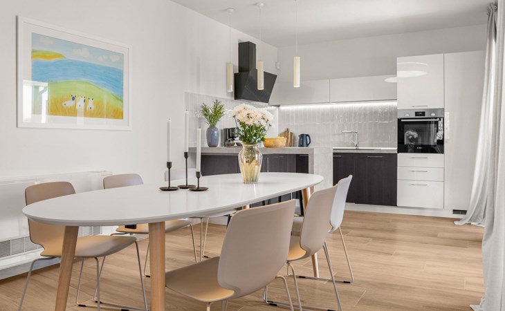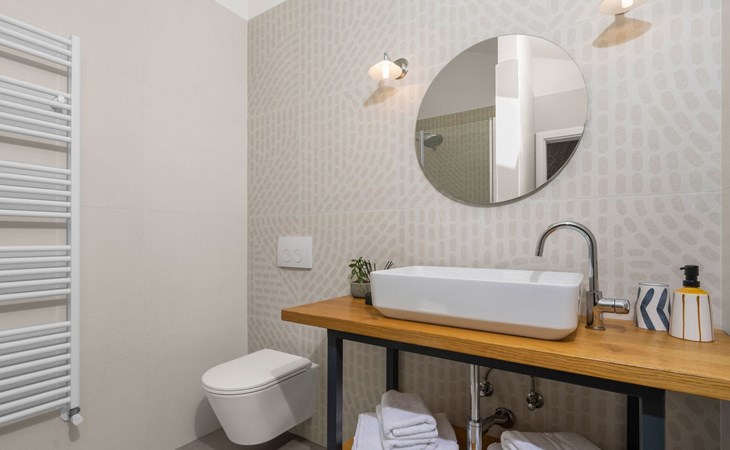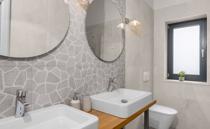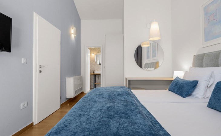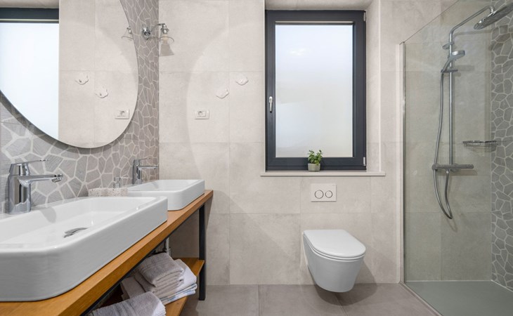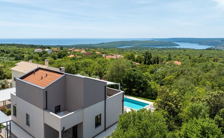 Inside Villa Alba, guests are greeted by a spacious and elegantly decorated interior. On the lower floor of the villa there is a modern kitchen equipped with everything necessary for preparing meals, including a ceramic hob, filter coffee machine, capsule coffee machine, dishwasher and kettle. There is also a spacious dining room and living room, along with one bedroom. Two additional bedrooms are located on the upper floor, each with its own bathroom and terrace overlooking the Kvarner Bay, and each bedroom can be darkened for maximum privacy and comfort.