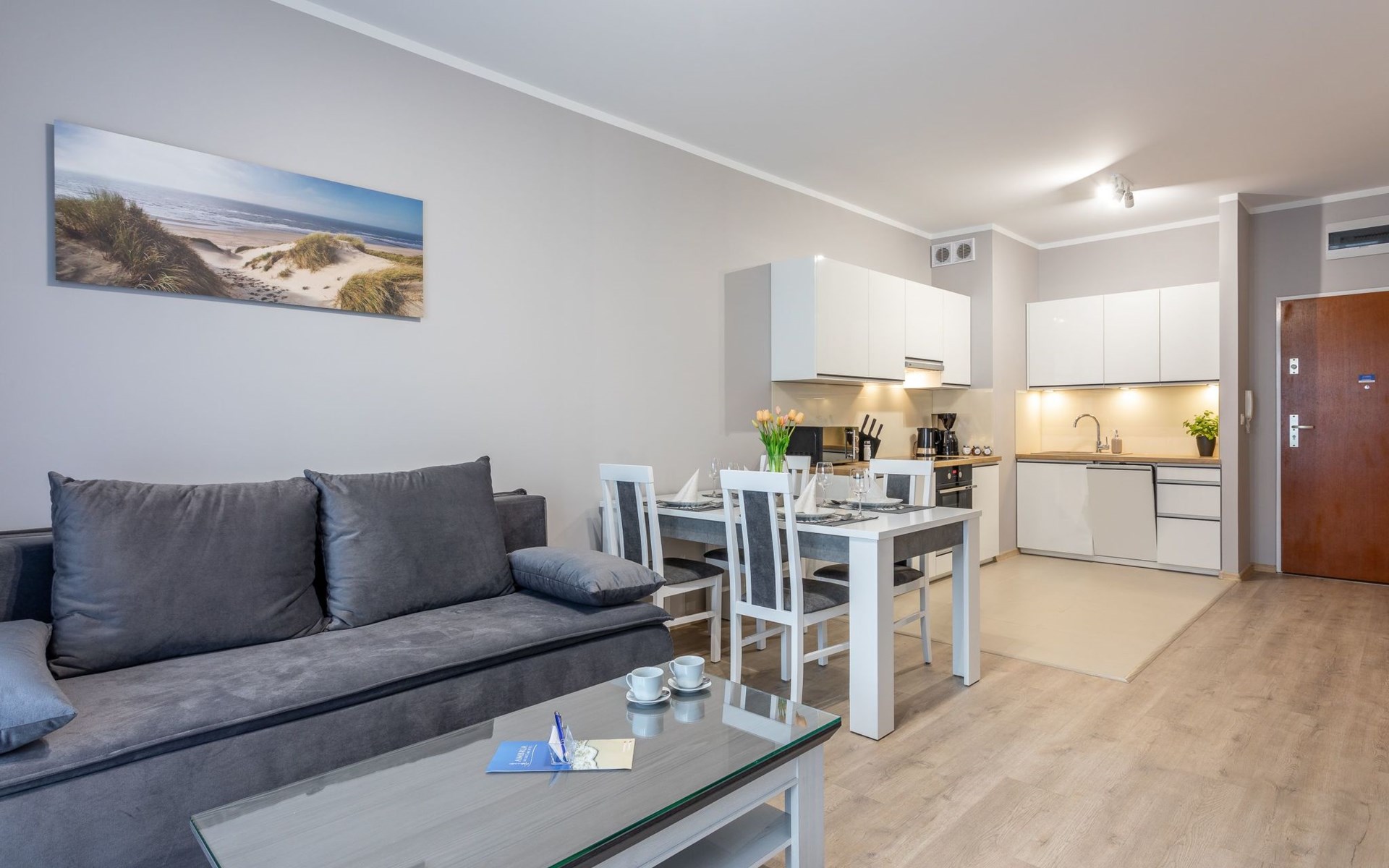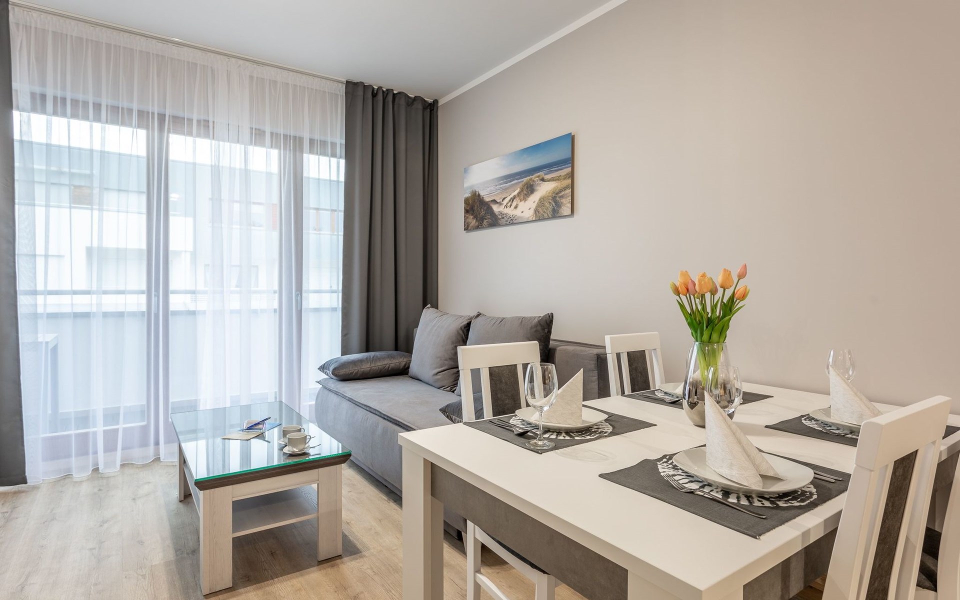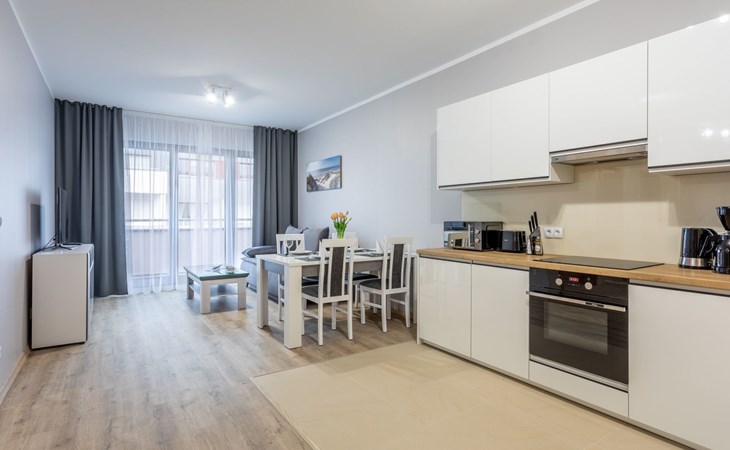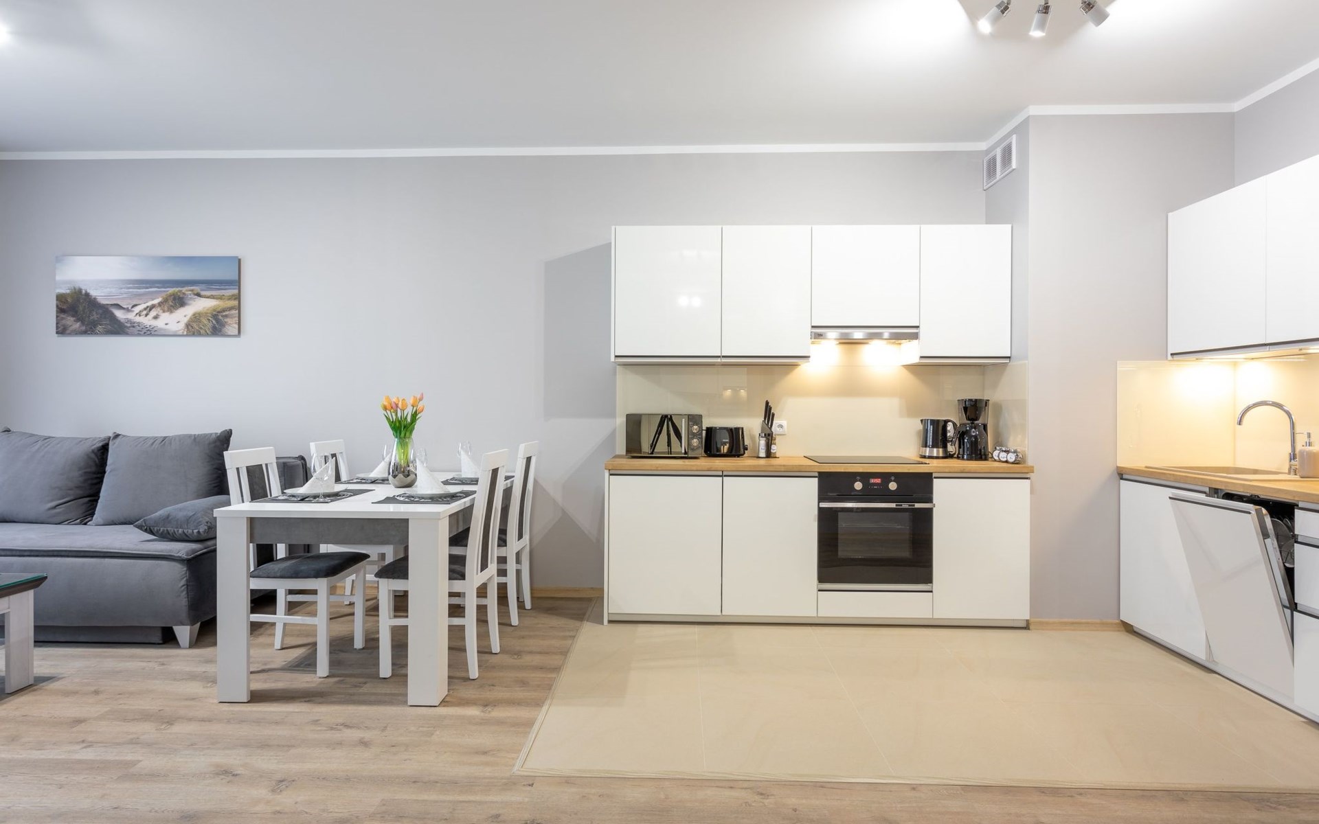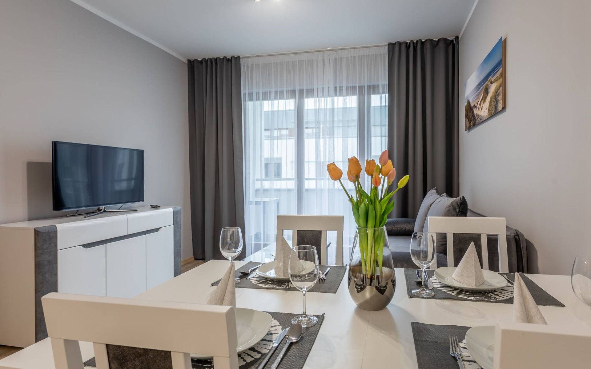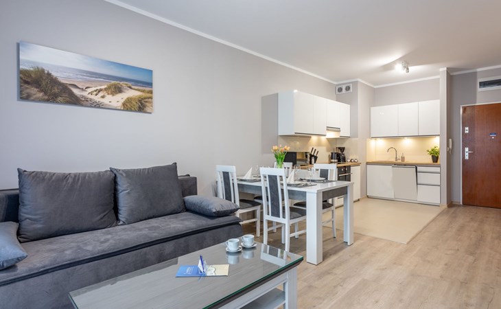 It is a very spacious flat with a total area of 51 m2, not far from the sea. It consists of a large bedroom, a living room with a kitchenette and a bathroom. It also has a sunny balcony where you can enjoy the moments between successive attractions. The interior is dominated by muted neutral colours - white, grey and ecru, enhanced by natural light and simple shapes that bring the mood of order and harmony as well as sublime elegance. In addition, a complete interior not only increases the functionality of the room, but also affects the comfort and true pleasure of use. A touch of rustic atmosphere combined with the ergonomics of modern solutions create an optimal space for relaxation.