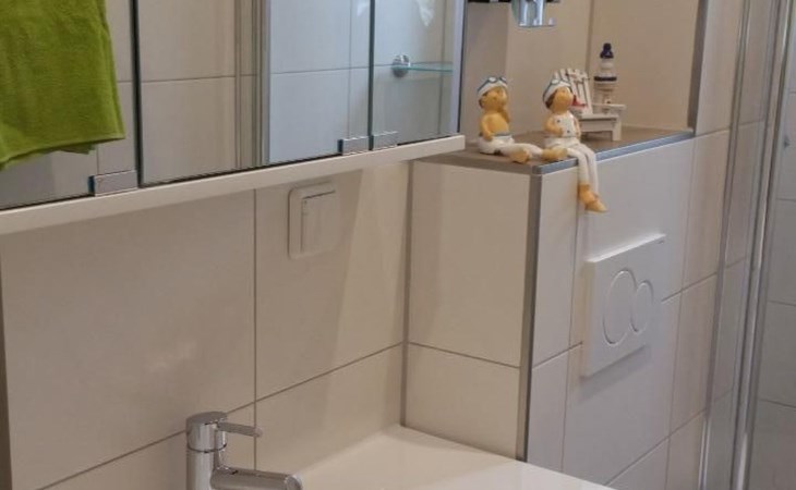 The daylight bathroom has been renovated in a modern style and offers you a large shower area without barriers.