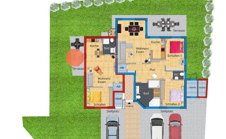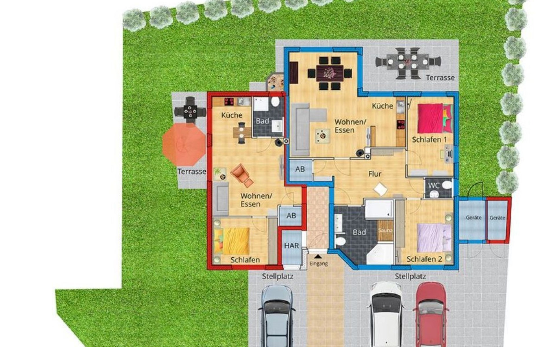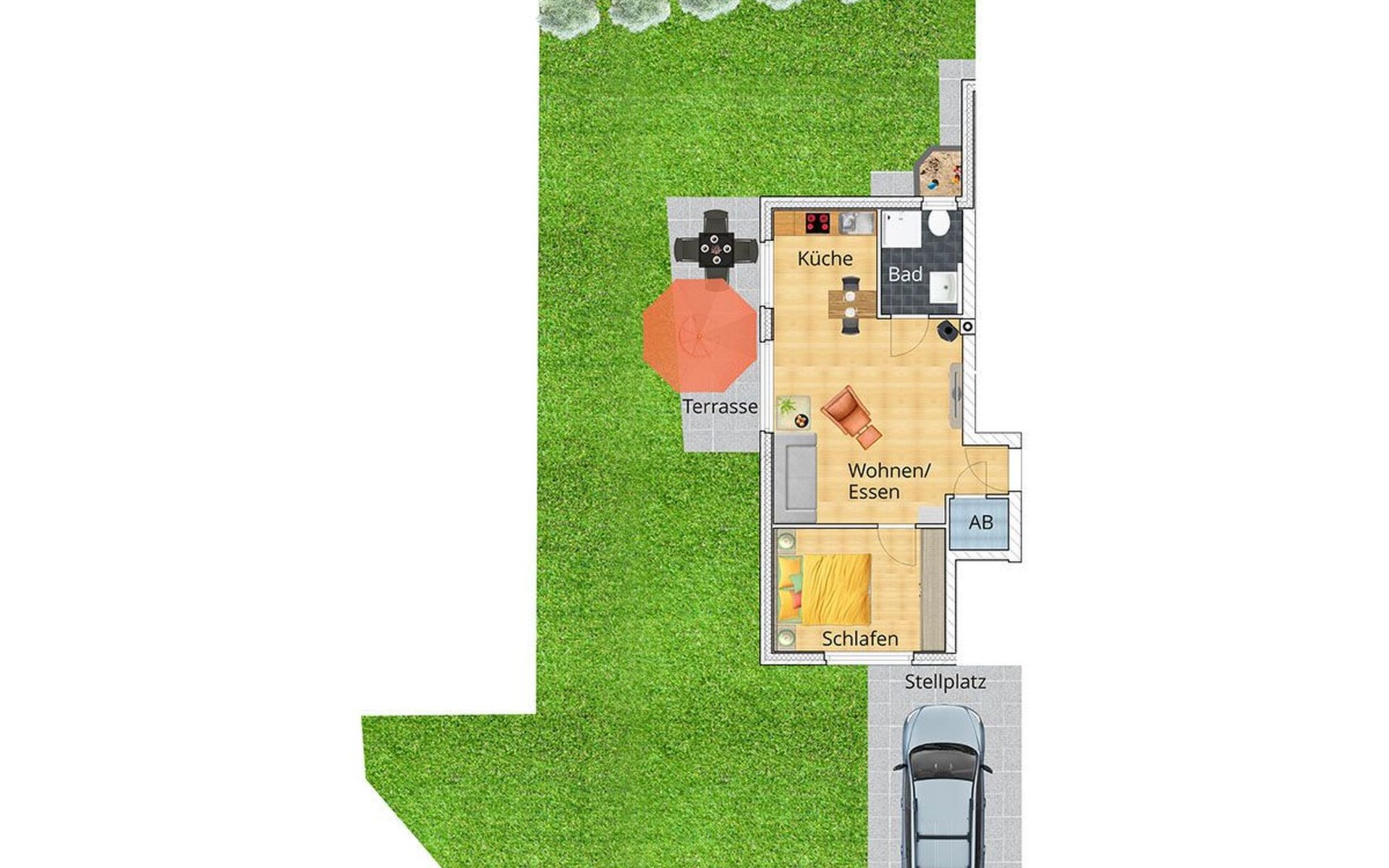 The house, which offers a total of 2 residential units, stands on a plot of approx. 750m² surrounded by a hedge. A private terrace with garden furniture and barbecue, a small sand play area for children and a storage room with bicycles and toys round off the offer. There is a car parking space in front of the house on the property.