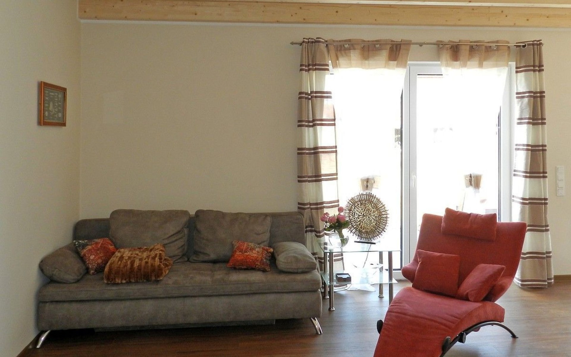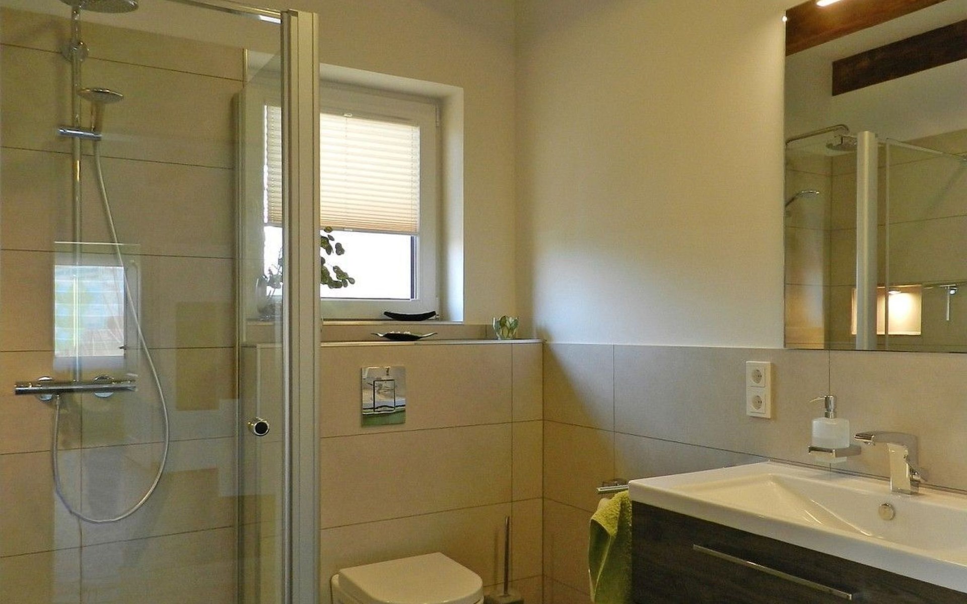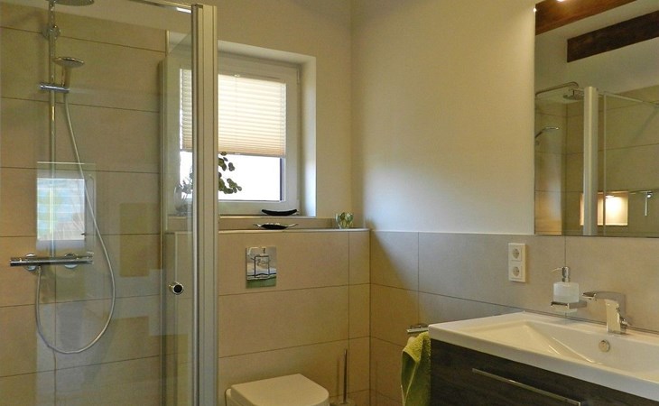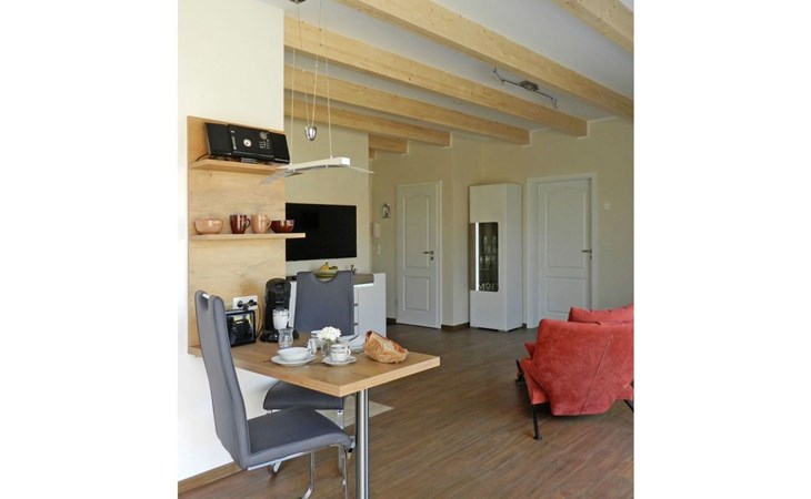 Upon entering the holiday flat, you will find yourself in a spacious living/dining room with kitchenette, which is equipped with friendly furnishings. Underfloor heating and a decentralised ventilation system ensure a good indoor climate throughout the flat. The brightly furnished bedroom has electric shutters and a flat-screen TV, while the high-quality bathroom has a large bath front and a relaxing rain shower, and the kitchenette also leaves nothing to be desired, so you can enjoy breakfast on the terrace bathed in morning sunshine.The holiday flat also has a storage room with a wardrobe and a high chair, but still offers enough space for your supplies. The flat also has two bicycles (28") and a barbecue.