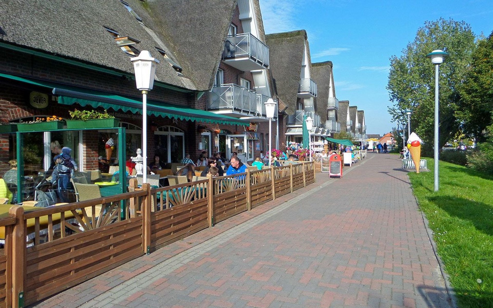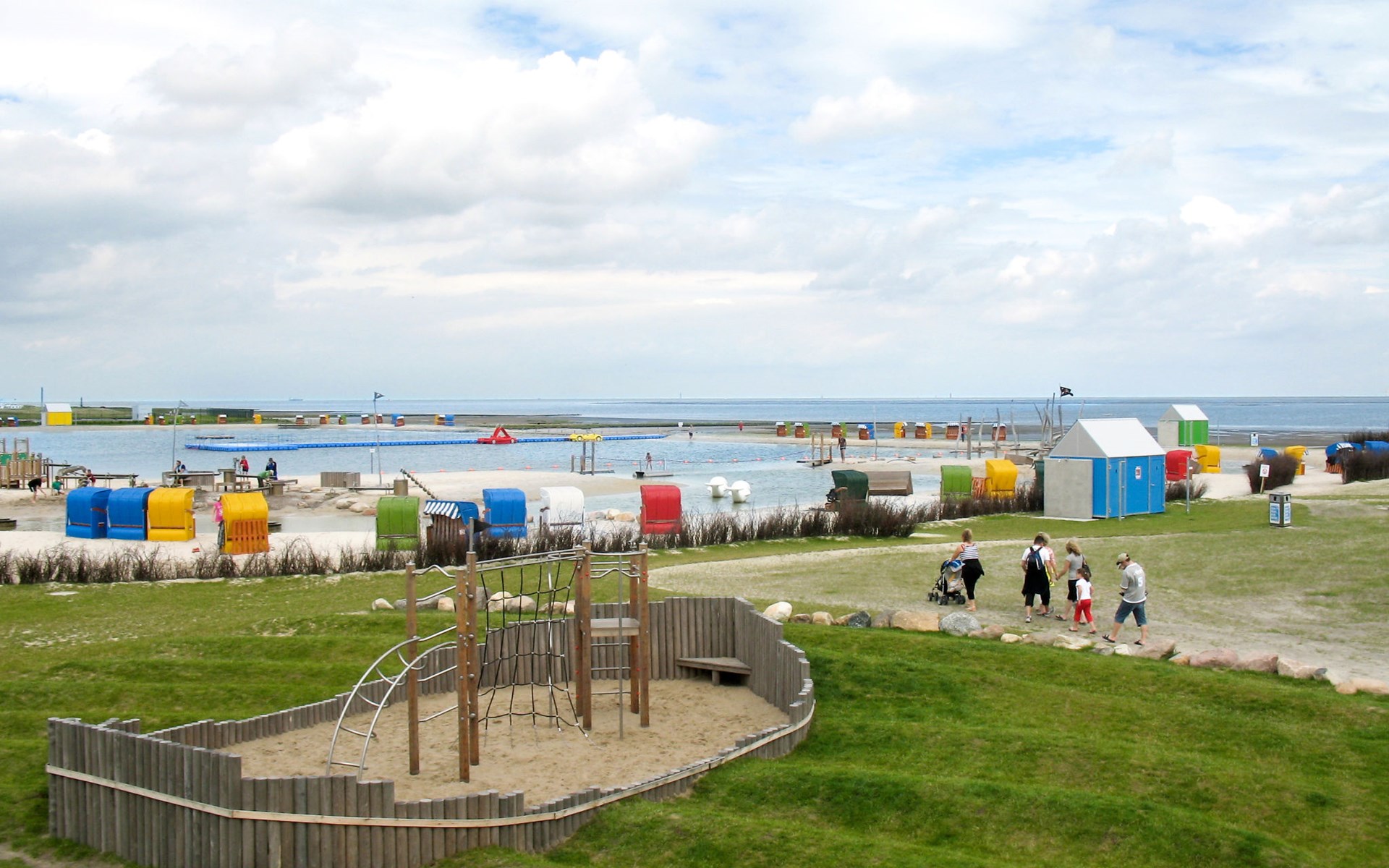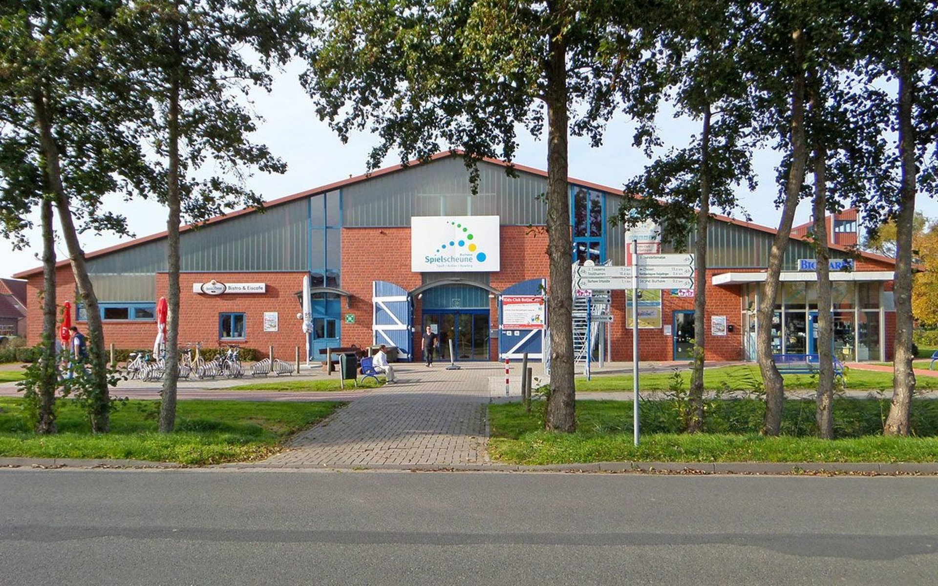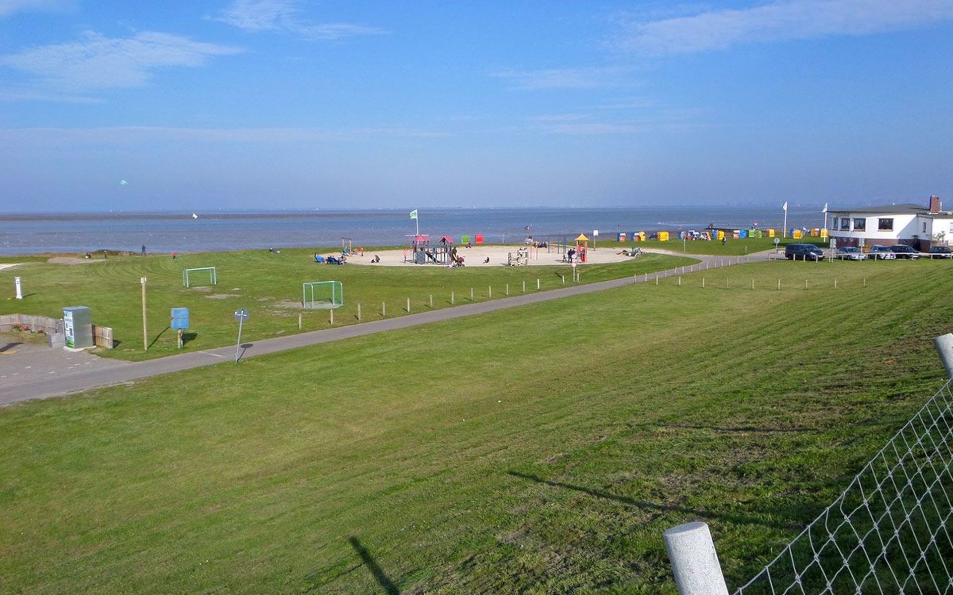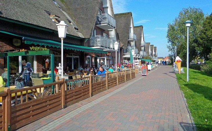 Burhave is located on the green island of Butjdingen on the Jade Bay. Many meadows and primarily the coastal area characterise the surroundings. Burhave has its own stretch of beach on the green beach, where the beach chairs are also located. A small restaurant and a large playground are located there, as are the campsites. A few hundred metres further on is the North Sea lagoon, an open-air seawater pool that is independent of the tide. In the immediate vicinity of the holiday home you will also find the Spielscheune - an indoor playground with bowling alley and small restaurant - an adventure mini-golf course, a bicycle hire shop and small souvenir shops and restaurants. Children's entertainment is also offered in the summer season. Other Malere coastal towns are not far away, e.g. Fedderwardersiel, from where small boat trips are offered. Other interesting sights include the Langwarder Groden, a high ropes course and the Iggewarden farm. A car ferry departs from Nordenham to Bremerhaven every 20 minutes. Wilhelmshaven is also nearby and well worth a visit.
