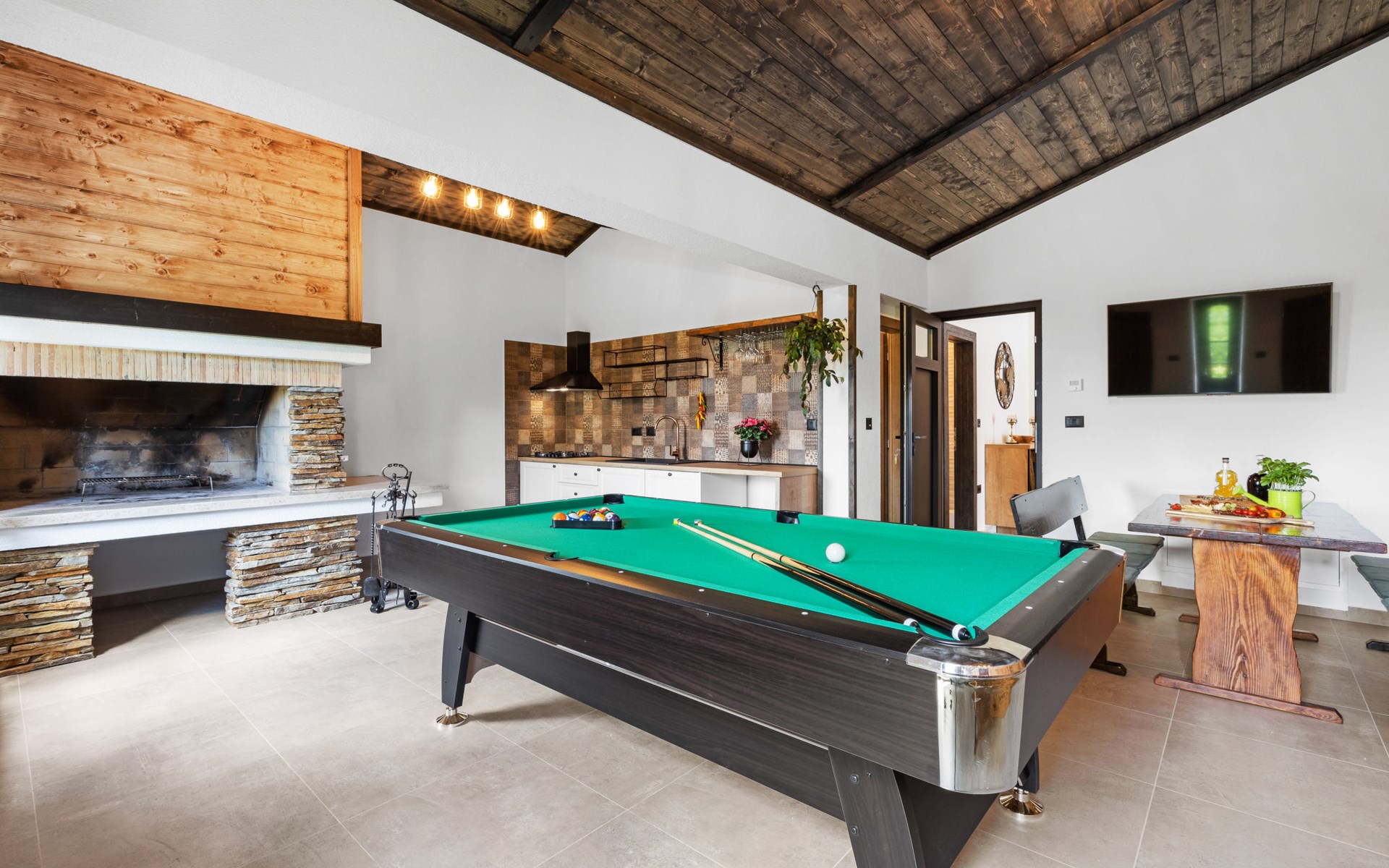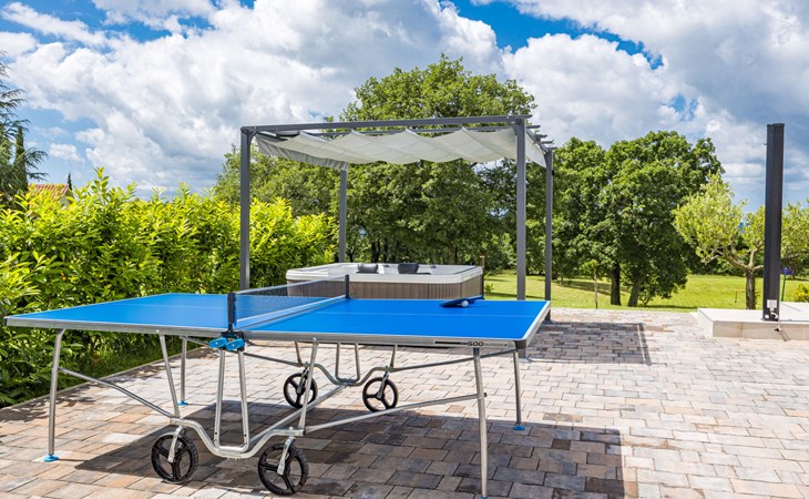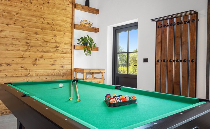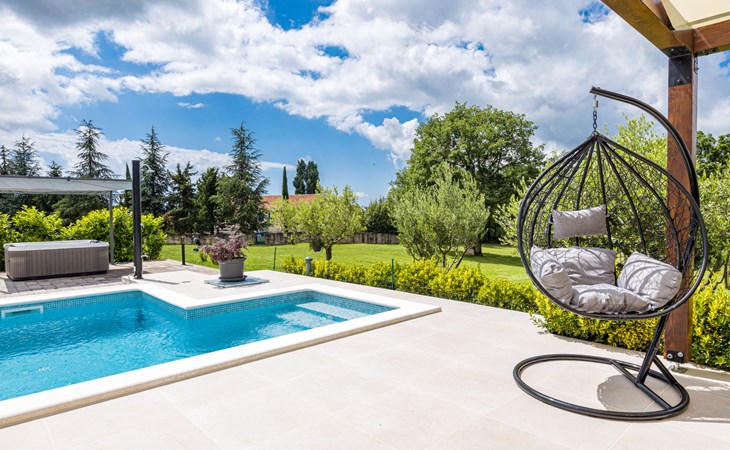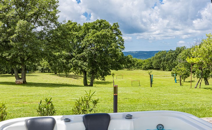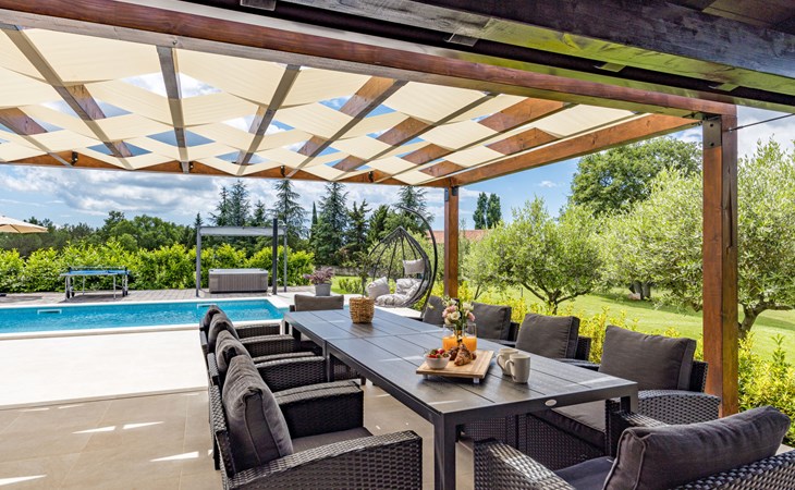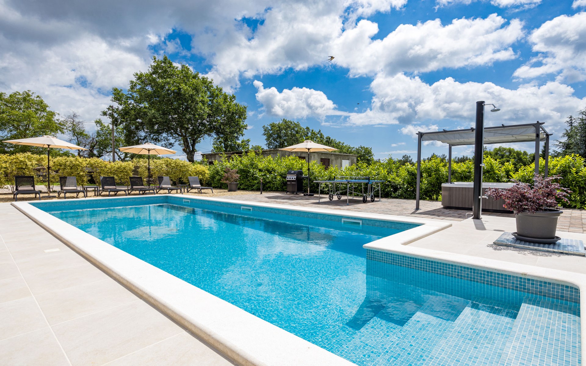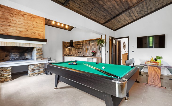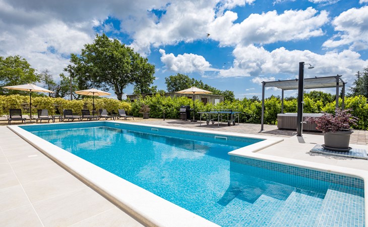 Very beautiful, luxurious single-family house "Villa Venezia". In the hamlet Markoci 6 km from the centre of Labin, 12 km from the centre of Rabac, in a quiet, sunny position, 12 km from the sea, in the countryside. Private: property 10'000 m2 with lawn and wildlife garden, swimming pool angular (40 m2, depth 140 cm, seasonal availability: 29.Mar. - 30.Oct.) with internal staircase. Outdoor shower, hot tub, table tennis, badminton, volleyball court, terrace, garden furniture, barbecue, pool maintenance by the owner/gardener. In the house: internet access, billiard table, washing machine. Parking (for 4 cars) at the house on the premises. Shop 1 km, supermarket 6 km, restaurant 1 km, bus stop 7.1 km, pebble beach 12 km. Please note: airfield 45 km from the property.