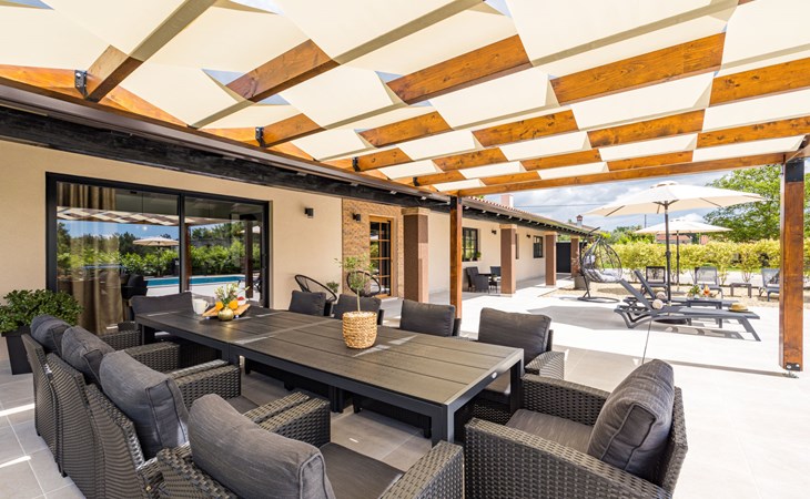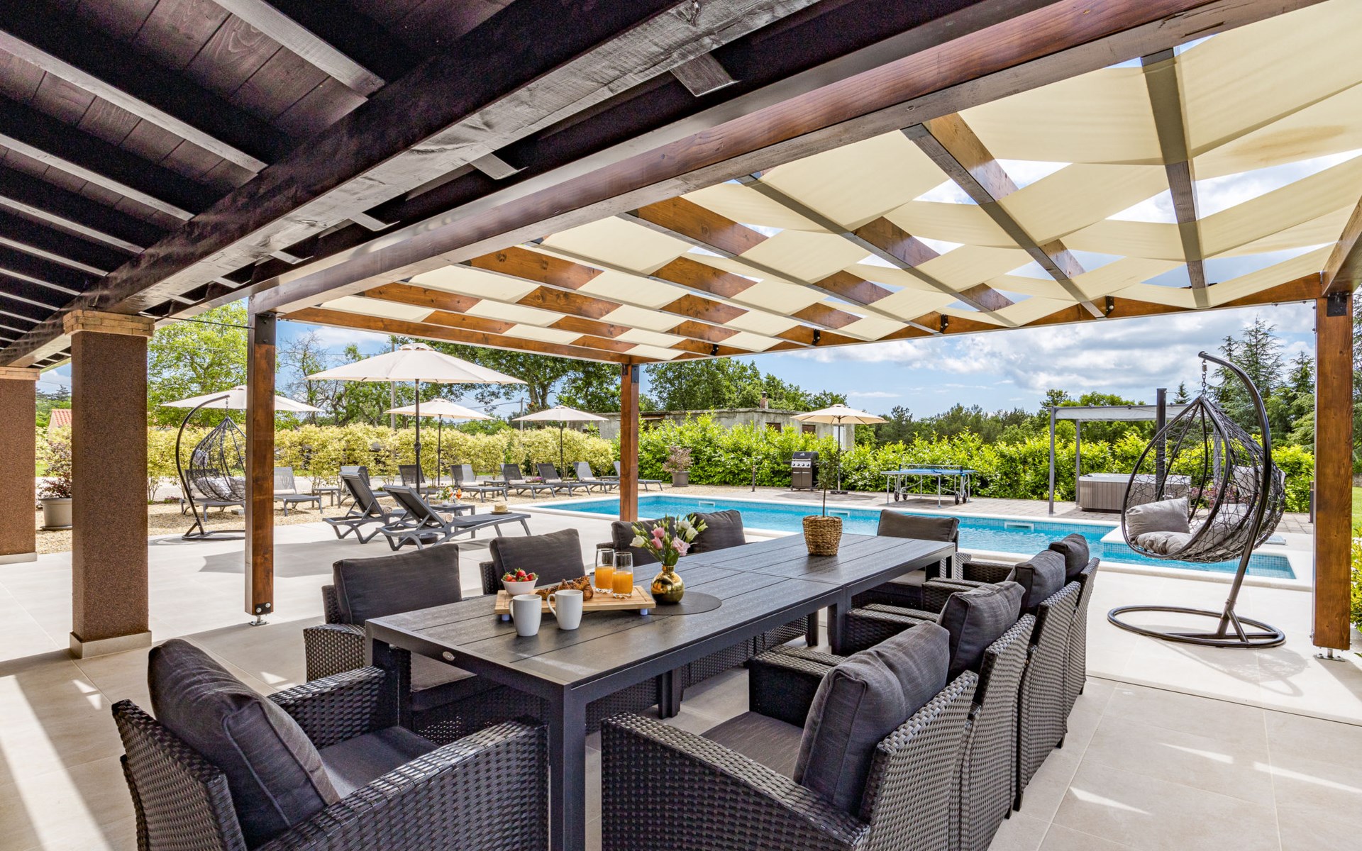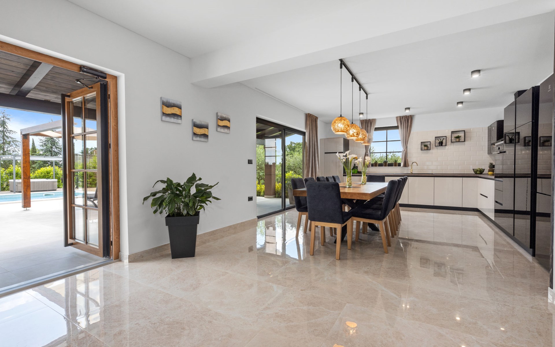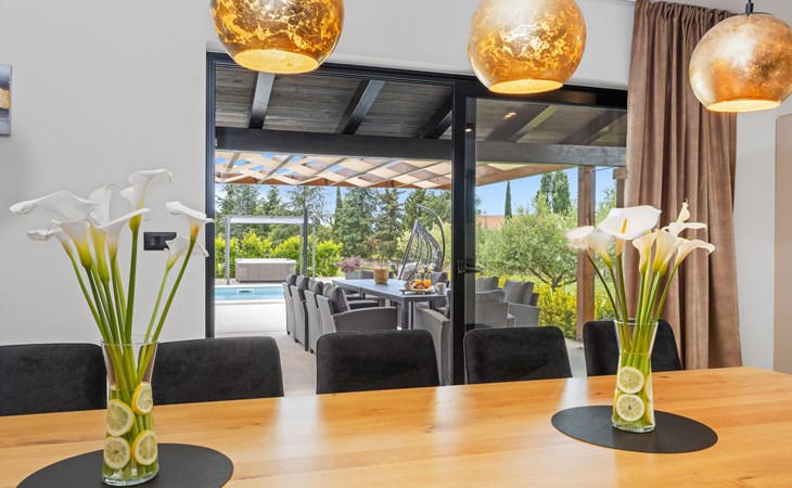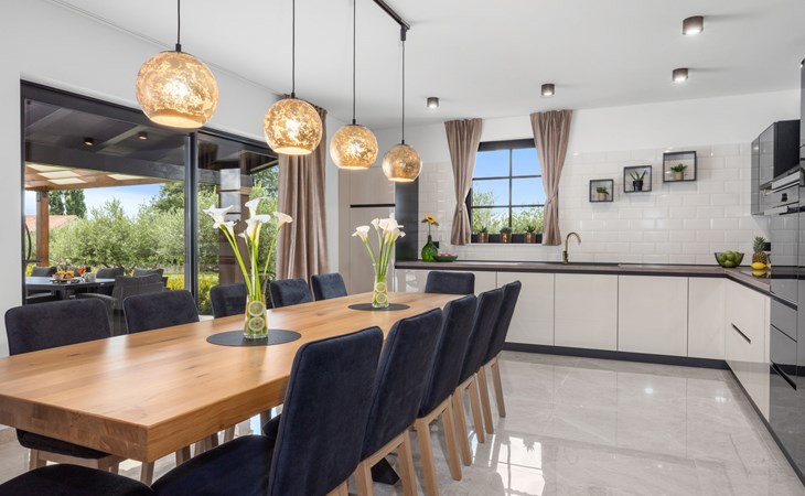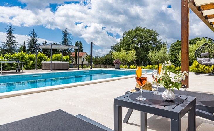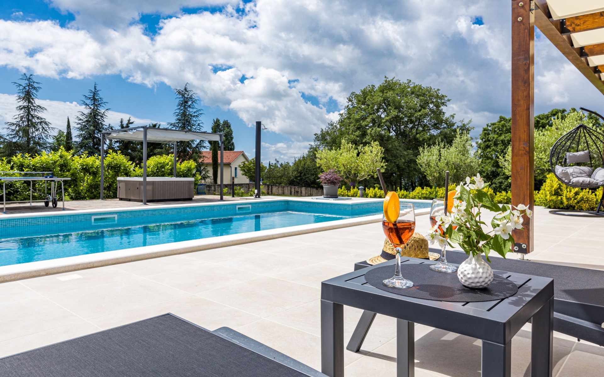 Very beautiful, luxurious single-family house "Villa Venezia". In the hamlet Markoci 6 km from the centre of Labin, 12 km from the centre of Rabac, in a quiet, sunny position, 12 km from the sea, in the countryside. Private: property 10'000 m2 with lawn and wildlife garden, swimming pool angular (40 m2, depth 140 cm, seasonal availability: 29.Mar. - 30.Oct.) with internal staircase. Outdoor shower, hot tub, table tennis, badminton, volleyball court, terrace, garden furniture, barbecue, pool maintenance by the owner/gardener. In the house: internet access, billiard table, washing machine. Parking (for 4 cars) at the house on the premises. Shop 1 km, supermarket 6 km, restaurant 1 km, bus stop 7.1 km, pebble beach 12 km. Please note: airfield 45 km from the property.