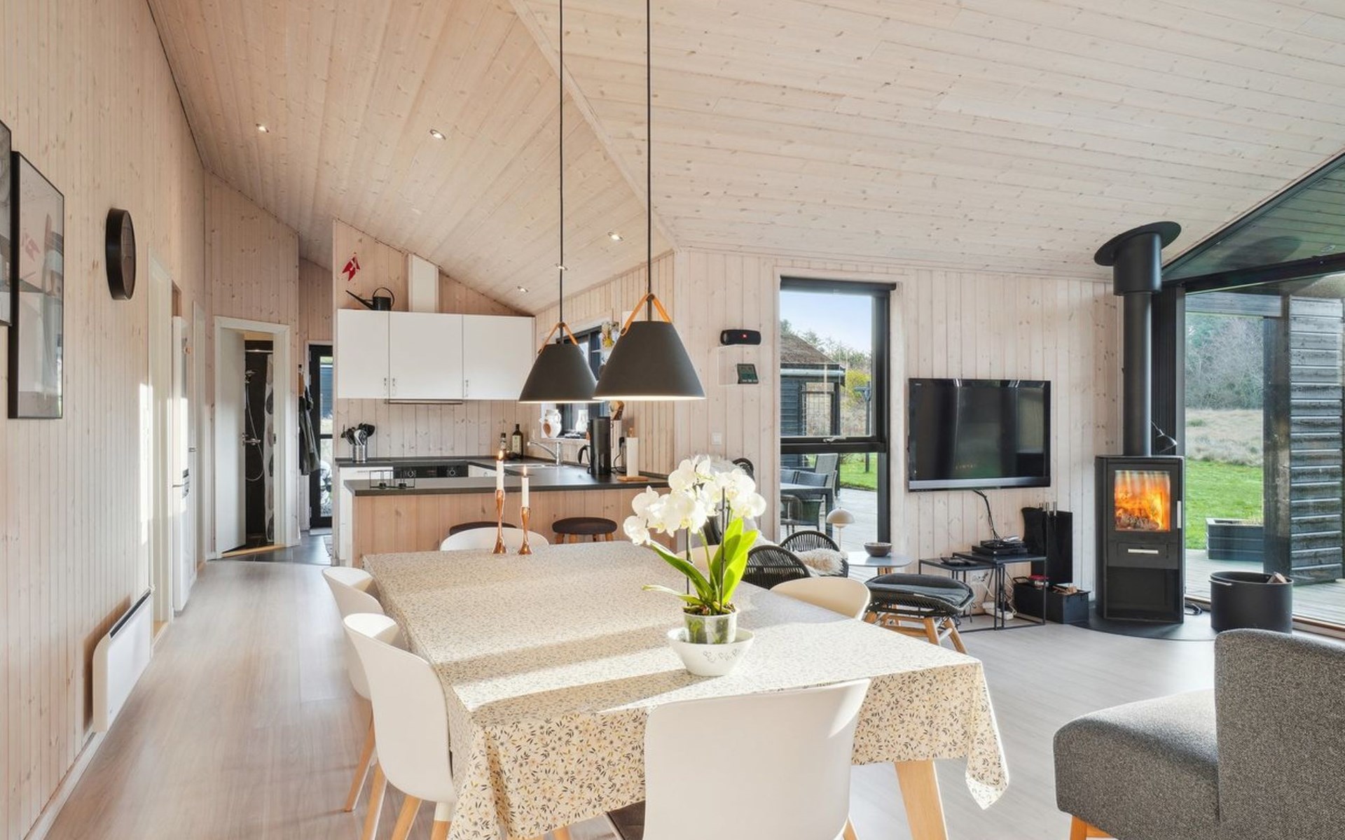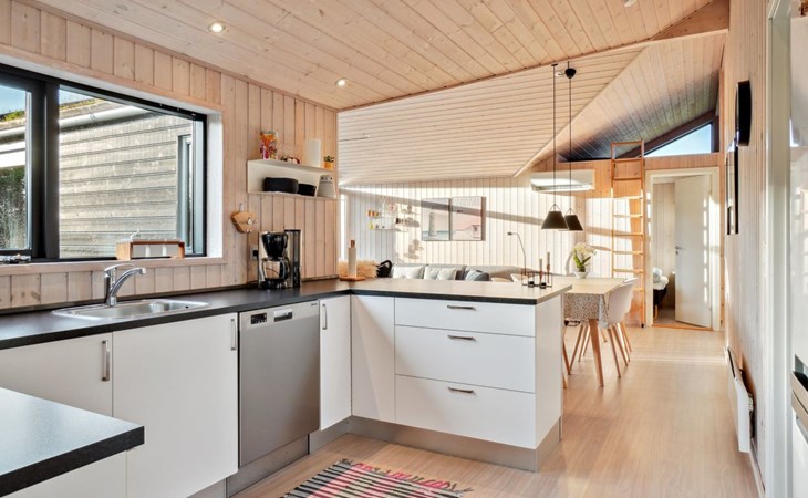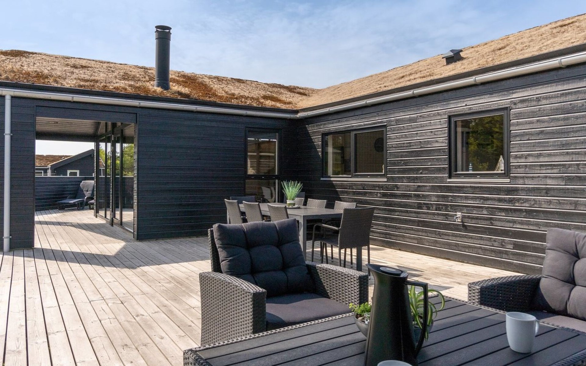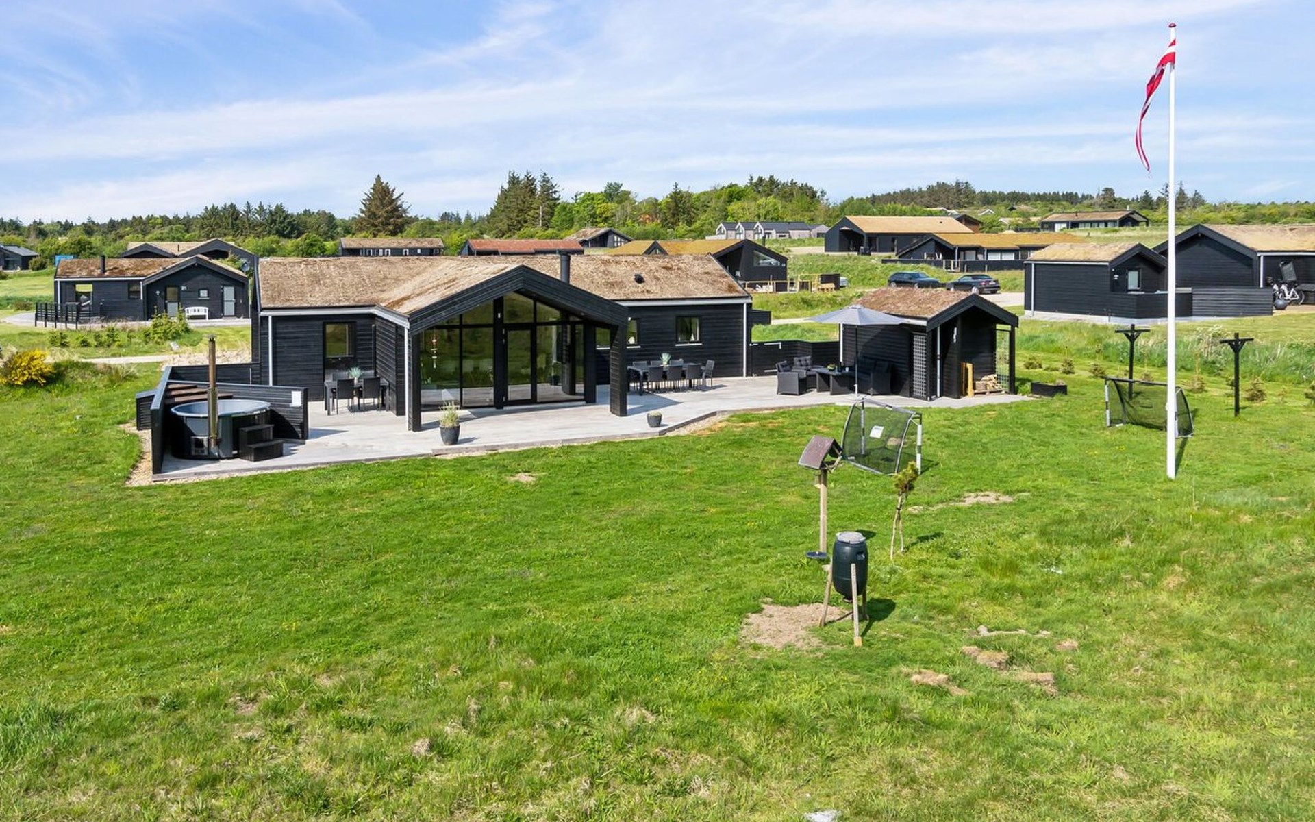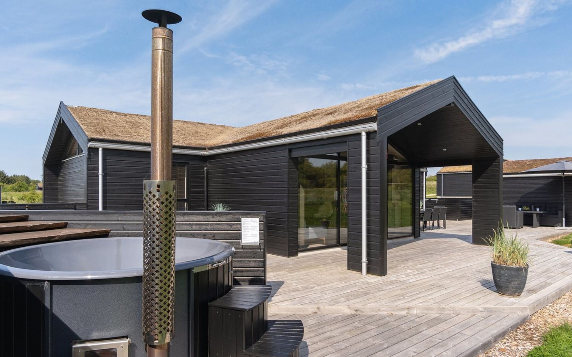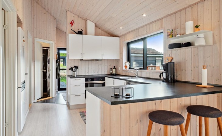 Single-family house, built in 2018. 1.5 km from the sea. Private: natural state property 1'300 m2. Terrace (90 m2), barbecue. In the house: sauna, washing machine, tumble dryer. Parking at the house. E-charging station. Grocery 1.8 km. Golf course 15 km. The owner does not accept any youth groups.
