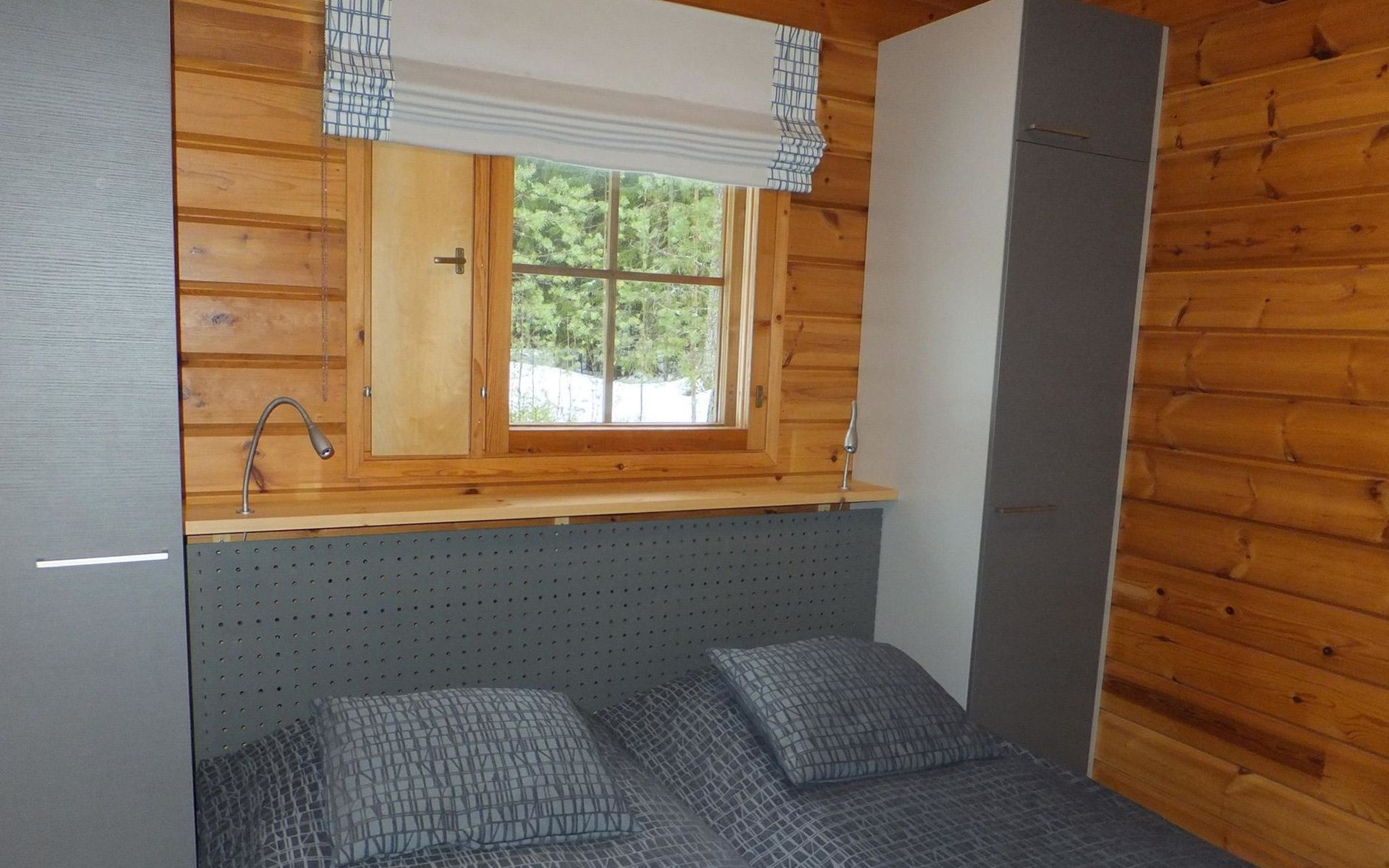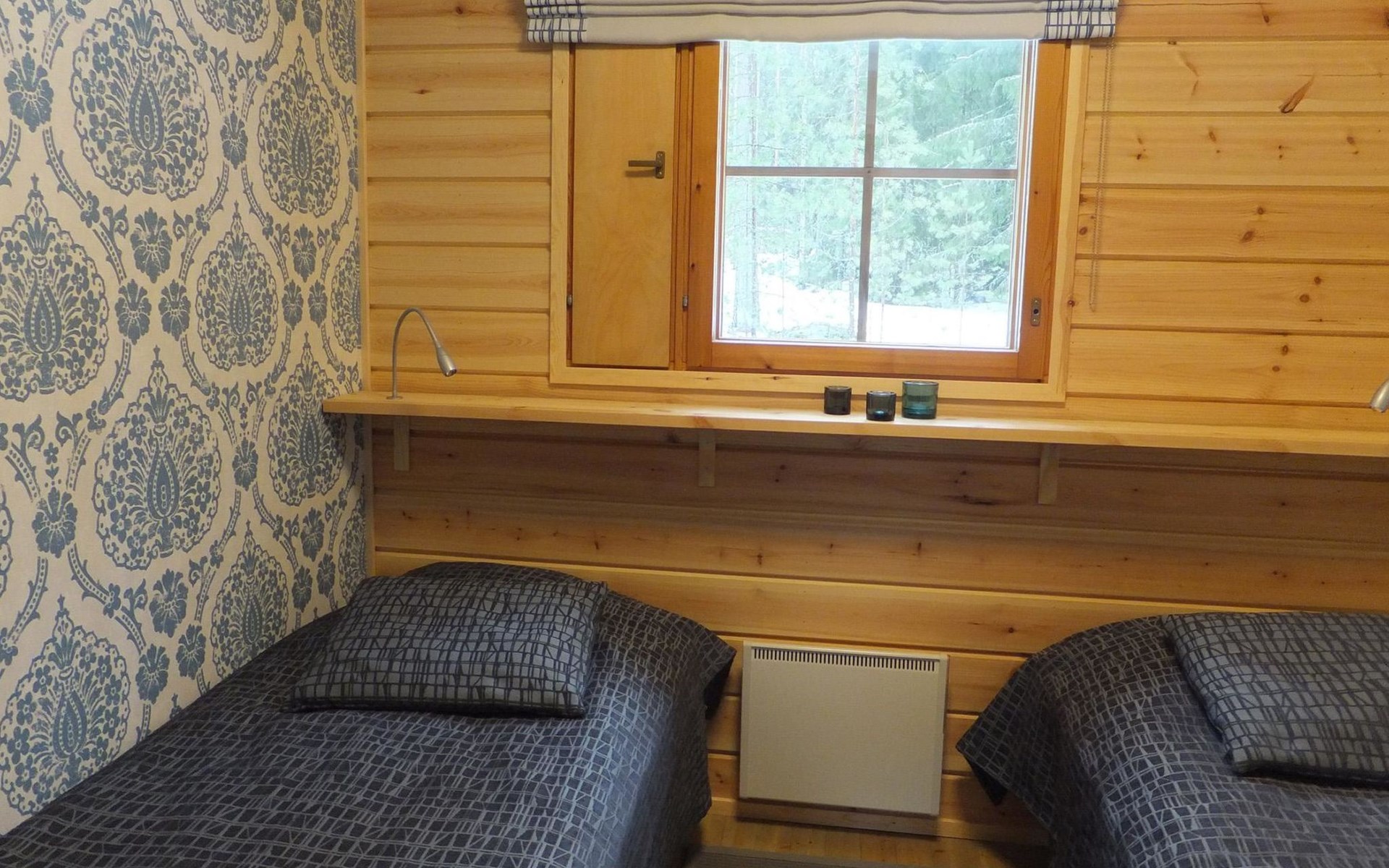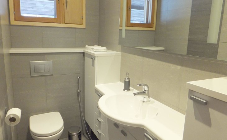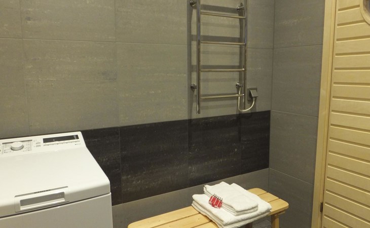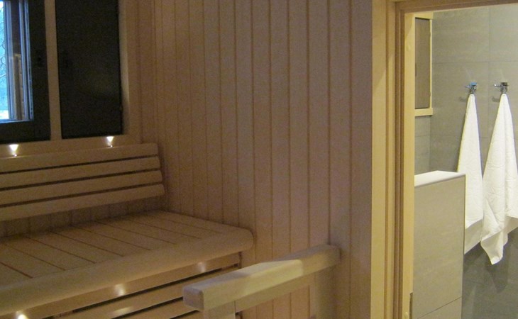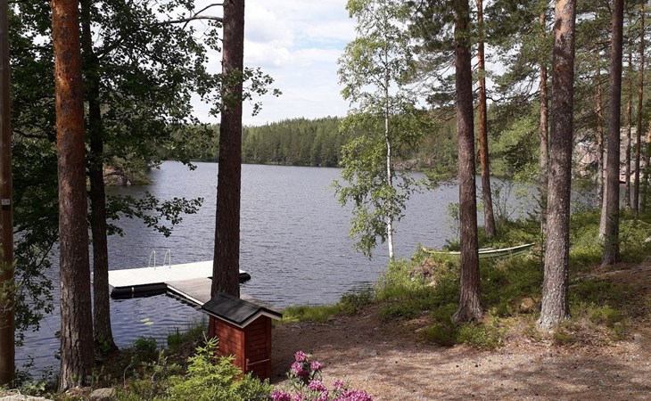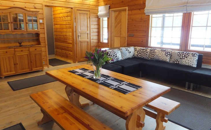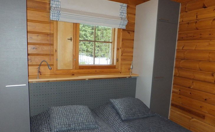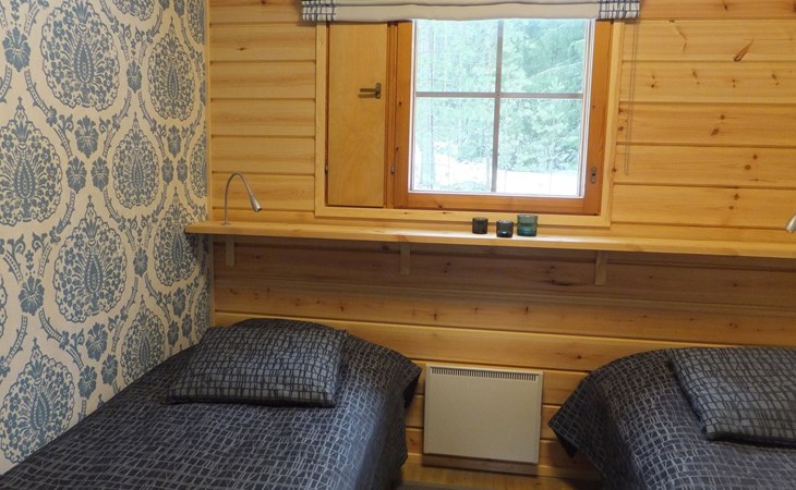 Log cabin 1983, renovated 2014, spacious living room-kitchen, bedroom (8 m²) with double bed 180x200 cm, bedroom (7 m²) with 2 beds á 90 x 200 cm, wood-fired sauna, washroom, dressing room, open veranda.