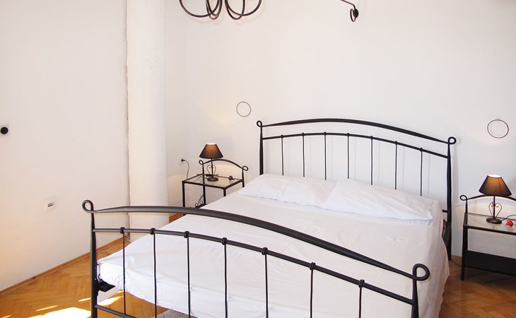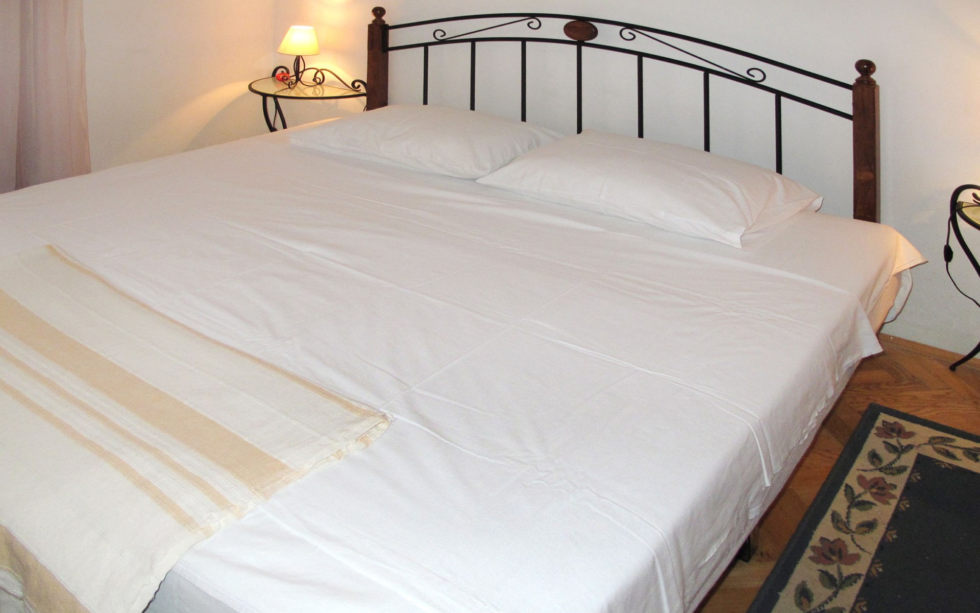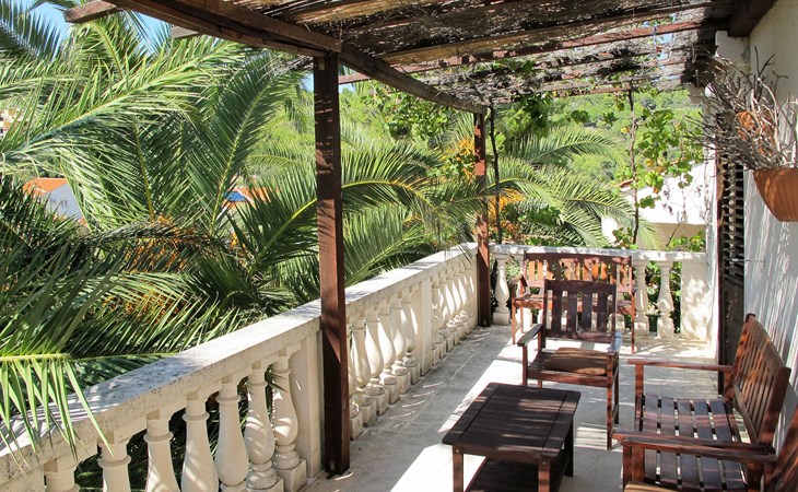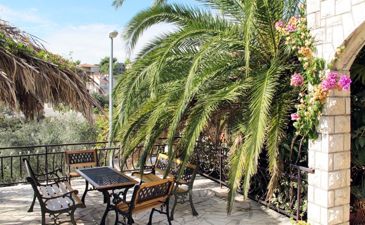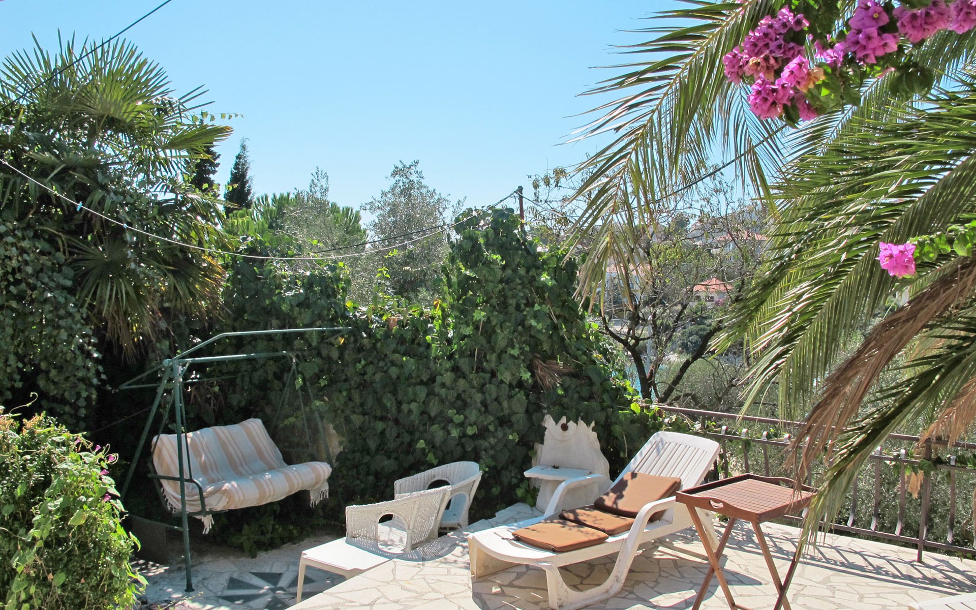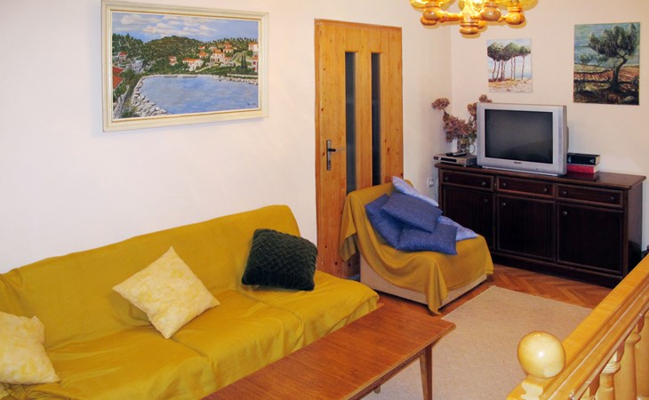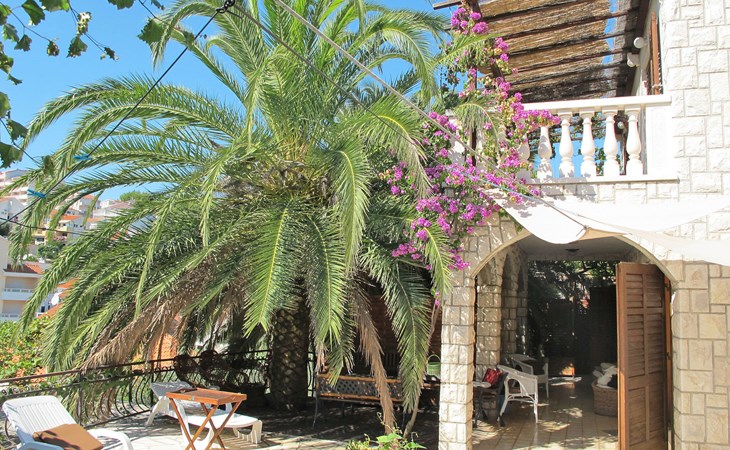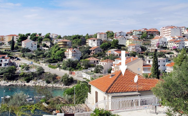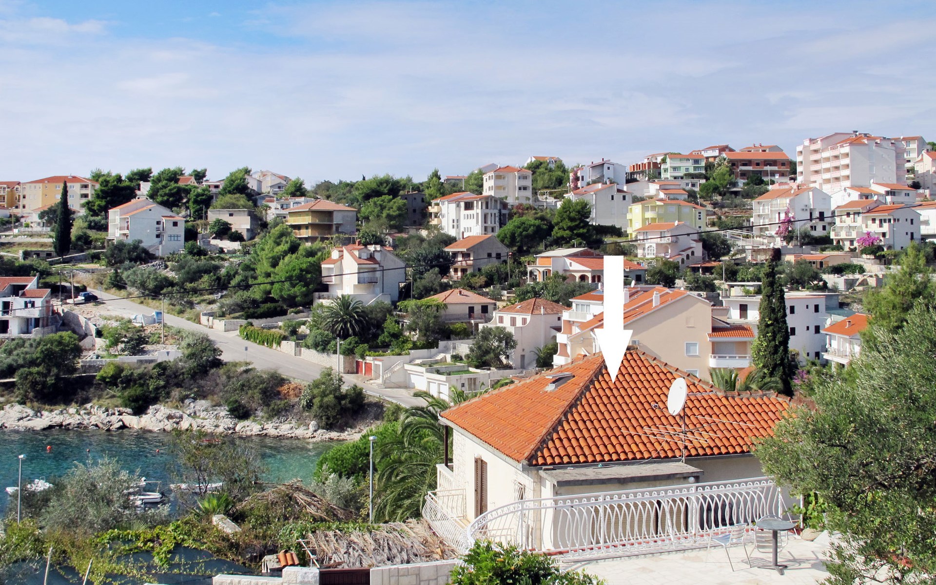 Okrug Gornji (Čiovo): Semi-detached house "Maja", 2 storeys. 1.5 km from the centre of Okrug Gornji, 6 km from the centre of Trogir, 100 m from the sea, 100 m from the beach. Private: property 450 m2 with wildlife garden. Terrace (30 m2), garden furniture, barbecue. In the house: internet access, washing machine (for shared use, extra). Parking (for 2 cars) on the premises. Shop 500 m, bus stop 1.4 km, pebble beach 100 m. Please note: airfield 10 km from the property.