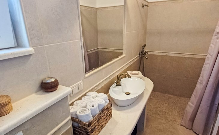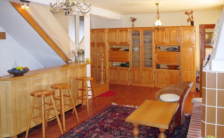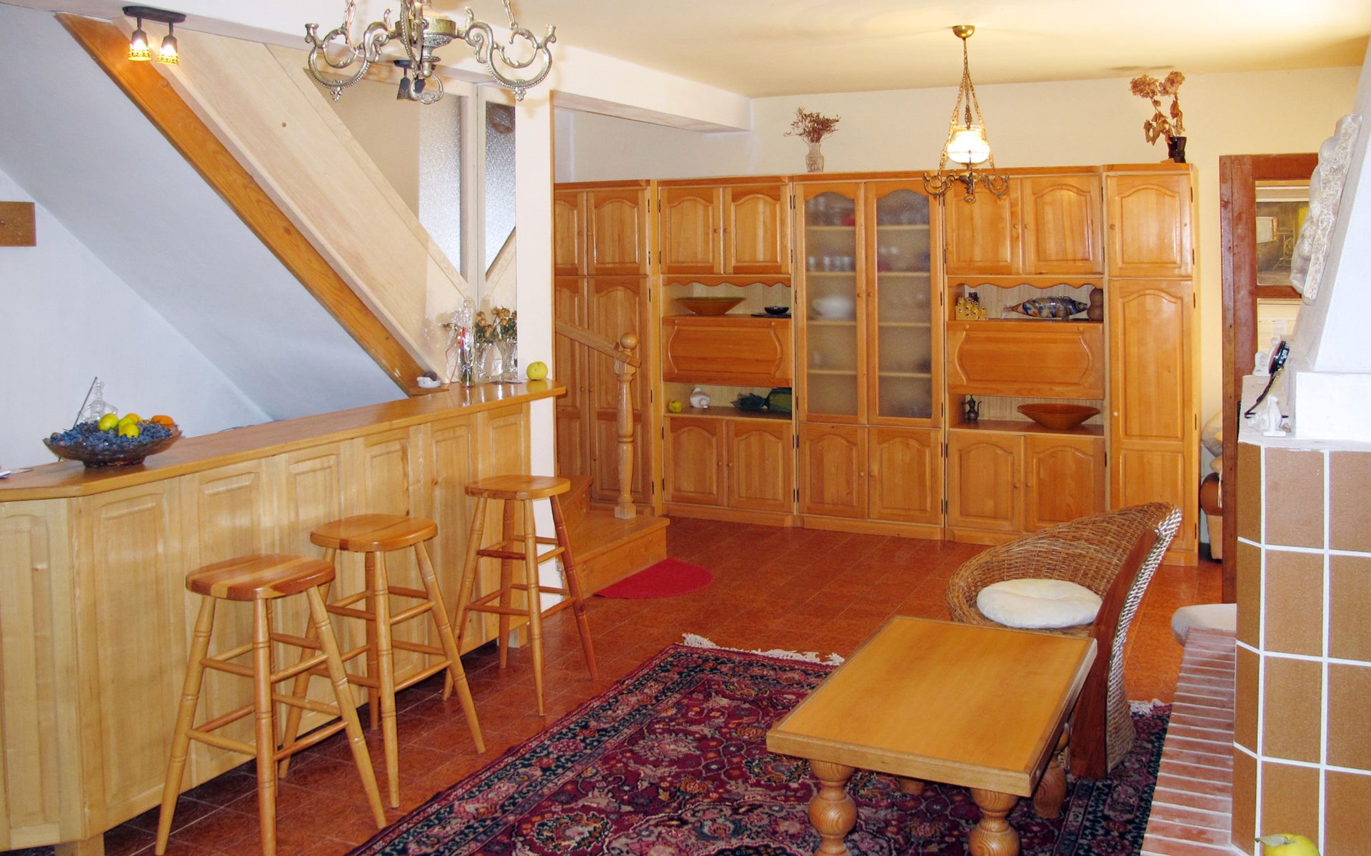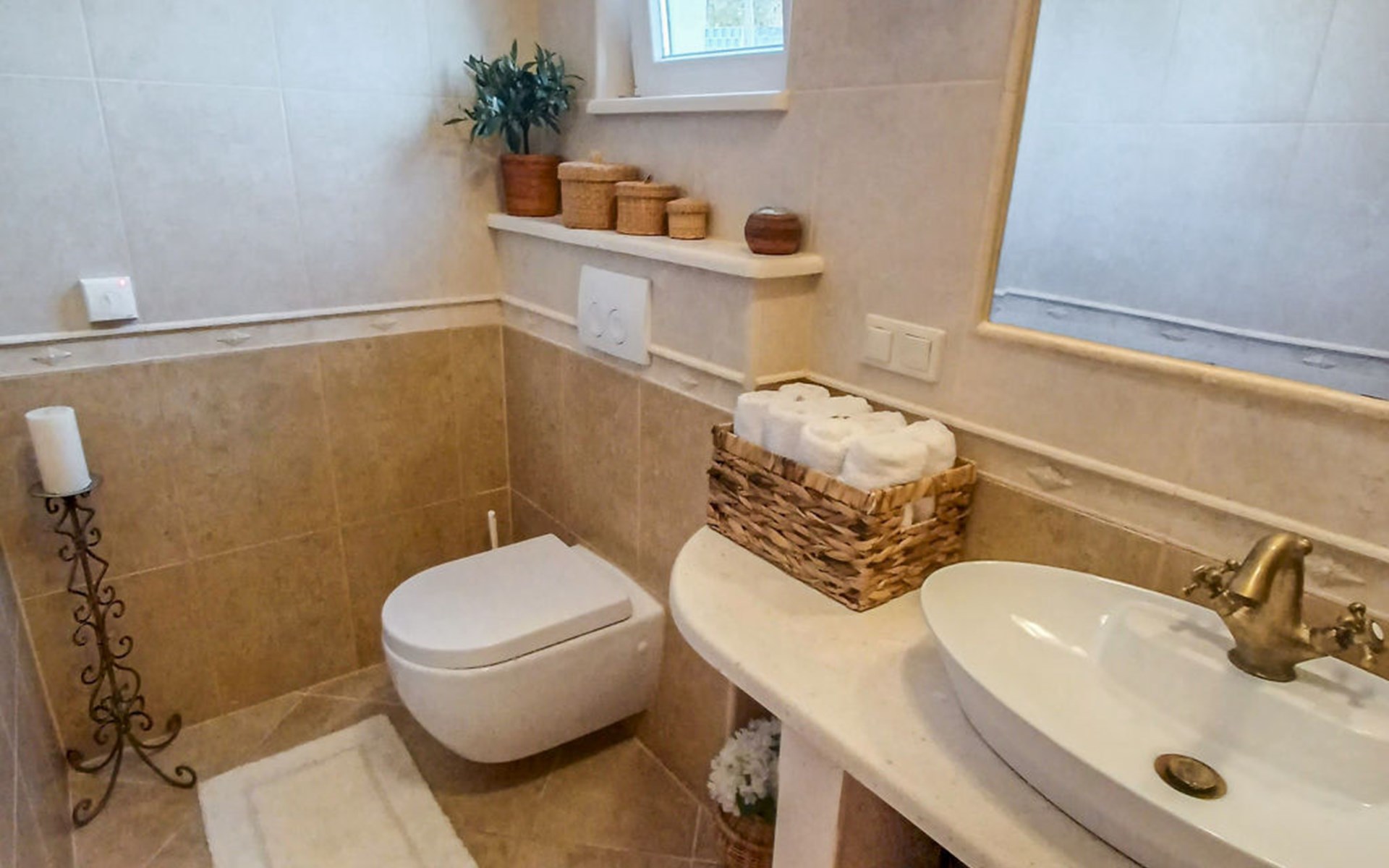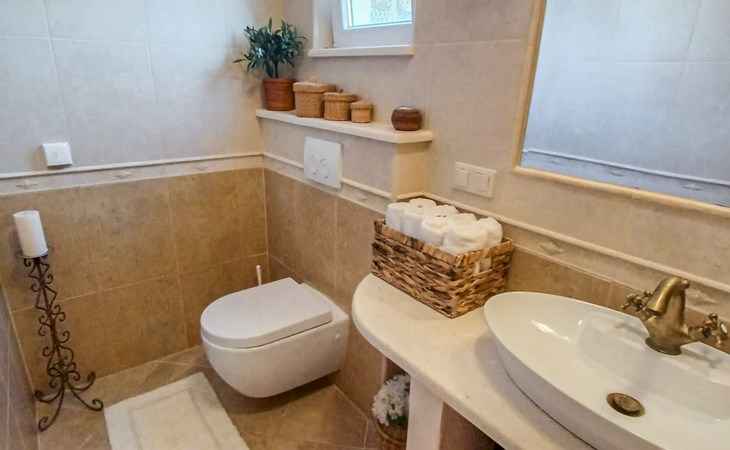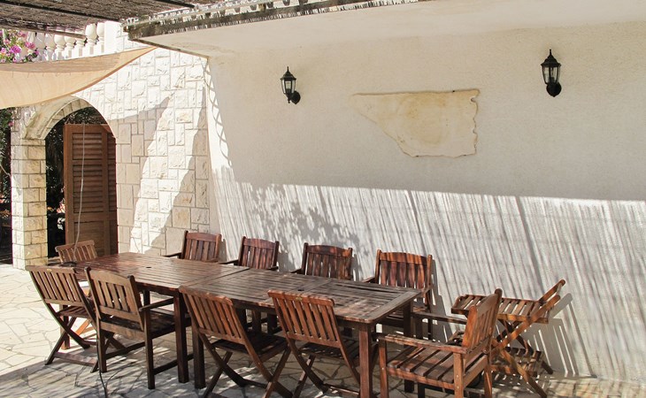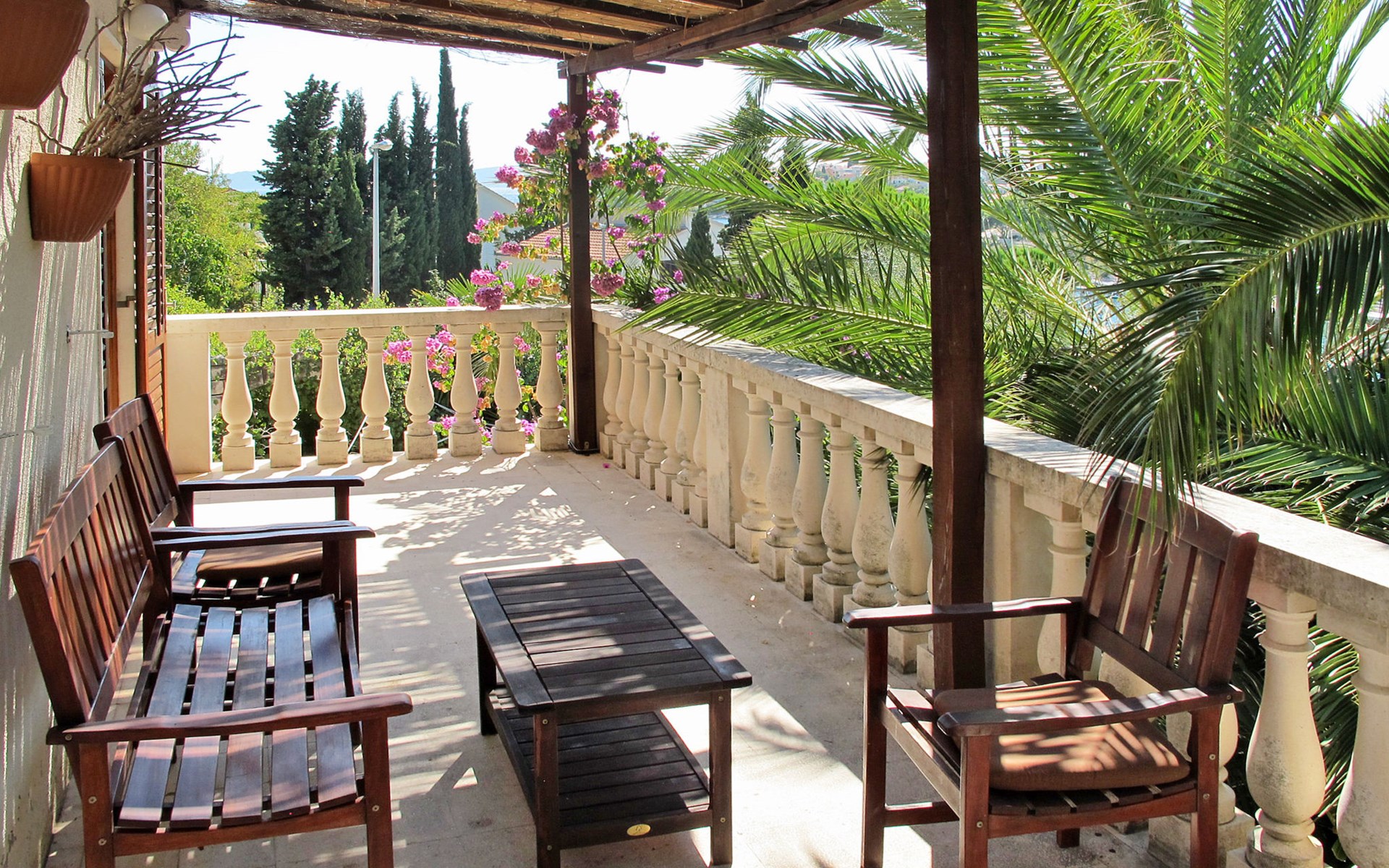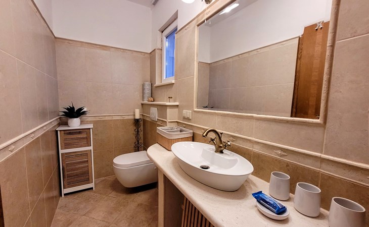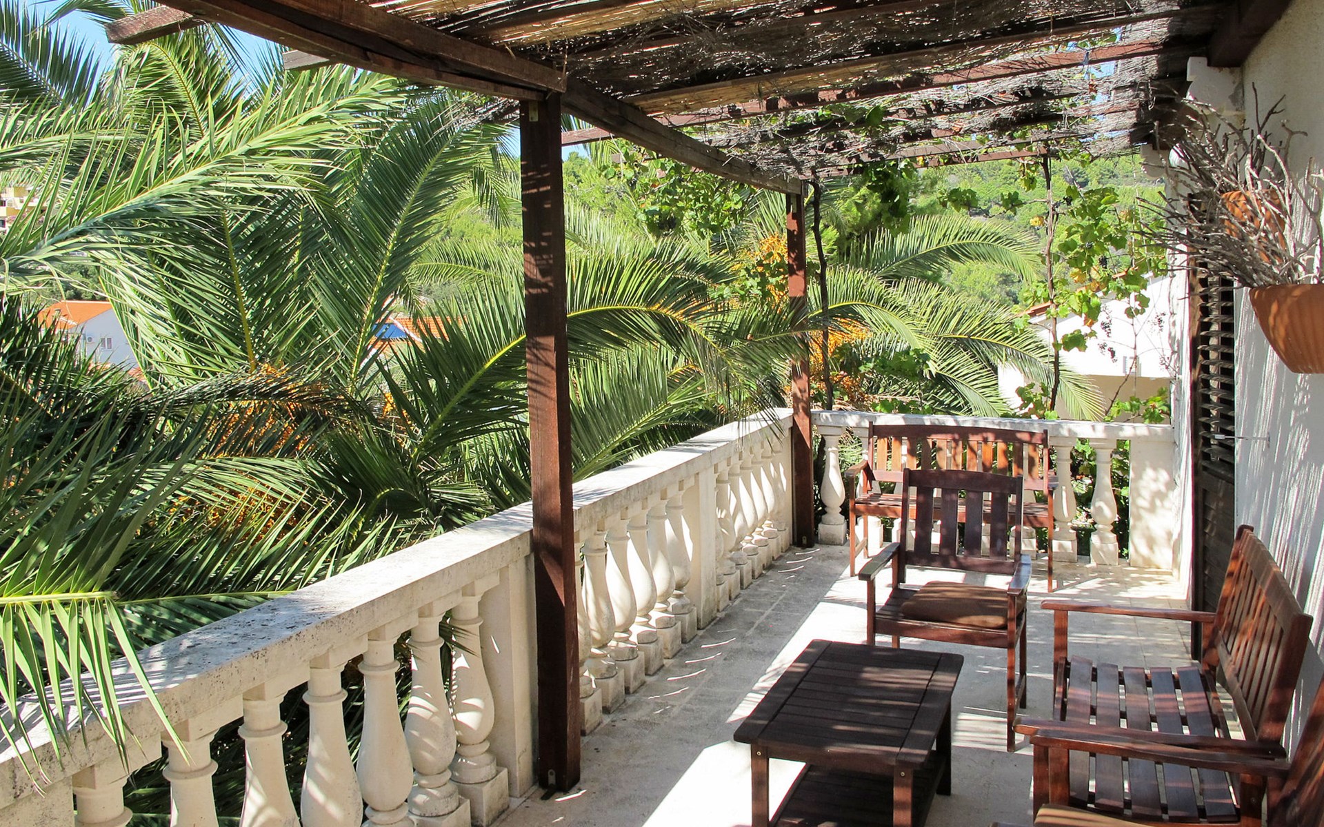 Okrug Gornji (Čiovo): Semi-detached house "Maja", 2 storeys. 1.5 km from the centre of Okrug Gornji, 6 km from the centre of Trogir, 100 m from the sea, 100 m from the beach. Private: property 450 m2 with wildlife garden. Terrace (30 m2), garden furniture, barbecue. In the house: internet access, washing machine (for shared use, extra). Parking (for 2 cars) on the premises. Shop 500 m, bus stop 1.4 km, pebble beach 100 m. Please note: airfield 10 km from the property.