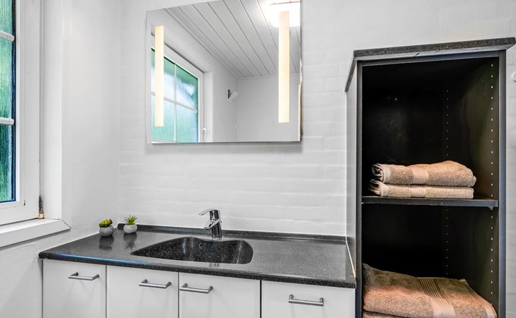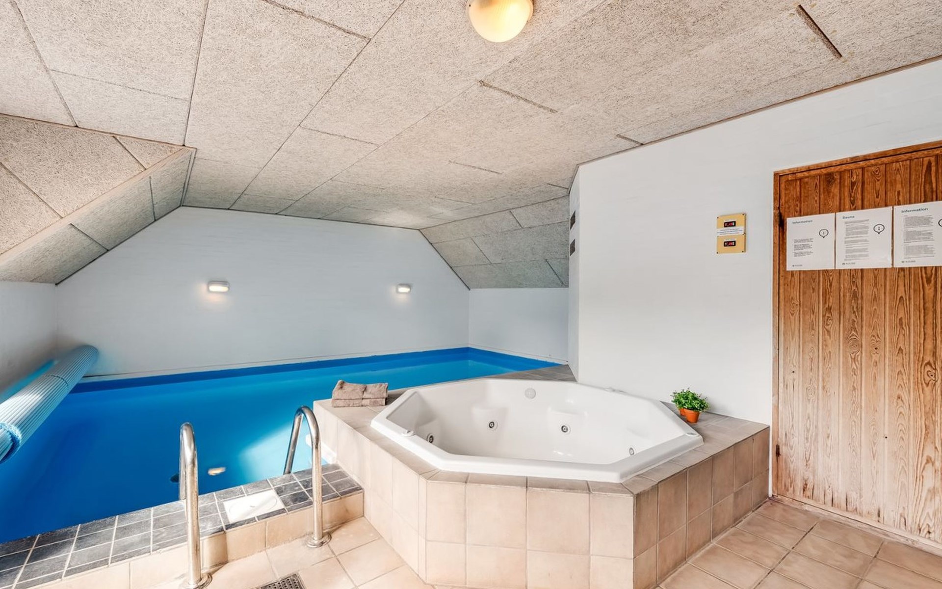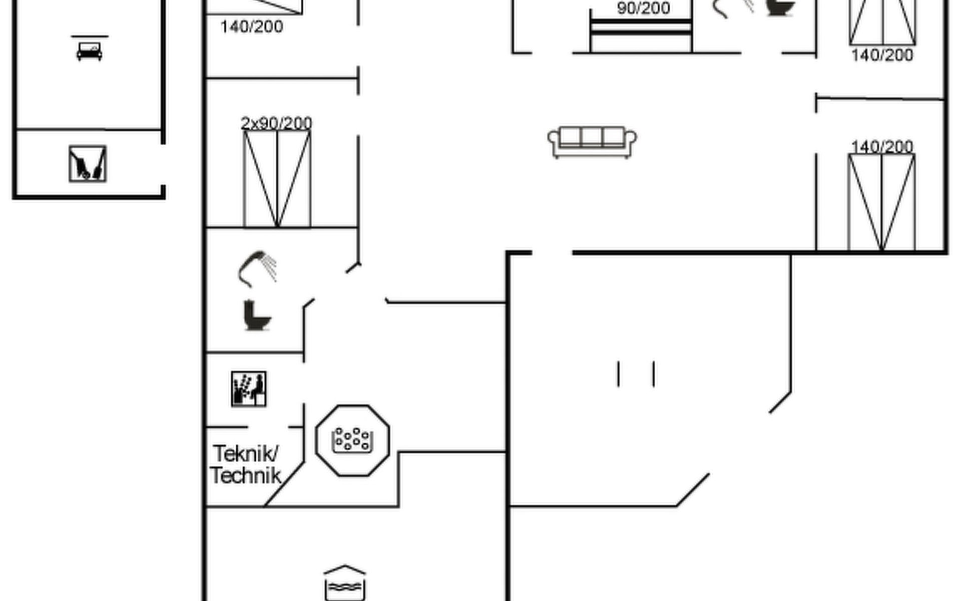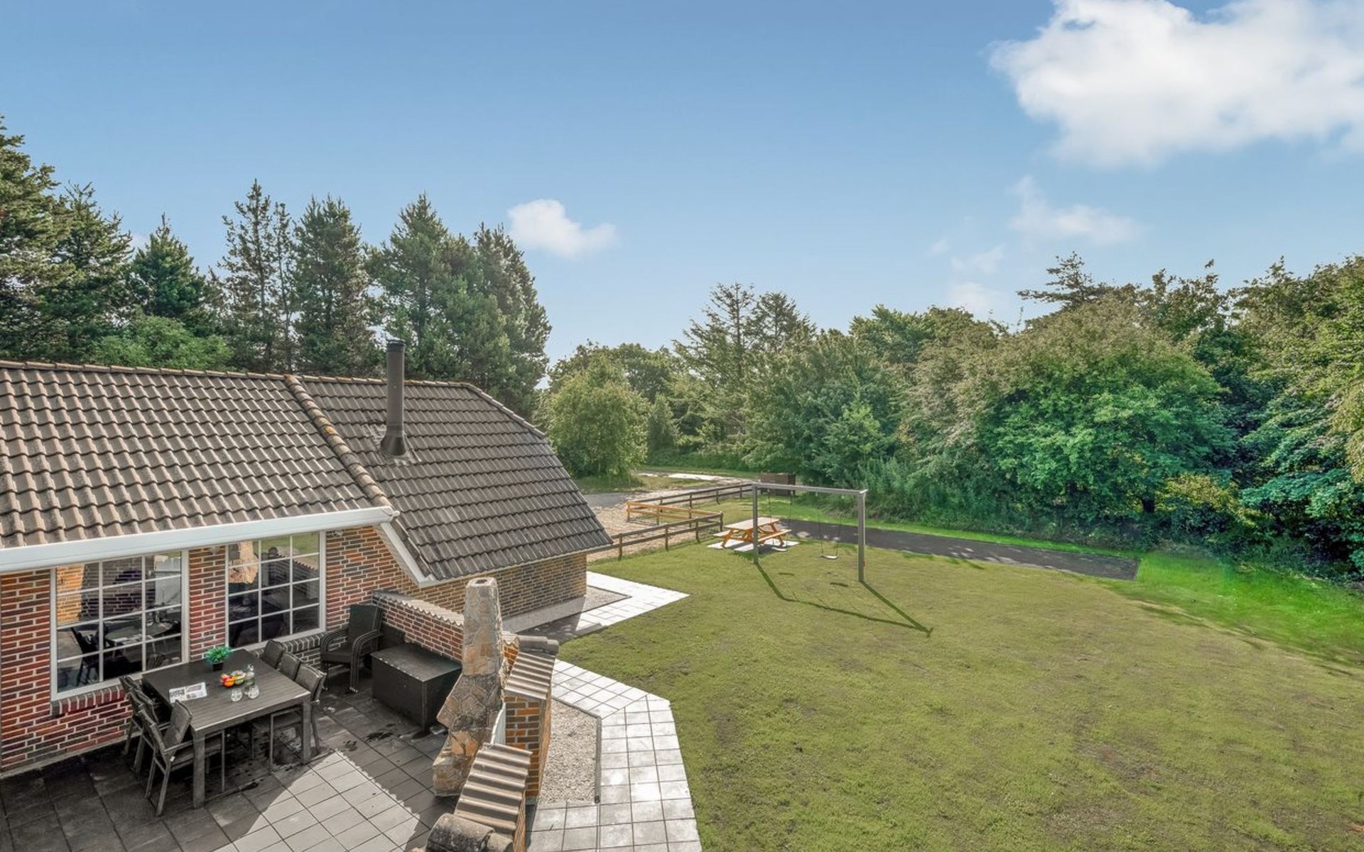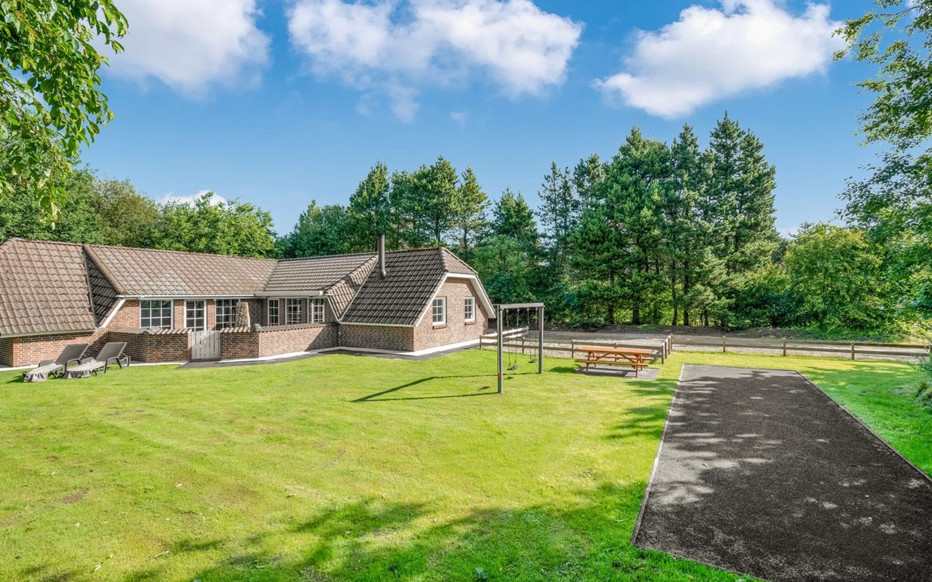 Single-family house, built in 1992. 10.5 km from the sea. Private: natural state property 1'567 m2, indoor pool (4 x 5 m, 2'3.6 m2, depth 130 - 130 cm). Terrace (50 m2), fireplace, children's playground (swing). In the house: sauna, washing machine, tumble dryer. Parking at the house. Carport. E-charging station. Grocery 500 m. The owner does not accept any youth groups.