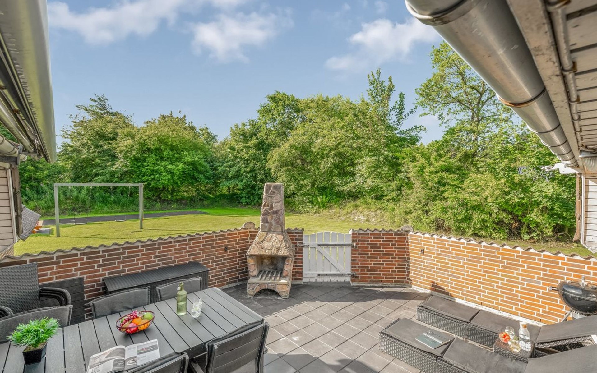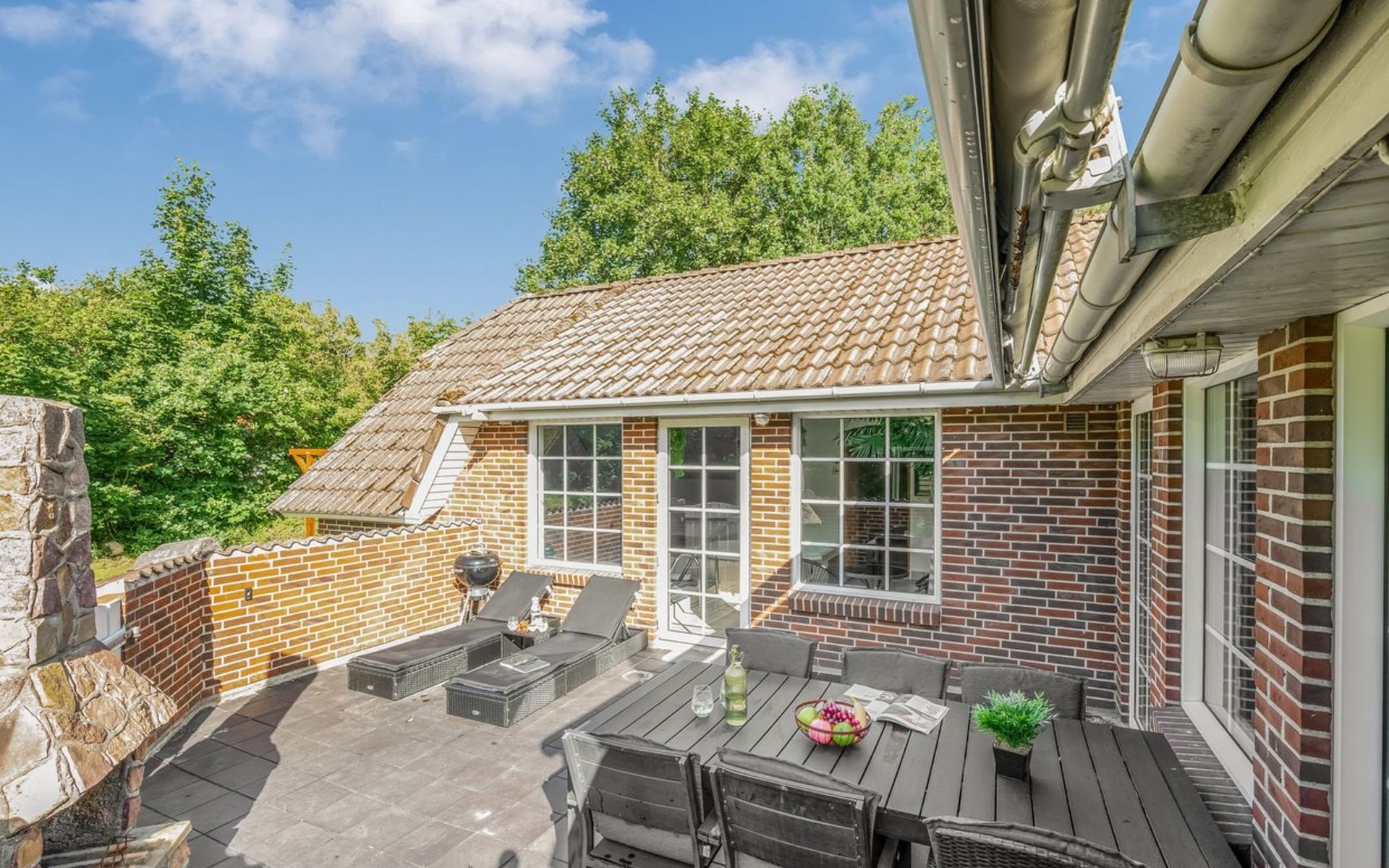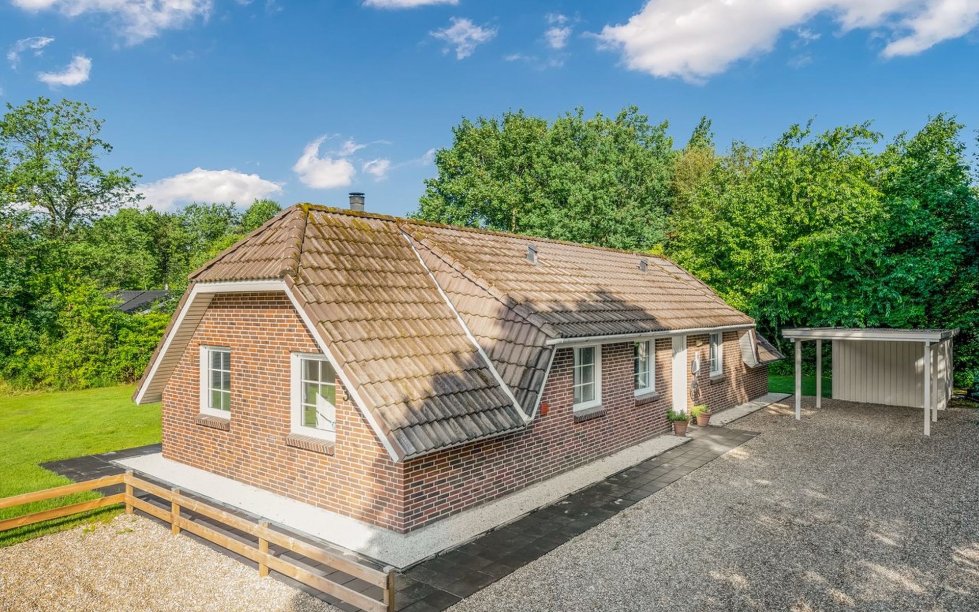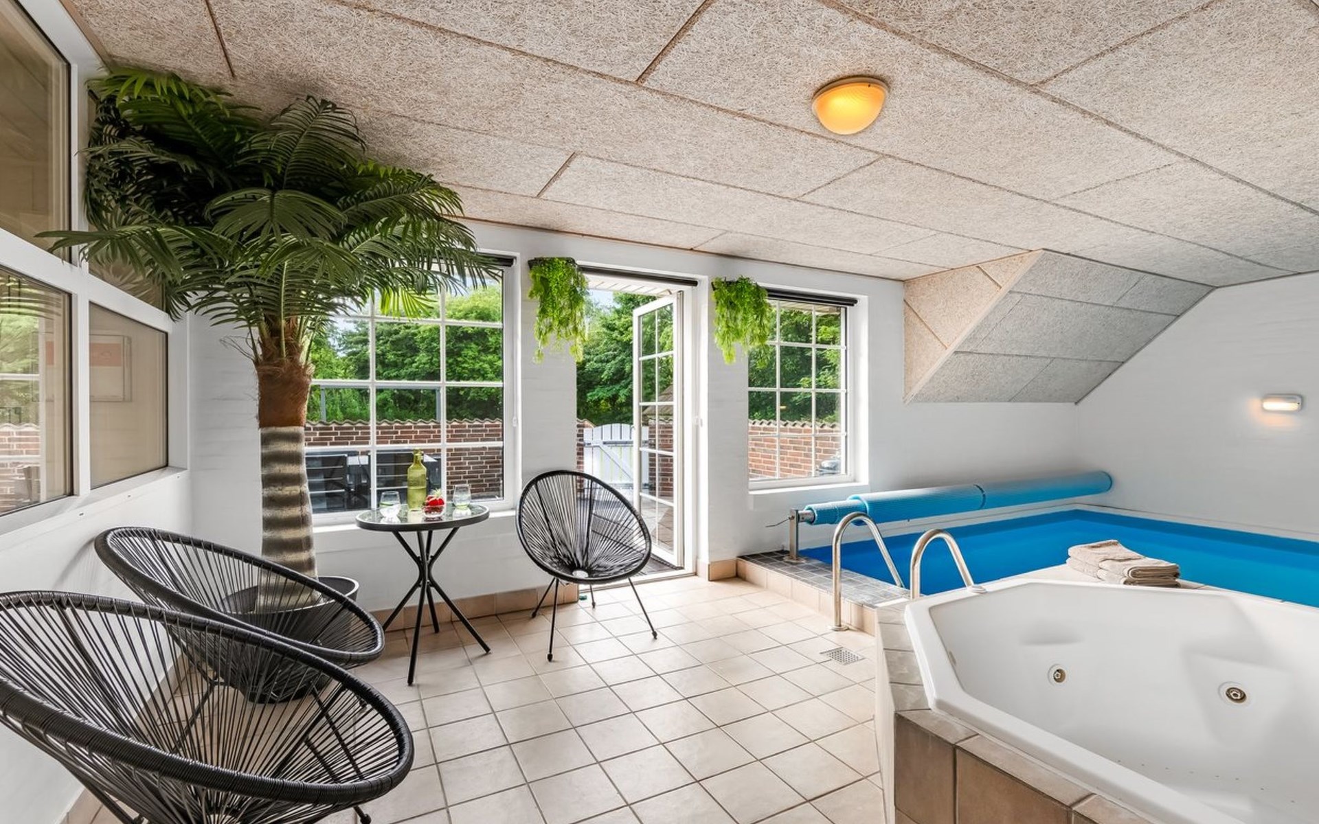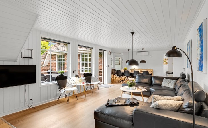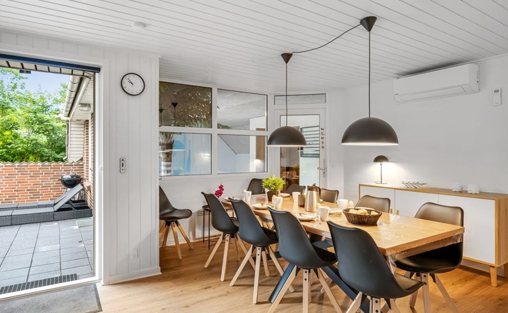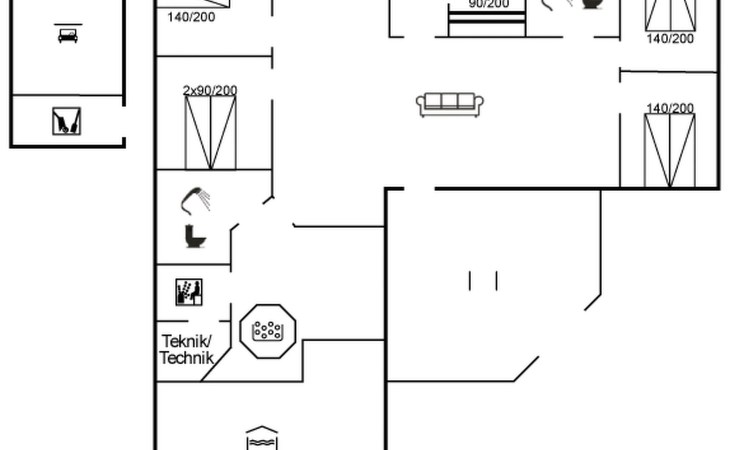 Single-family house, built in 1992. 10.5 km from the sea. Private: natural state property 1'567 m2, indoor pool (4 x 5 m, 2'3.6 m2, depth 130 - 130 cm). Terrace (50 m2), fireplace, children's playground (swing). In the house: sauna, washing machine, tumble dryer. Parking at the house. Carport. E-charging station. Grocery 500 m. The owner does not accept any youth groups.