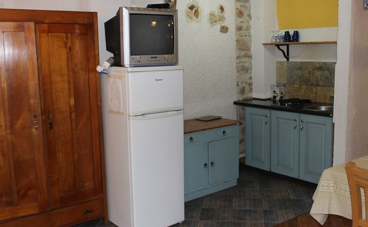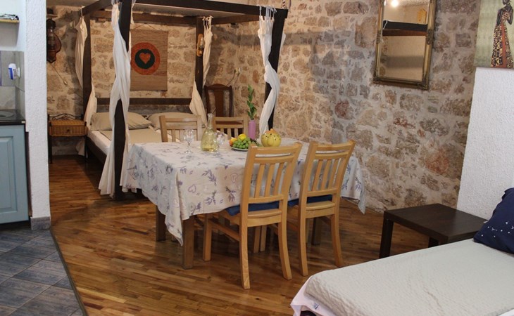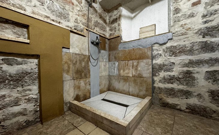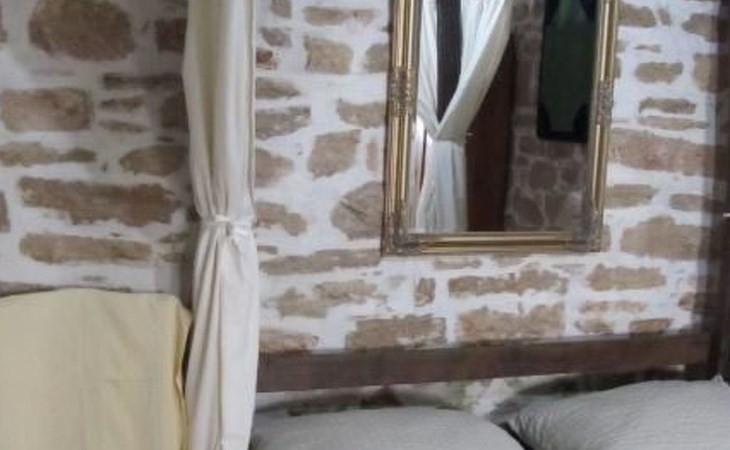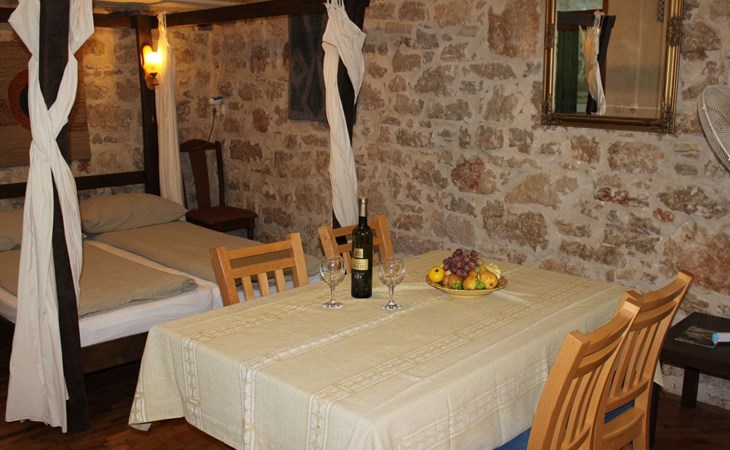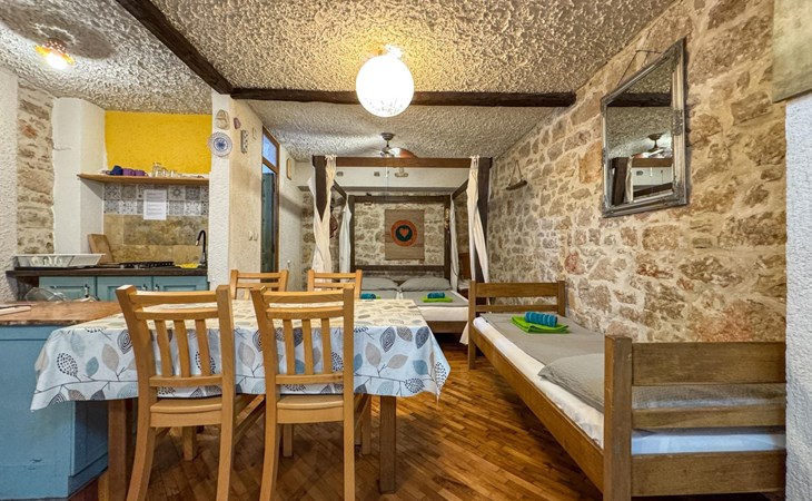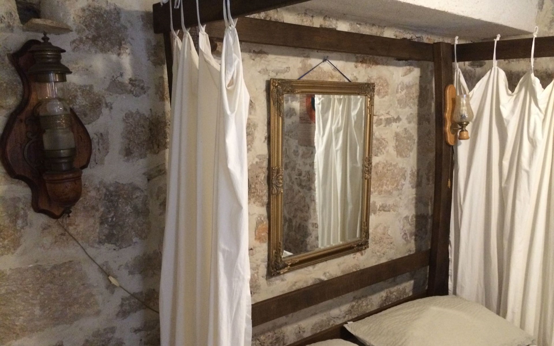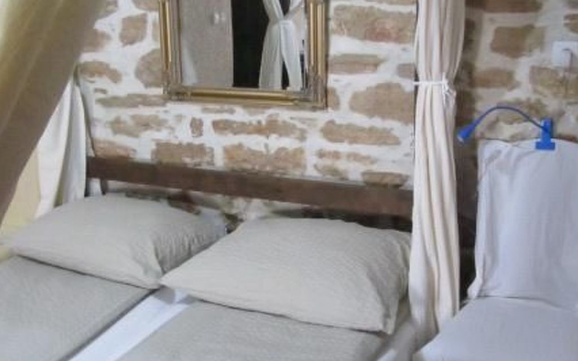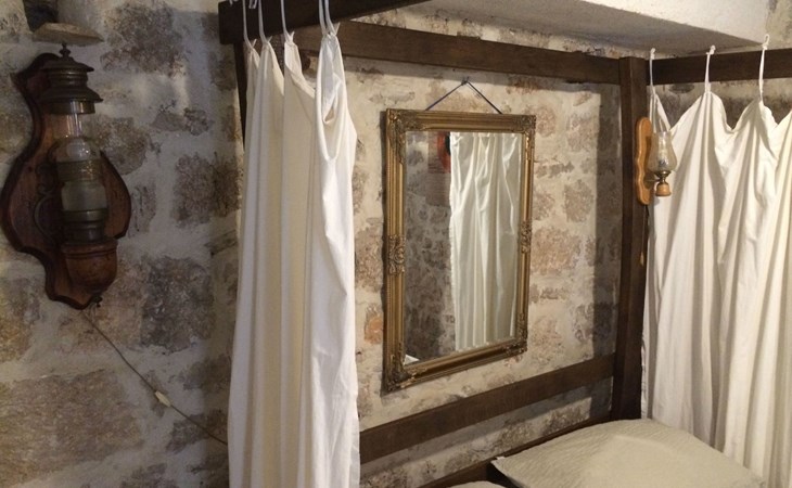 Inside, you will find a large living space divided into various alcoves, including a sleeping alcove with an exquisite four-poster bed made from historic oak beams (160 cm x 200 cm, two ergonomic mattresses, bed linen), which ensures a restful night's sleep. The integrated kitchenette is equipped with everything you need (crockery, fridge with freezer compartment, cooker and basic cooking spices) to prepare culinary delights. An antique wardrobe and selected antiques add a special touch to the living area, while the convertible couch can comfortably accommodate additional guests. The bathroom has a modern design with shower, towels and WC, while air conditioning, WLAN and satellite TV provide additional comfort.