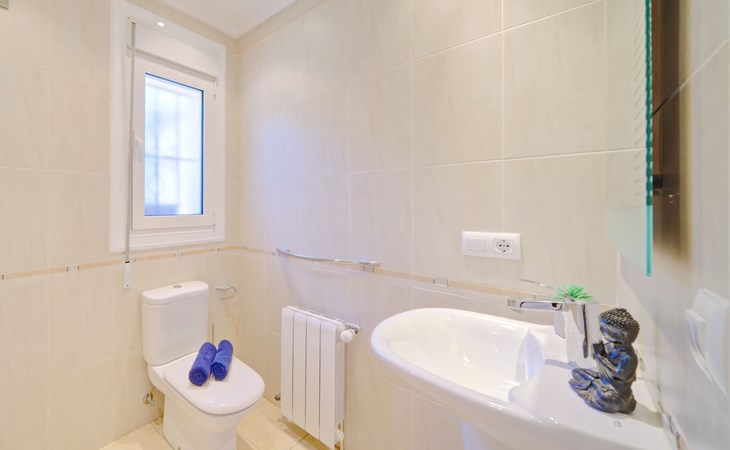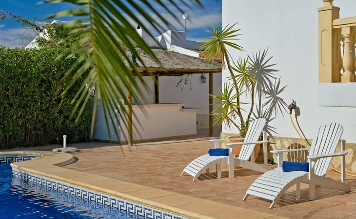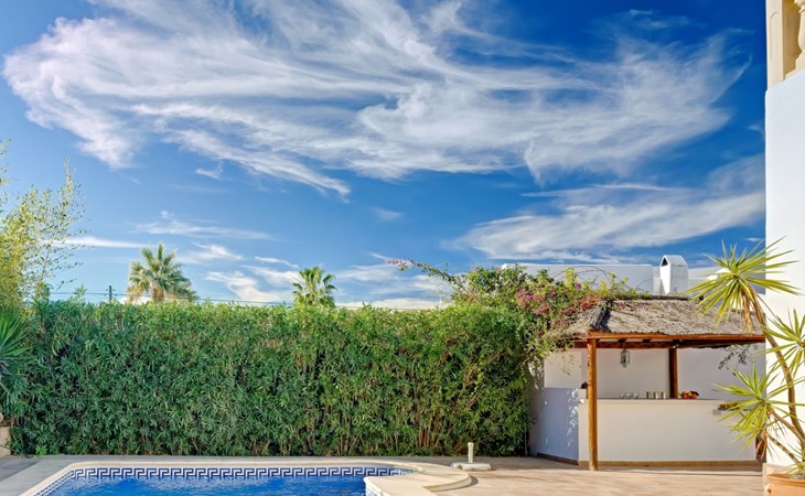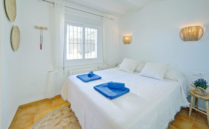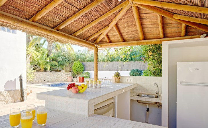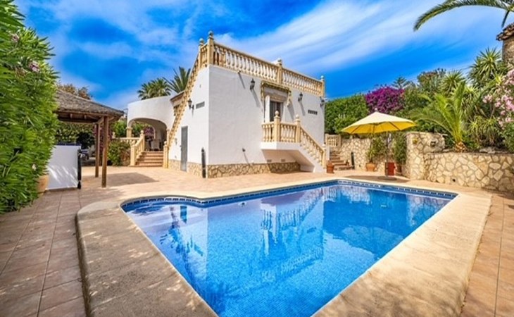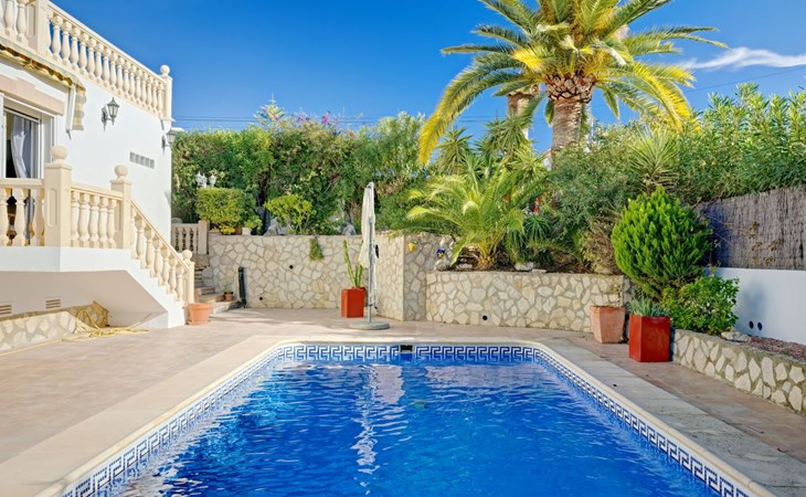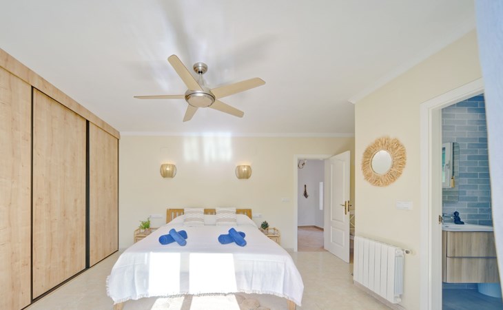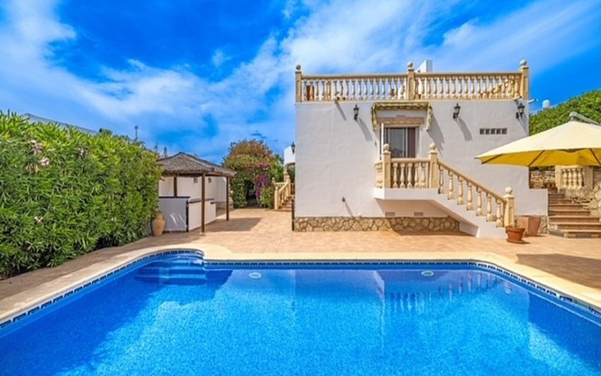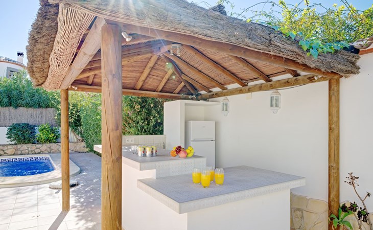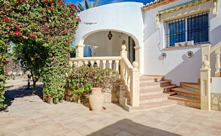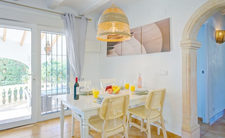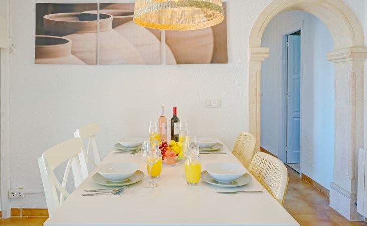 Very large, very beautiful, comfortable house "El Rinco de la Felicidad". In the district of Pinosol, in a quiet, sunny position, 2.4 km from the sea, 2.4 km from the beach. Private: swimming pool angular (8 x 4 m, depth 40 - 250 cm, seasonal availability: 01.Jan. - 31.Dec.) with internal staircase. Pergola, garden furniture, barbecue, roofed, parking. Supermarket 1.4 km, restaurant 350 m, bar 400 m, café 450 m, bus stop "Parada antiguo Mas y Mas" 1.8 km, sandy beach "El Arenal" 2.2 km, rocky beach "Cala Blanca" 3 km. Sports harbour 2.6 km, surf school 2.5 km, sailing school 2.6 km, tennis 2.5 km. The owner does not accept any youth groups.