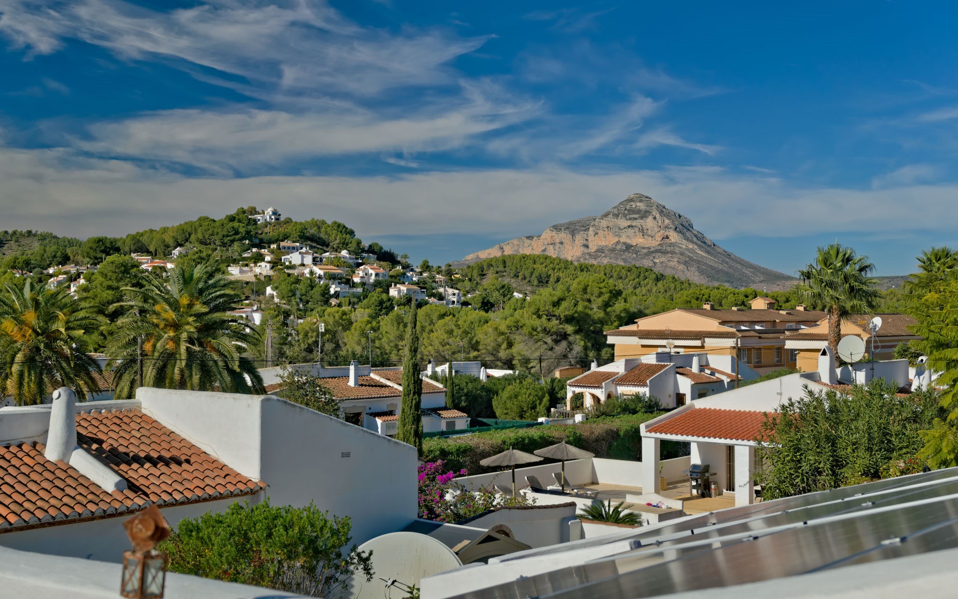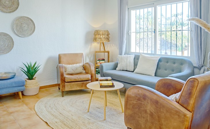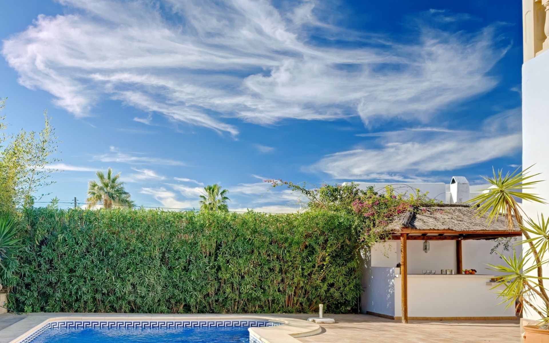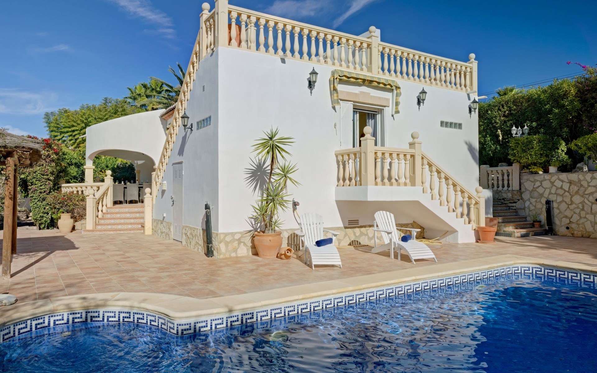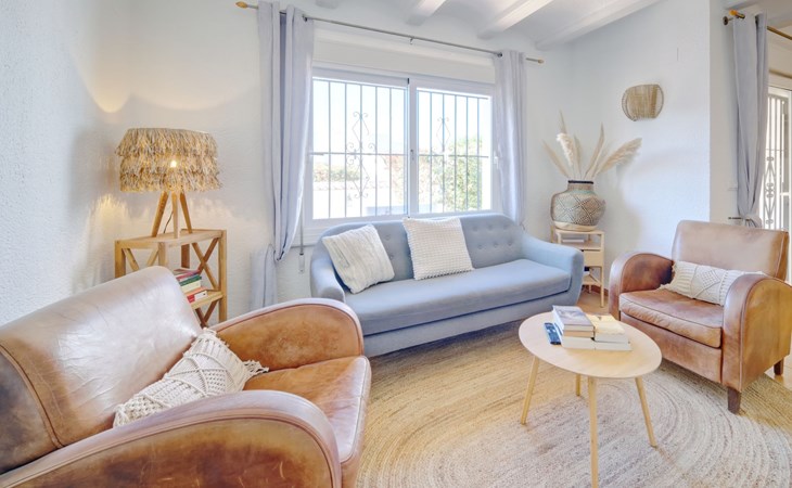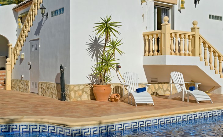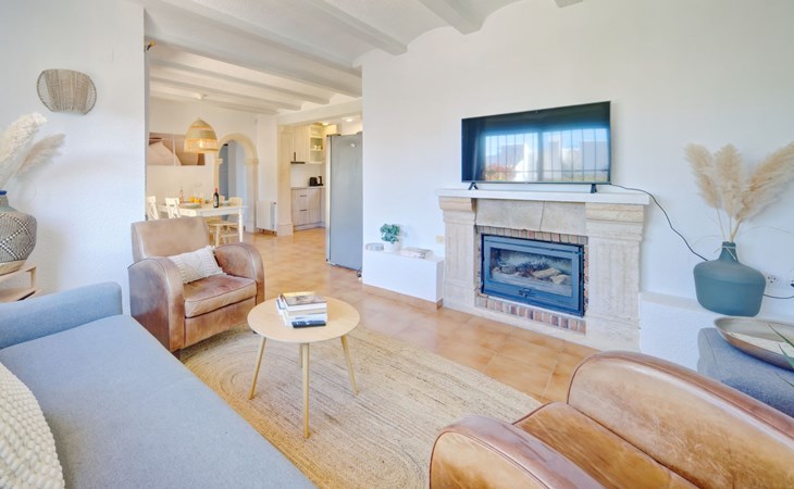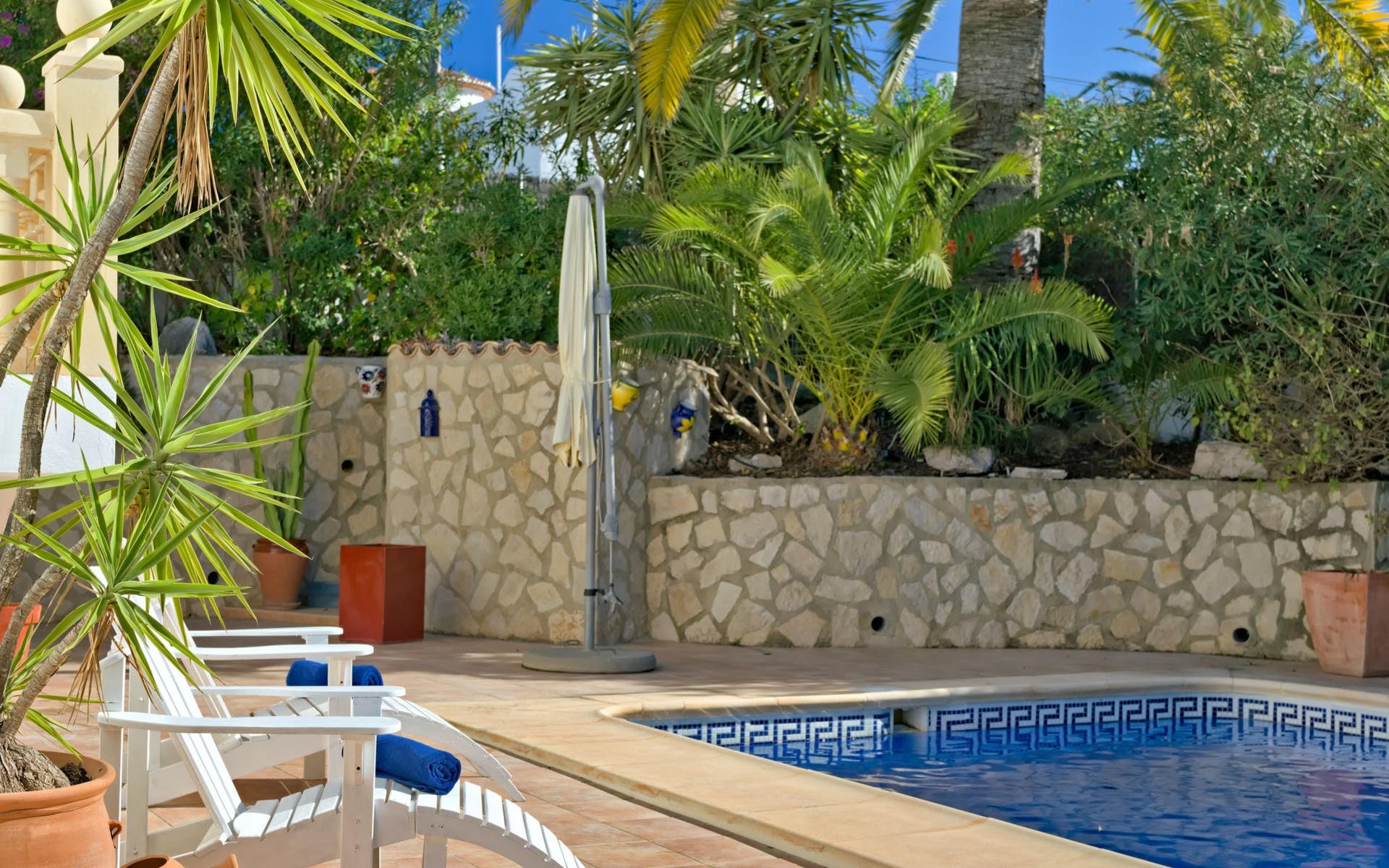 Very large, very beautiful, comfortable house "El Rinco de la Felicidad". In the district of Pinosol, in a quiet, sunny position, 2.4 km from the sea, 2.4 km from the beach. Private: swimming pool angular (8 x 4 m, depth 40 - 250 cm, seasonal availability: 01.Jan. - 31.Dec.) with internal staircase. Pergola, garden furniture, barbecue, roofed, parking. Supermarket 1.4 km, restaurant 350 m, bar 400 m, café 450 m, bus stop "Parada antiguo Mas y Mas" 1.8 km, sandy beach "El Arenal" 2.2 km, rocky beach "Cala Blanca" 3 km. Sports harbour 2.6 km, surf school 2.5 km, sailing school 2.6 km, tennis 2.5 km. The owner does not accept any youth groups.