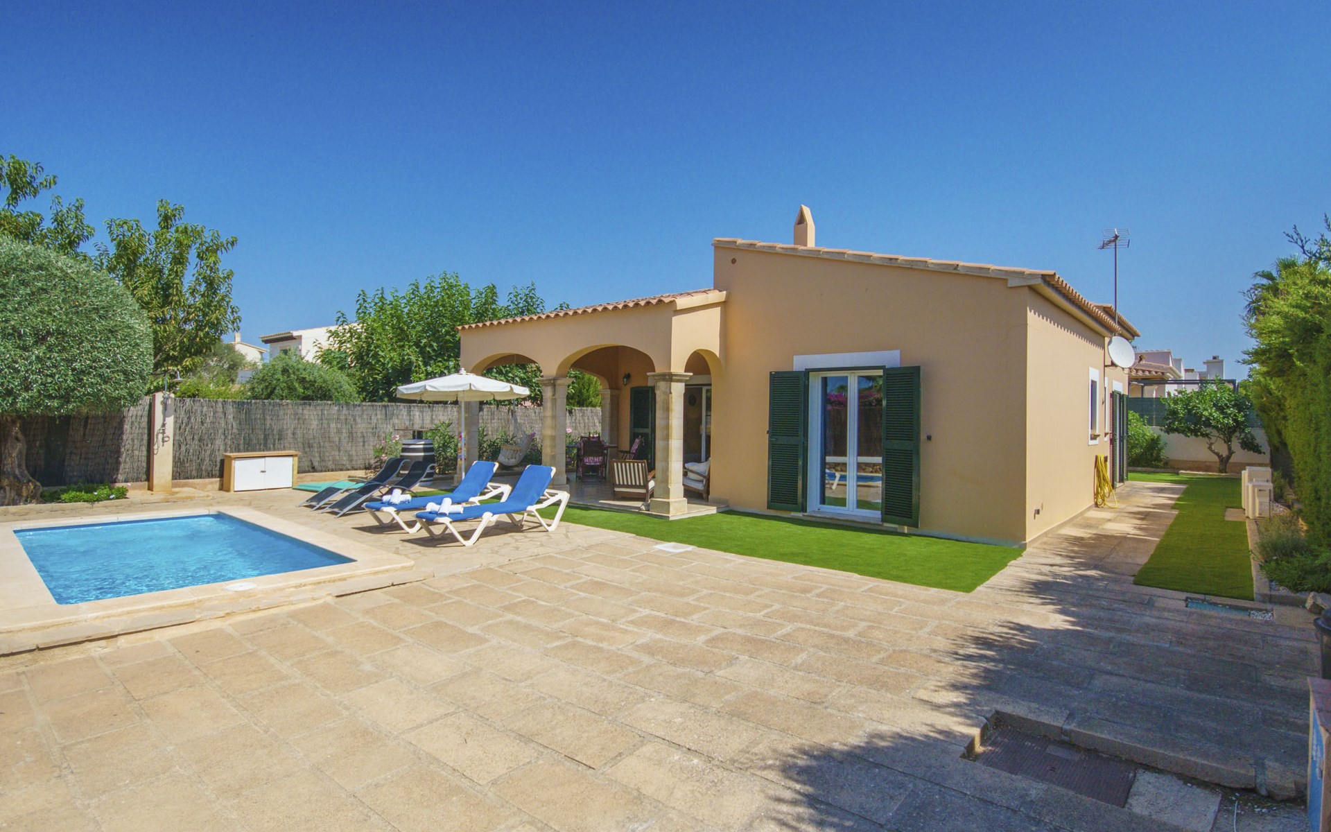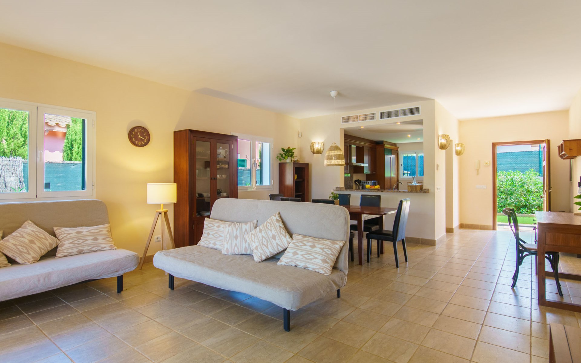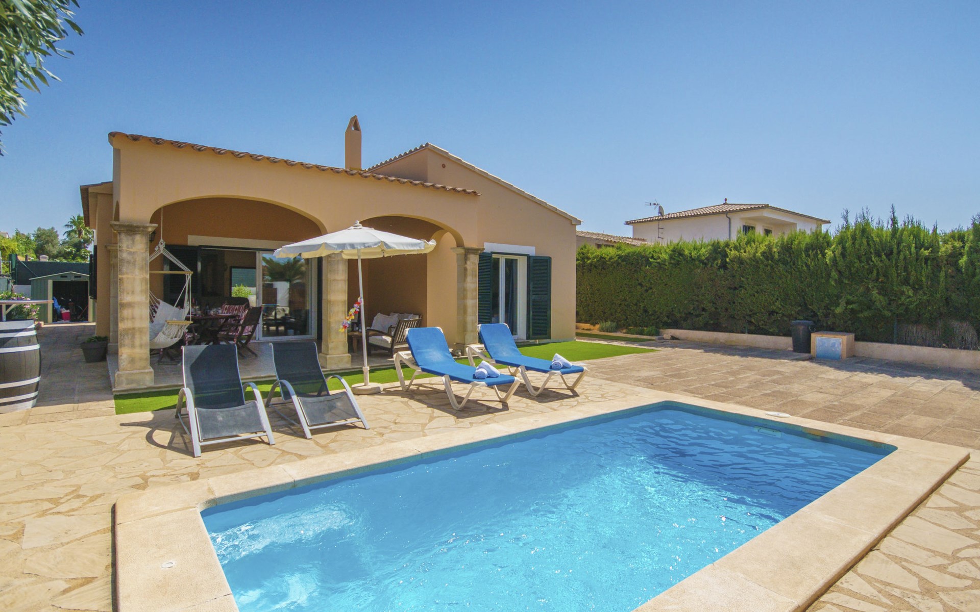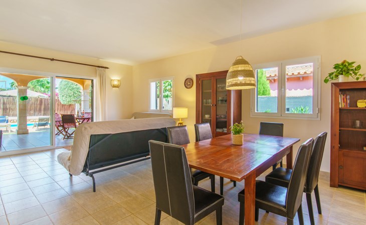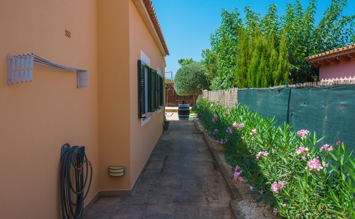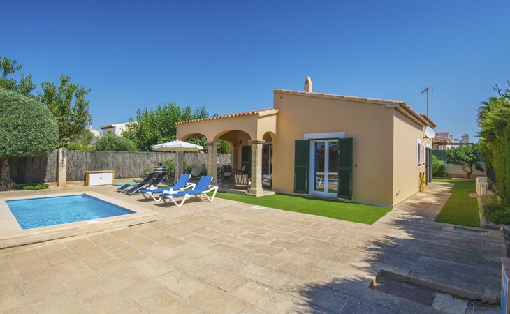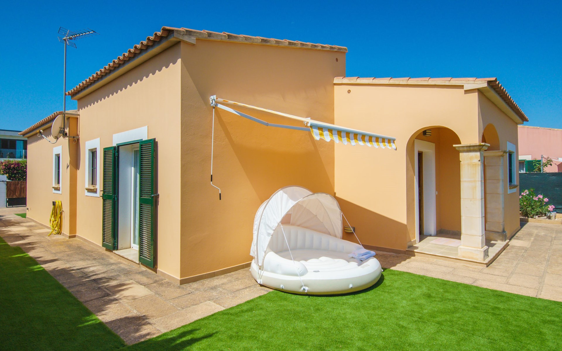 Dalt Sa Rapita 1 km from Sa Ràpita: Beautiful, cosy house "Frijoles", renovated in 2022. In the district of Dalt Sa Rapita 1 km from the centre of Sa Rápita, 12 km from the centre of Campos, 44 km from the centre of Palma, in the residential district, 1 km from the edge of the forest, 1.5 km from the sea, 1 km from the beach, south facing position. Private: property 500 m2 (fenced), swimming pool angular (5 x 2 m, seasonal availability: 01.Jan. - 31.Dec.). Outdoor shower, pool maintenance by the owner/gardener. In the house: air conditioning. Shop 1 km, grocery 1 km, supermarket 3 km, shopping centre 12 km, restaurant 1 m, bar 1 km, bakery 1 km, café 1 km, 10 minute walk to the centre, bus stop "Miramar 1 (13004)" 1.4 km, railway station "Estación de Manacor" 38 km, ferry "Palma" 44 km, sandy beach "Es Trenc" 2 km. Sports harbour 1 km, marina 44 km, golf course (18 hole) 20 km, surf school 2 km, sailing school 2 km, tennis 1 km, sports centre 12 km, walking paths from the house 2 km. Nearby attractions: Rafa Nadal Acadeny 38 km, Playa d'es Trenc 5 km, Coves dels Hams 47 km, Calo des Moro 24 km. Please note: car recommended. Suitable for families, suitable for seniors. The owner does not accept any groups. The owner does not accept any youth groups. Airfield 35 km from the property.
