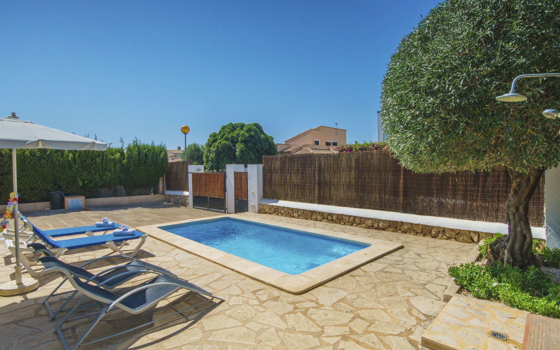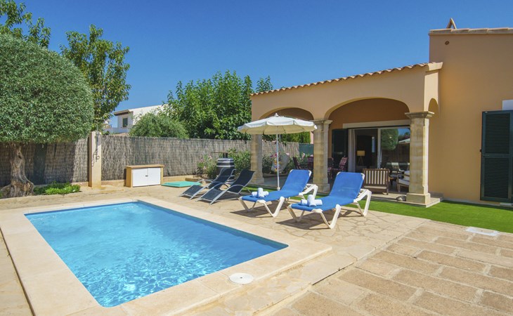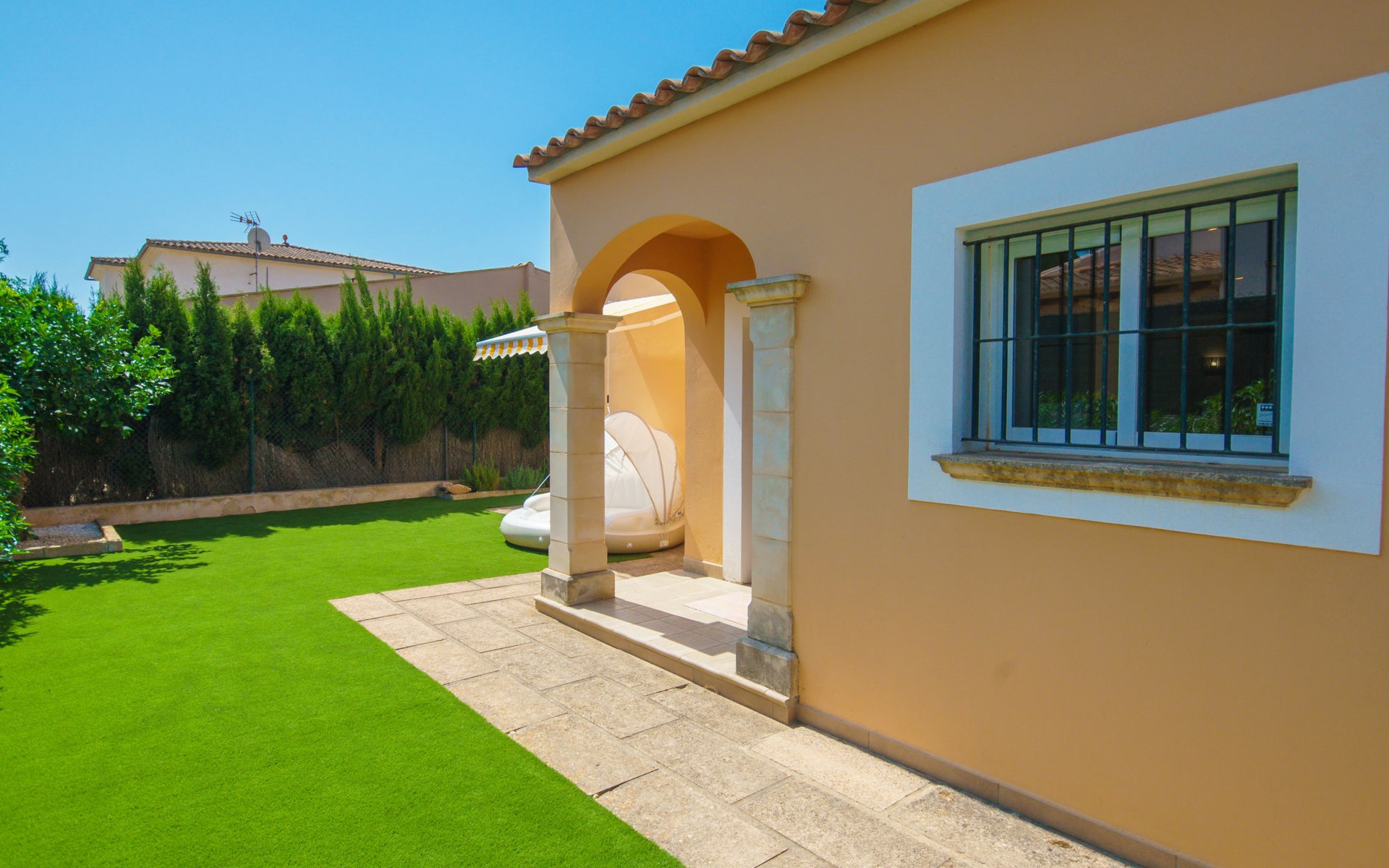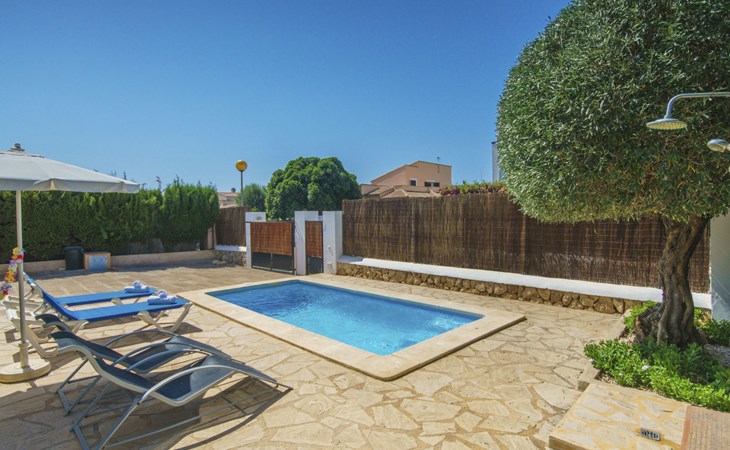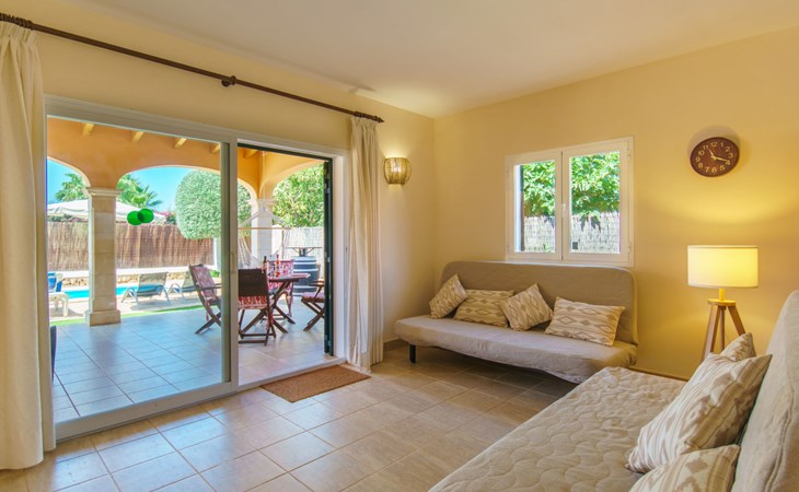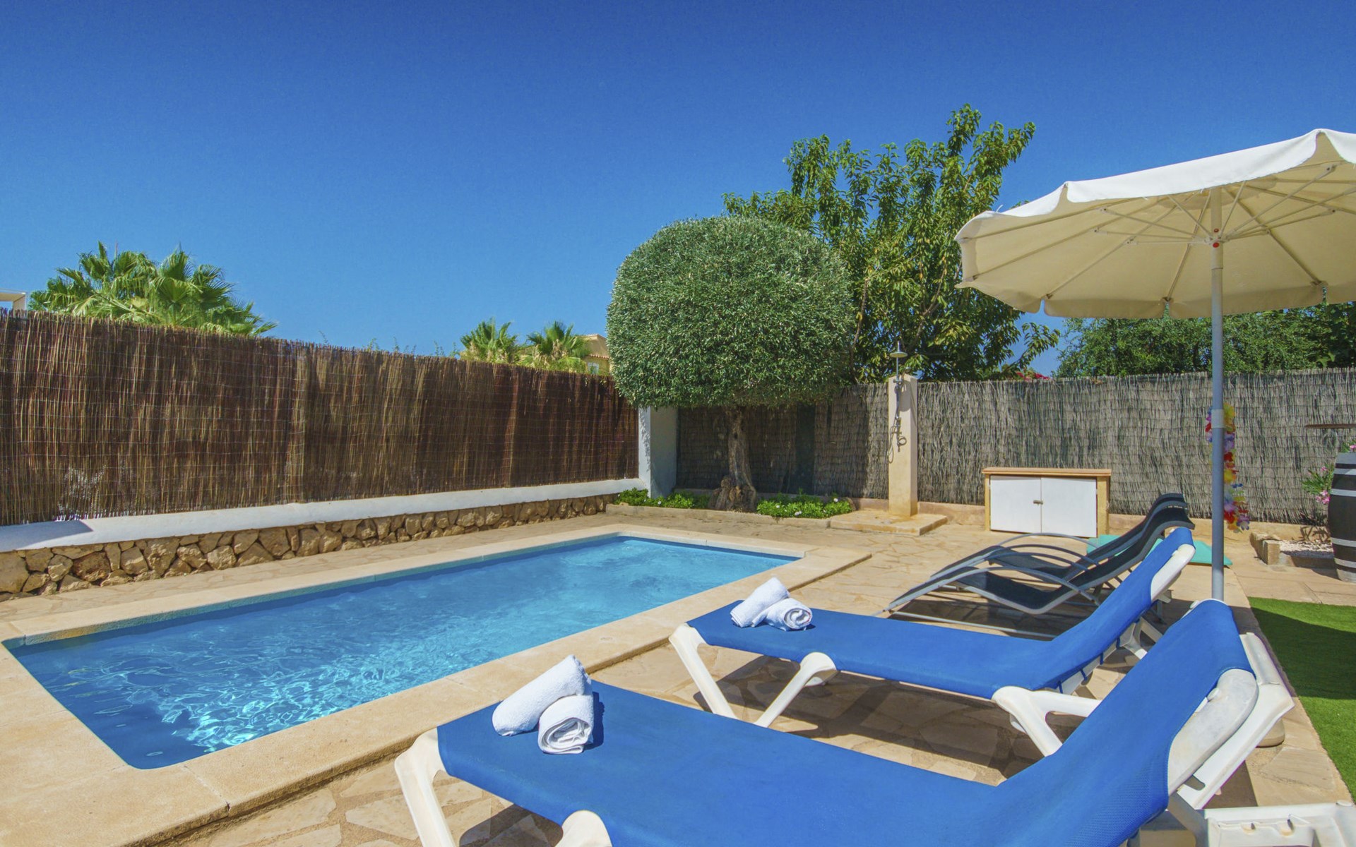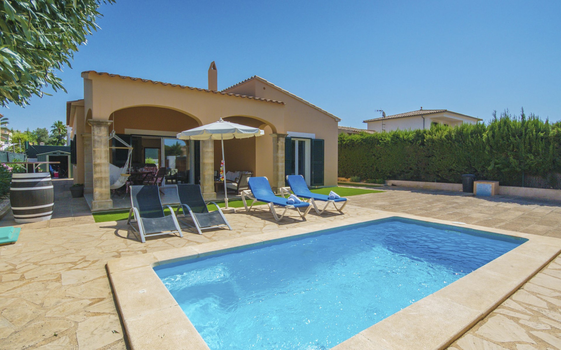 Dalt Sa Rapita 1 km from Sa Ràpita: Beautiful, cosy house "Frijoles", renovated in 2022. In the district of Dalt Sa Rapita 1 km from the centre of Sa Rápita, 12 km from the centre of Campos, 44 km from the centre of Palma, in the residential district, 1 km from the edge of the forest, 1.5 km from the sea, 1 km from the beach, south facing position. Private: property 500 m2 (fenced), swimming pool angular (5 x 2 m, seasonal availability: 01.Jan. - 31.Dec.). Outdoor shower, pool maintenance by the owner/gardener. In the house: air conditioning. Shop 1 km, grocery 1 km, supermarket 3 km, shopping centre 12 km, restaurant 1 m, bar 1 km, bakery 1 km, café 1 km, 10 minute walk to the centre, bus stop "Miramar 1 (13004)" 1.4 km, railway station "Estación de Manacor" 38 km, ferry "Palma" 44 km, sandy beach "Es Trenc" 2 km. Sports harbour 1 km, marina 44 km, golf course (18 hole) 20 km, surf school 2 km, sailing school 2 km, tennis 1 km, sports centre 12 km, walking paths from the house 2 km. Nearby attractions: Rafa Nadal Acadeny 38 km, Playa d'es Trenc 5 km, Coves dels Hams 47 km, Calo des Moro 24 km. Please note: car recommended. Suitable for families, suitable for seniors. The owner does not accept any groups. The owner does not accept any youth groups. Airfield 35 km from the property.