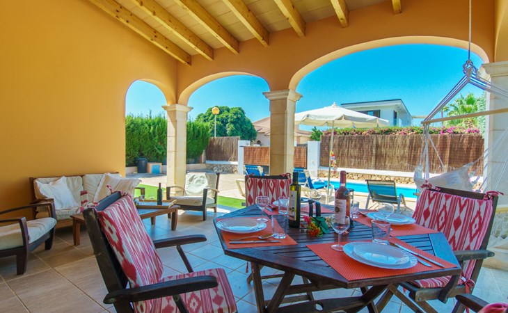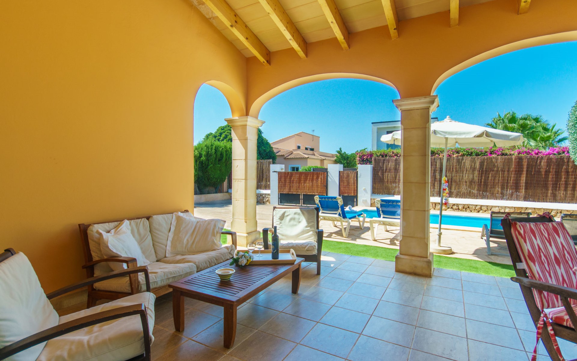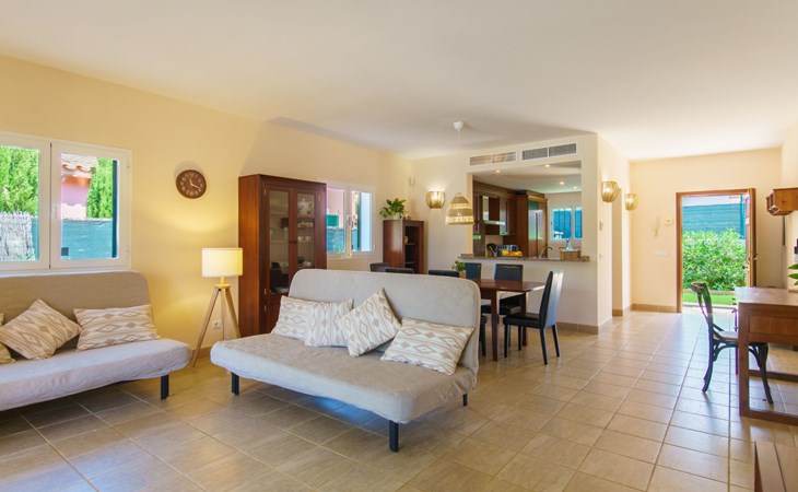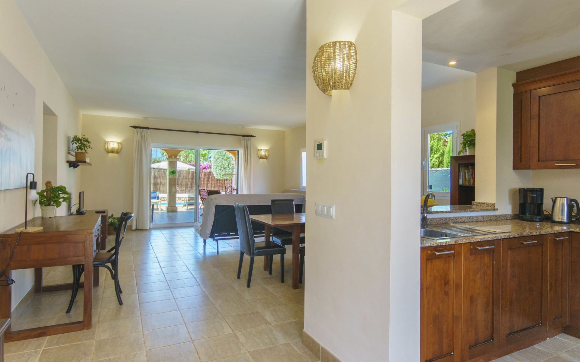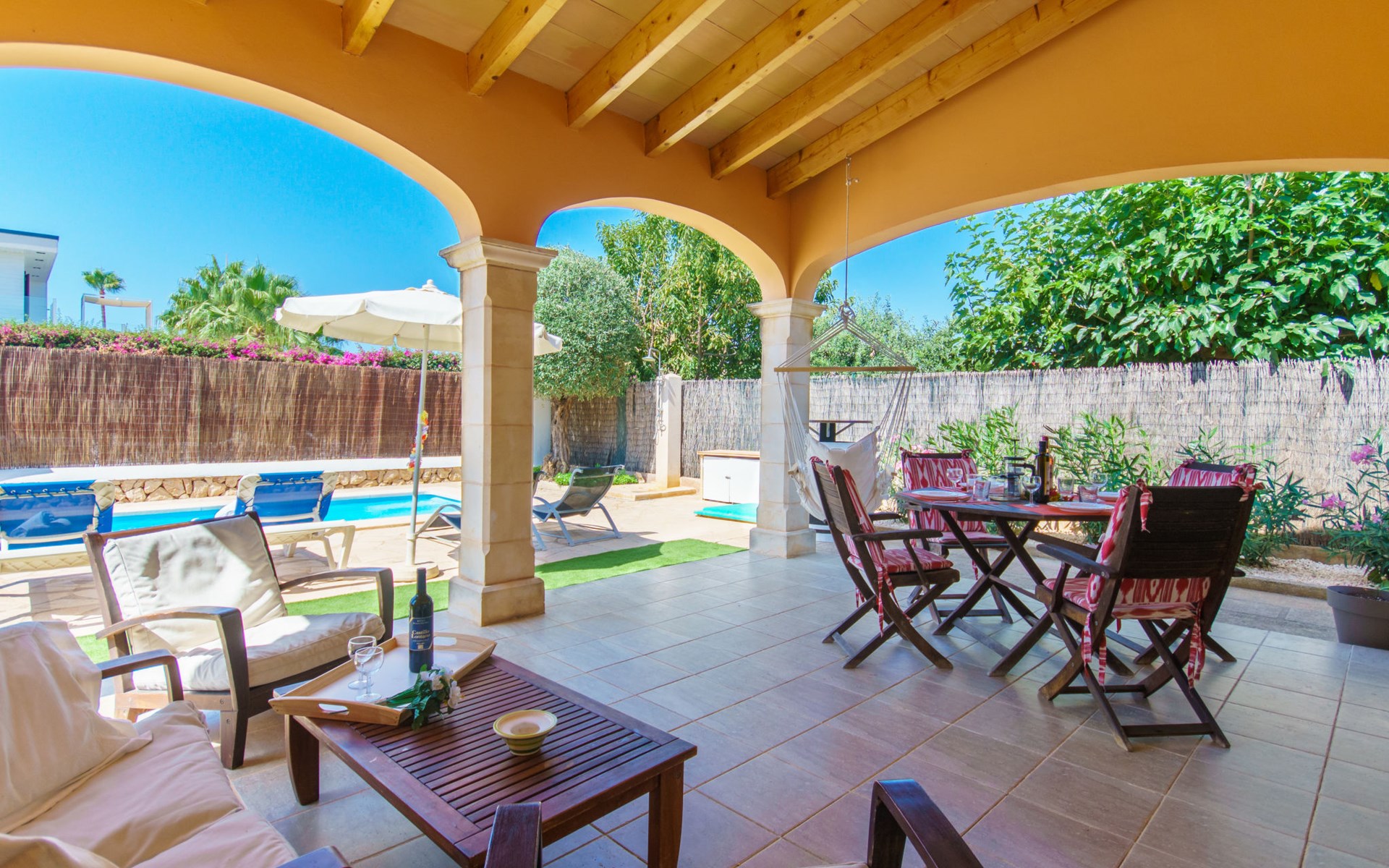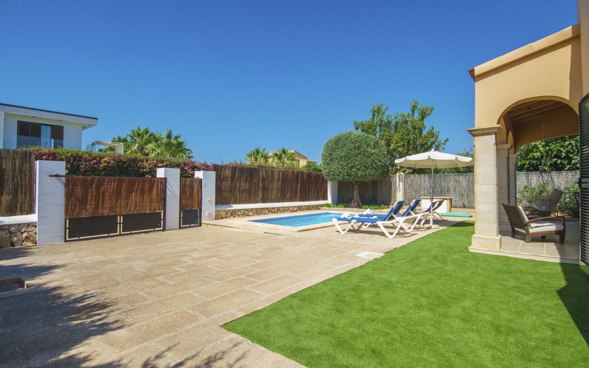 Dalt Sa Rapita 1 km from Sa Ràpita: Beautiful, cosy house "Frijoles", renovated in 2022. In the district of Dalt Sa Rapita 1 km from the centre of Sa Rápita, 12 km from the centre of Campos, 44 km from the centre of Palma, in the residential district, 1 km from the edge of the forest, 1.5 km from the sea, 1 km from the beach, south facing position. Private: property 500 m2 (fenced), swimming pool angular (5 x 2 m, seasonal availability: 01.Jan. - 31.Dec.). Outdoor shower, pool maintenance by the owner/gardener. In the house: air conditioning. Shop 1 km, grocery 1 km, supermarket 3 km, shopping centre 12 km, restaurant 1 m, bar 1 km, bakery 1 km, café 1 km, 10 minute walk to the centre, bus stop "Miramar 1 (13004)" 1.4 km, railway station "Estación de Manacor" 38 km, ferry "Palma" 44 km, sandy beach "Es Trenc" 2 km. Sports harbour 1 km, marina 44 km, golf course (18 hole) 20 km, surf school 2 km, sailing school 2 km, tennis 1 km, sports centre 12 km, walking paths from the house 2 km. Nearby attractions: Rafa Nadal Acadeny 38 km, Playa d'es Trenc 5 km, Coves dels Hams 47 km, Calo des Moro 24 km. Please note: car recommended. Suitable for families, suitable for seniors. The owner does not accept any groups. The owner does not accept any youth groups. Airfield 35 km from the property.