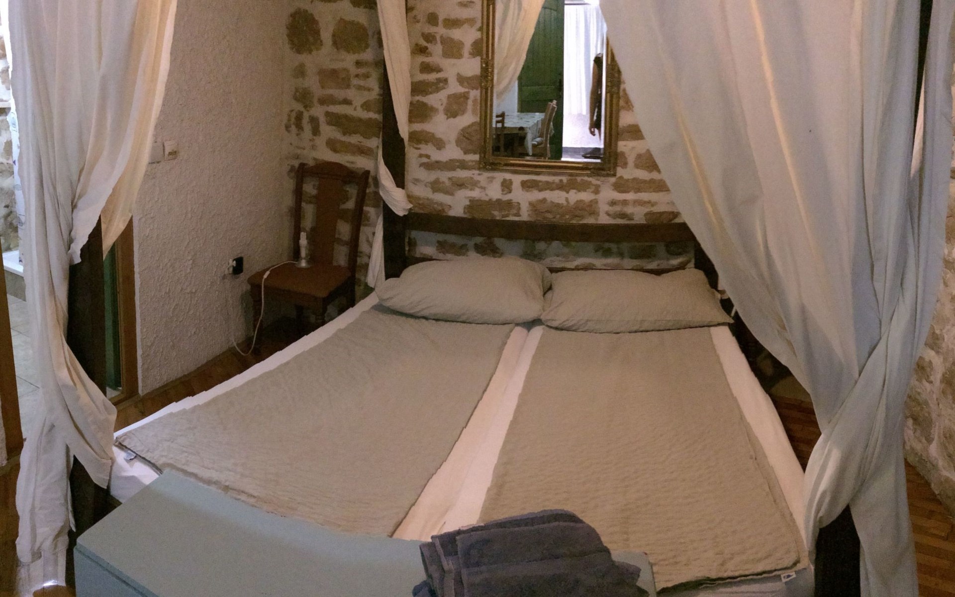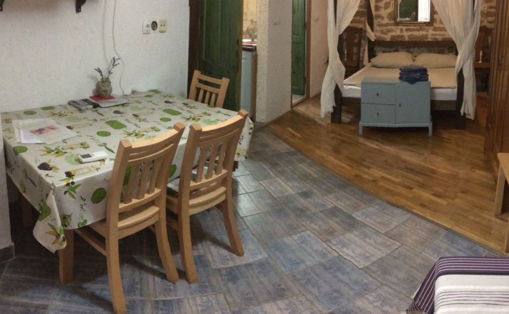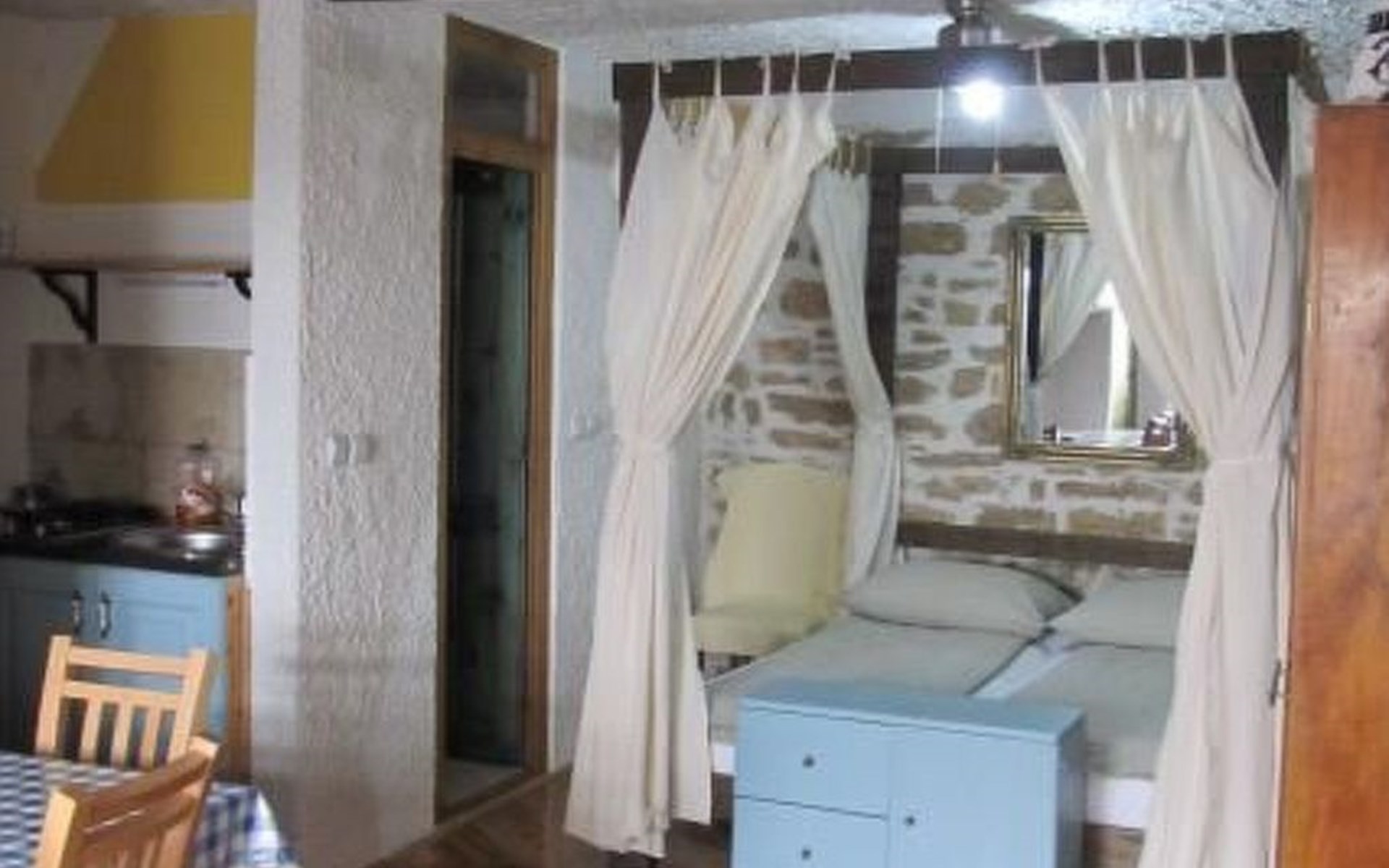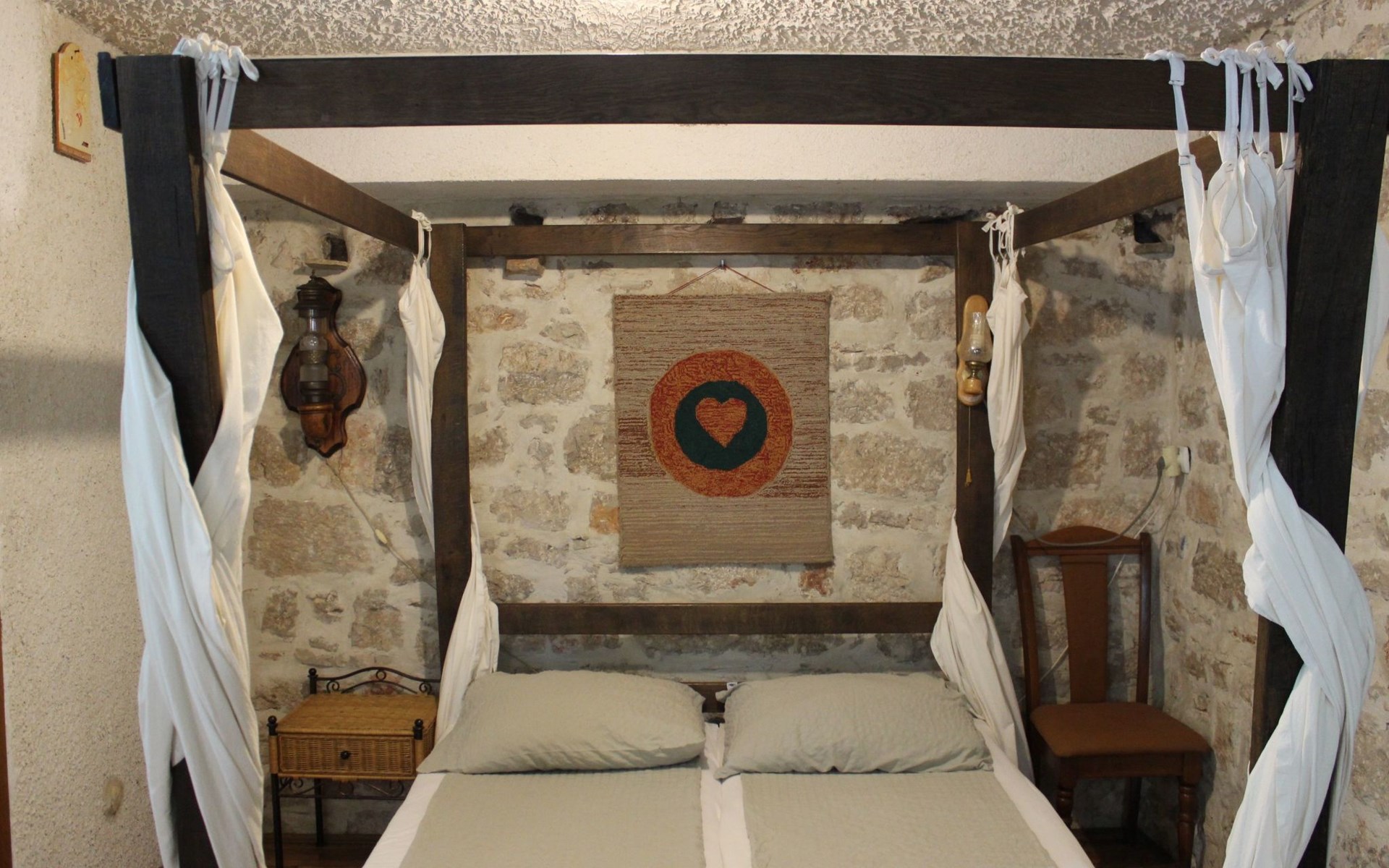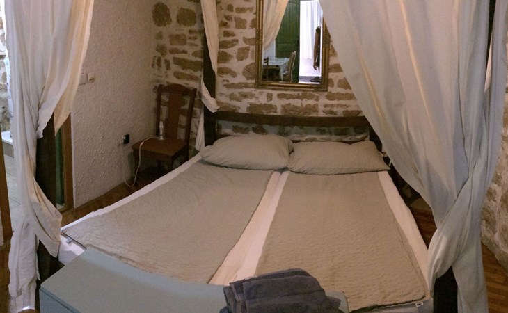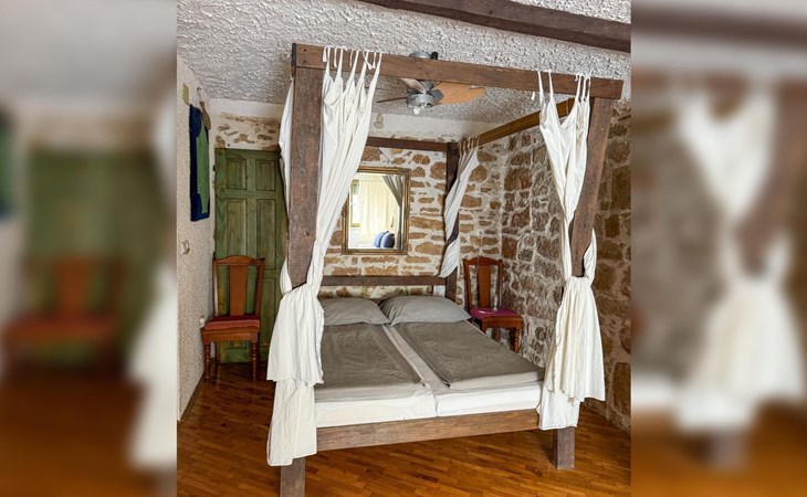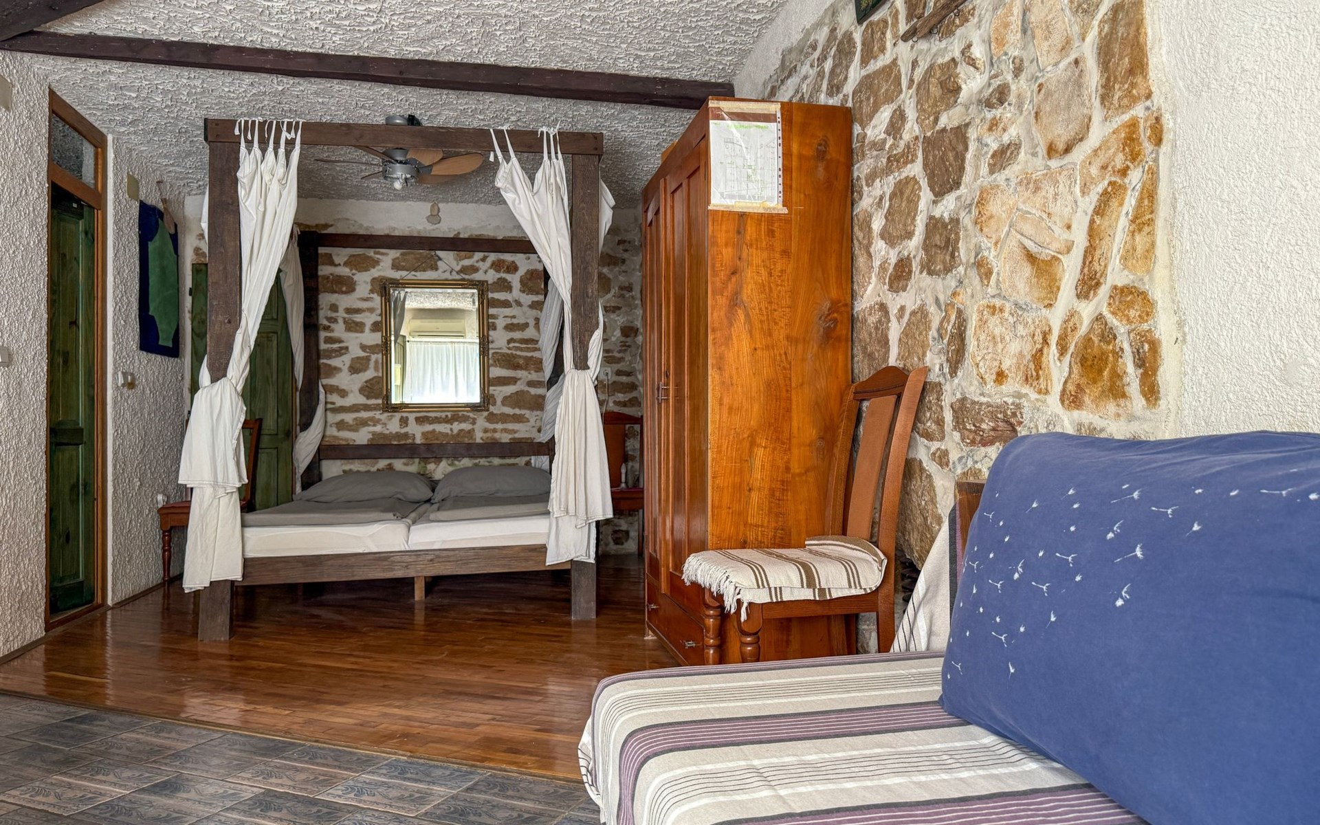 The interior of the studio has been carefully chosen to create a warm and welcoming ambience. In addition to the impressive four-poster bed, equipped with two ergonomic mattresses, you will find a functional, fully equipped kitchenette with basic cooking utensils, a historic wardrobe that tells its own story and a couch that can be converted into another comfortable sleeping area. Modern comfort is guaranteed by the air conditioning, WLAN and satellite TV, while the bathroom with shower, towels and WC leaves nothing to be desired.