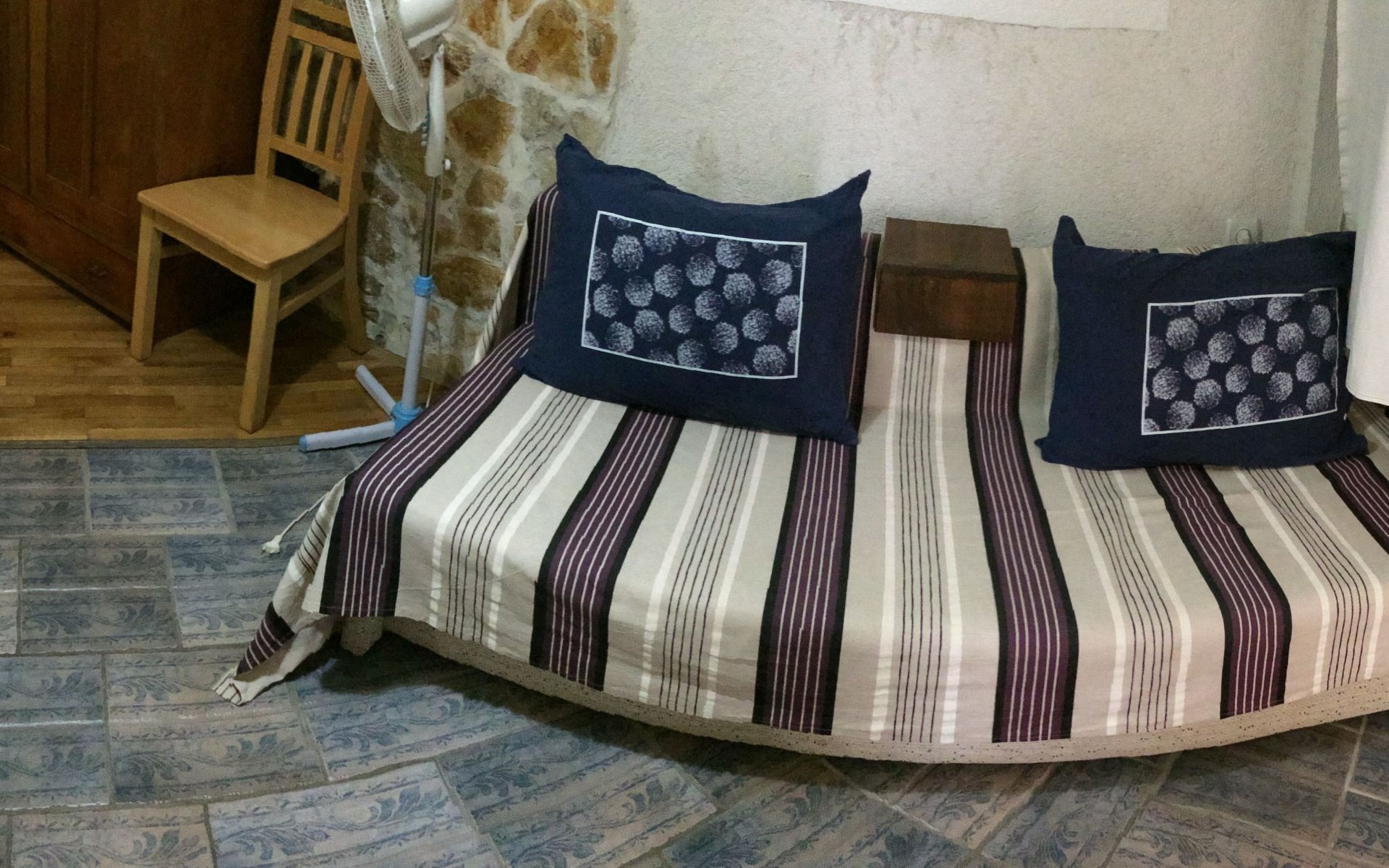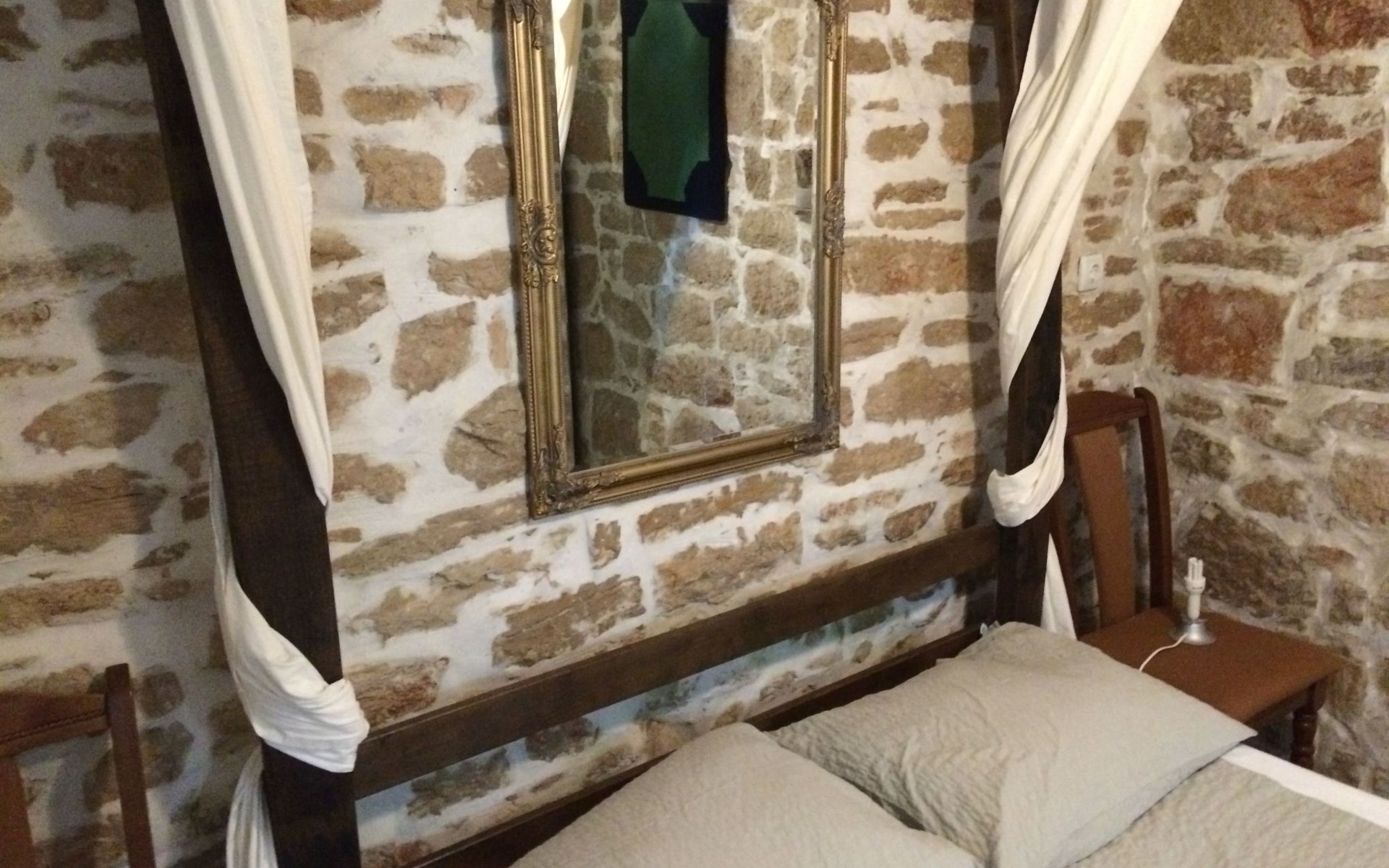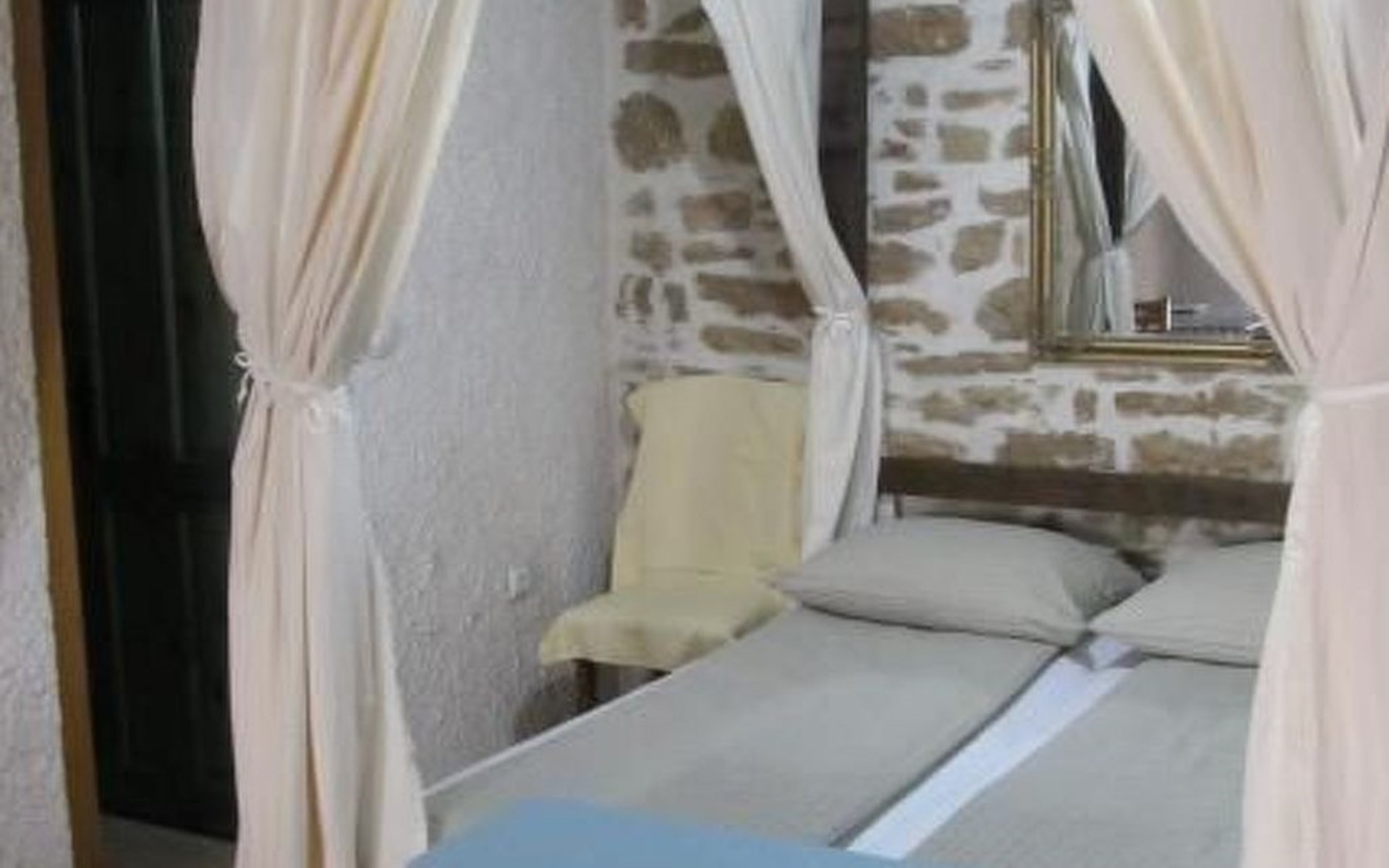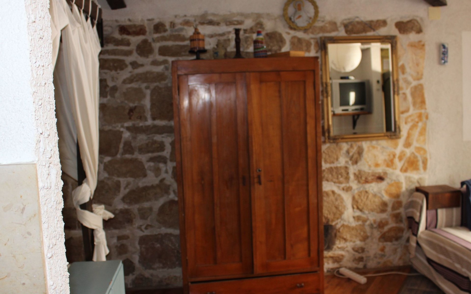 The interior of the studio has been carefully chosen to create a warm and welcoming ambience. In addition to the impressive four-poster bed, equipped with two ergonomic mattresses, you will find a functional, fully equipped kitchenette with basic cooking utensils, a historic wardrobe that tells its own story and a couch that can be converted into another comfortable sleeping area. Modern comfort is guaranteed by the air conditioning, WLAN and satellite TV, while the bathroom with shower, towels and WC leaves nothing to be desired.