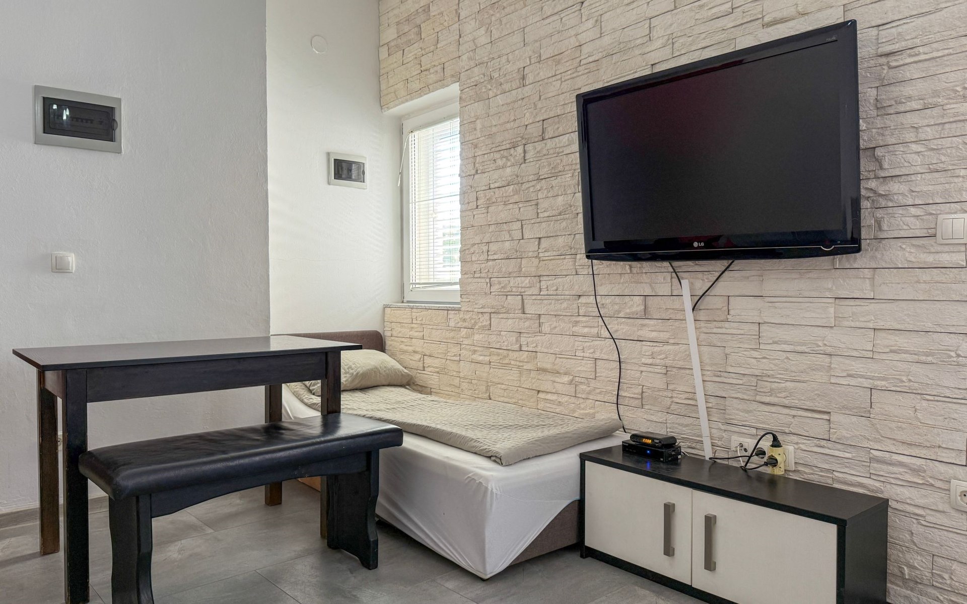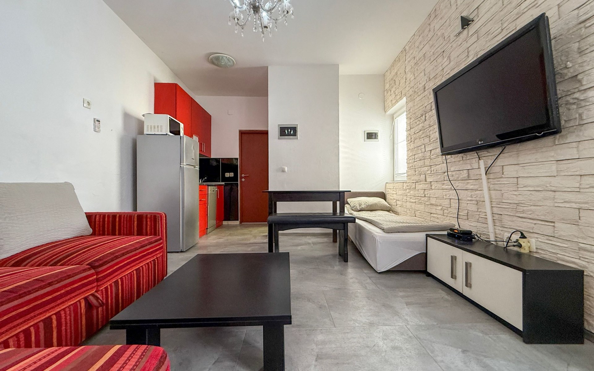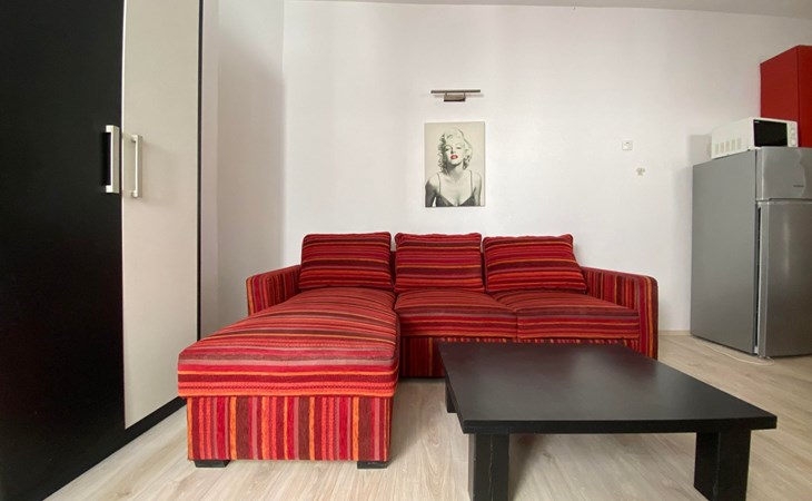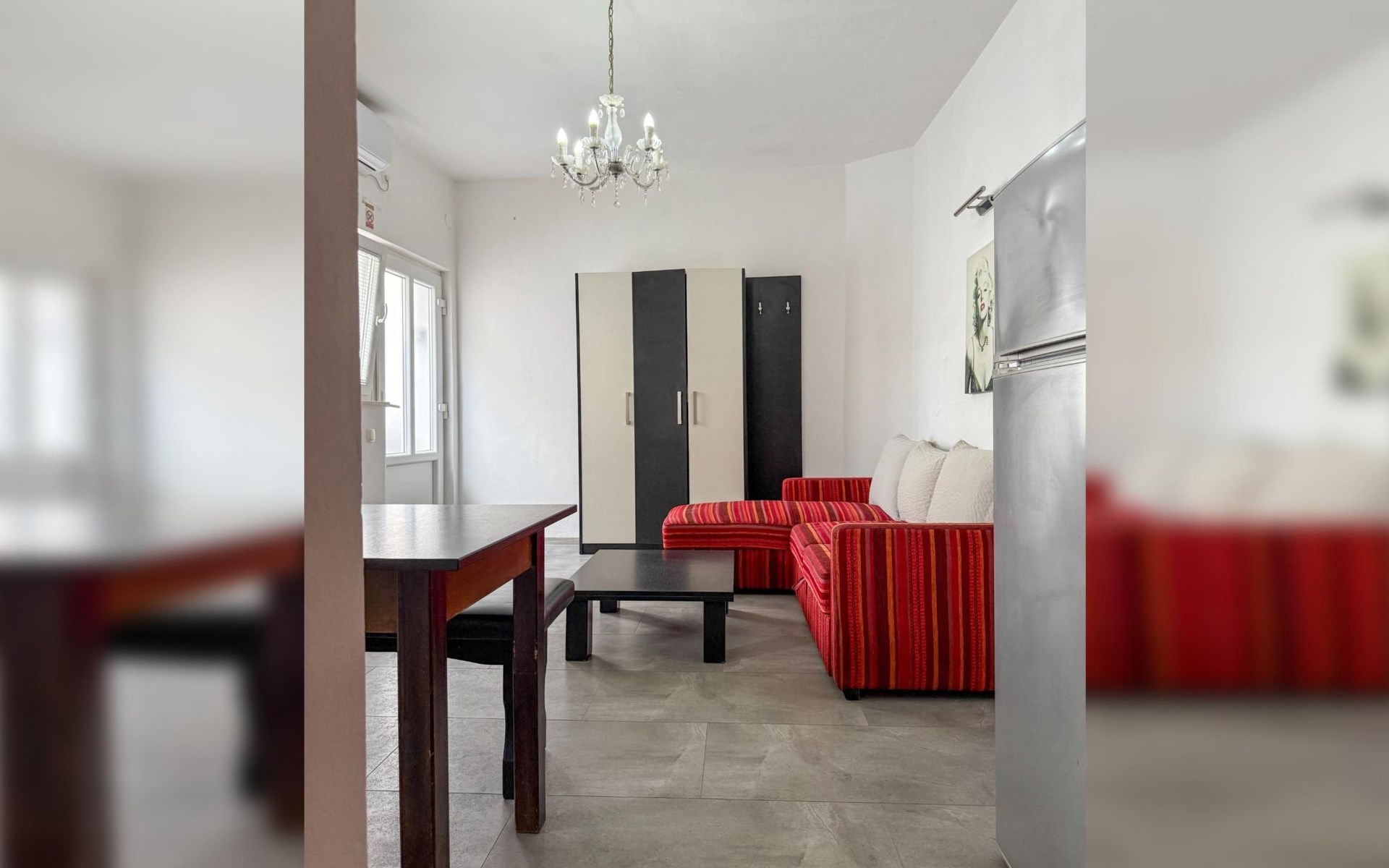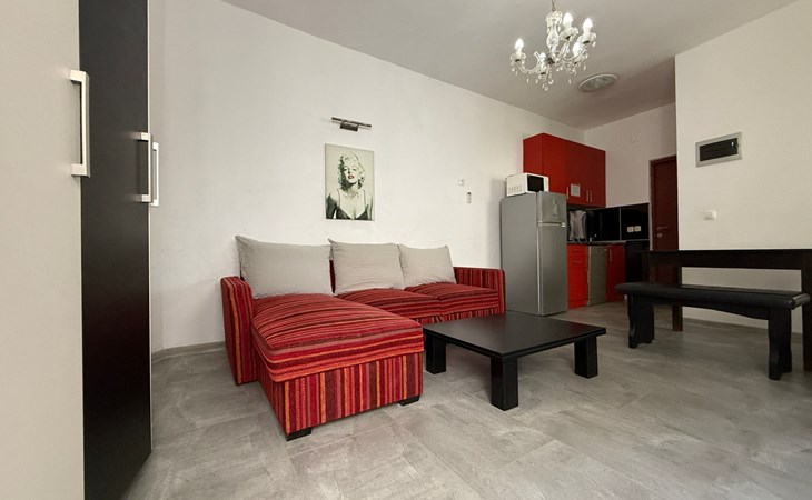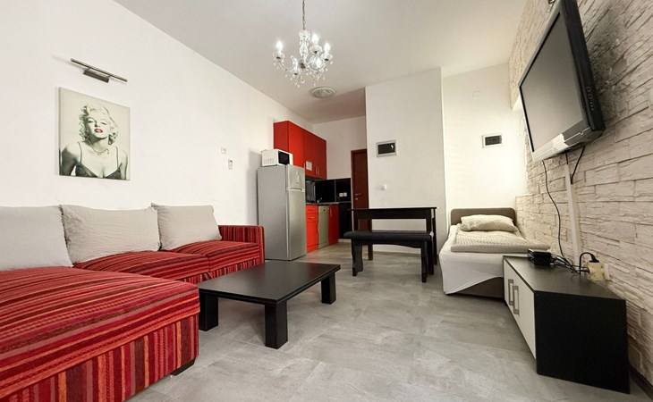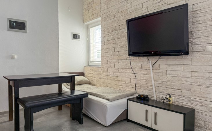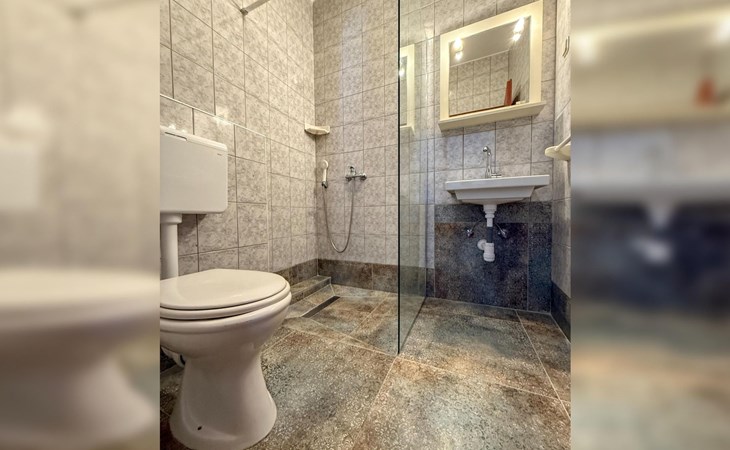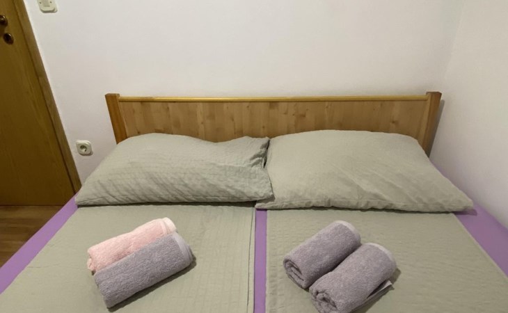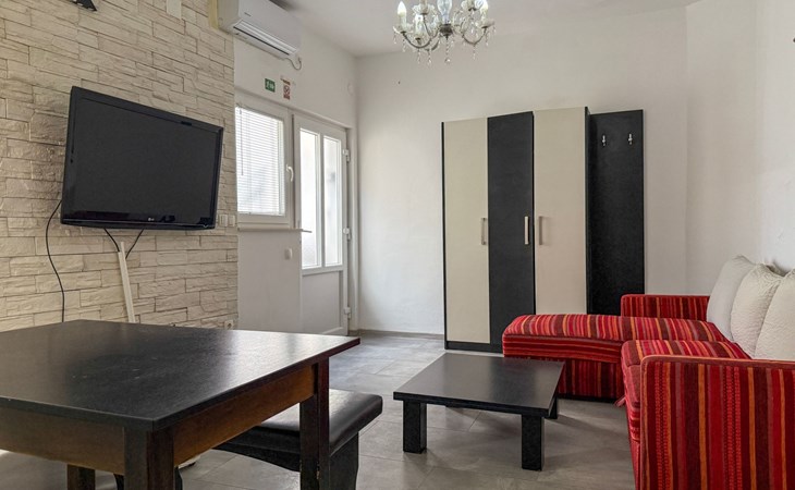 The interior of our 47m^2 holiday flat leaves nothing to be desired. A separate bedroom with a comfortable double bed ensures a good night's sleep. In the large living room you will find a sofa bed (approx. 160x195cm), which offers additional sleeping space. Our kitchen is equipped with all basic cooking utensils, a cooker, a microwave and a fridge. The entire flat is air-conditioned, but also benefits from a pleasant indoor climate, which is favoured by the thick stone walls of the traditionally built house. Each flat also has a small terrace at the entrance, which invites you to linger.