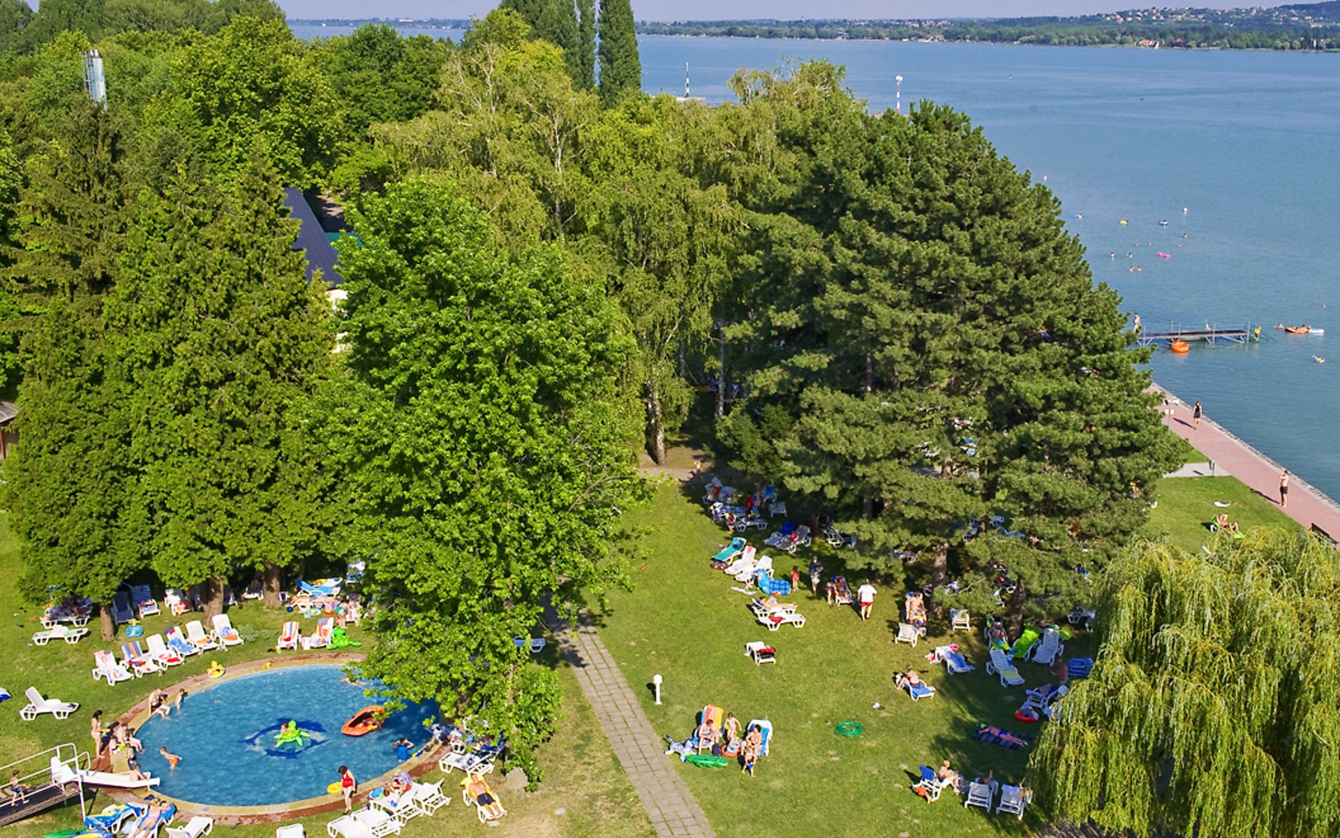 Tihany 8 km from Balatonfüred: Child friendly, cosy holiday village "Atrium". In a quiet, sunny position, 350 m from the lake, 350 m from the beach, direct access to the beach, in the countryside. For shared use: park 13 ha (fenced), flowers and trees, lawn for sunbathing, indoor pool angular (25 x 10 m, 250 m2, depth 130 - 130 cm). Shower/WC in the pool area, children's pool, slide, outdoor shower, private beach, hot tub, tennis (4 x clay court) (extra), volleyball, badminton, children's playground (slide, swing, sandbox). In the house: reception, restaurant, bar, WiFi, sauna, fitness room, massage (extra). Steam room, solarium (extra). Hot tub, infrared sauna, bowling (extra). Table tennis (extra). Billiard table, boutique, kiosk, bicycle rental. Linen change weekly. Towel change weekly. Room cleaning on request (extra). Breakfast and half board possible on request (extra). Parking (extra) on the premises. E-charging station. Shop 200 m, supermarket 8 km, restaurant, bar, café 150 m, bus stop "Aszófő vasútállomás, bejárati út" 8 km, railway station "Aszófő" 8 km, ferry 250 m, grass beach 150 m, thermal baths "Hévíz" 68 km. Sports harbour 500 m, golf course (18 hole) 9 km, surf school, sailing school, tennis, indoor tennis centre, minigolf 100 m, riding stable 2 km, sports centre 100 m, walking paths from the house 400 m, cycle lane 150 m, children's playground 100 m. Nearby attractions: Tihany Abbey 3 km, Lavender House Visitor Center 3 km, Forrás Sportpark 9 km, Tihany adventure park 5 km, Bodorka - Balaton Aquarium 12 km, Annagora Aquapark 10 km. Well-known lakes can easily be reached: Hévíz Thermal 70 km. Please note: reception open 00:00-24:00 hrs. Entertainment in the season. Suitable for families, suitable for seniors baby equipment on request (extra). 24hr guard.