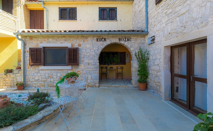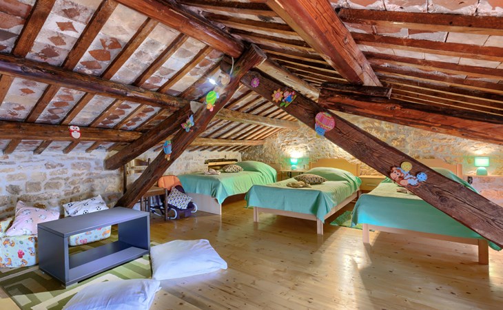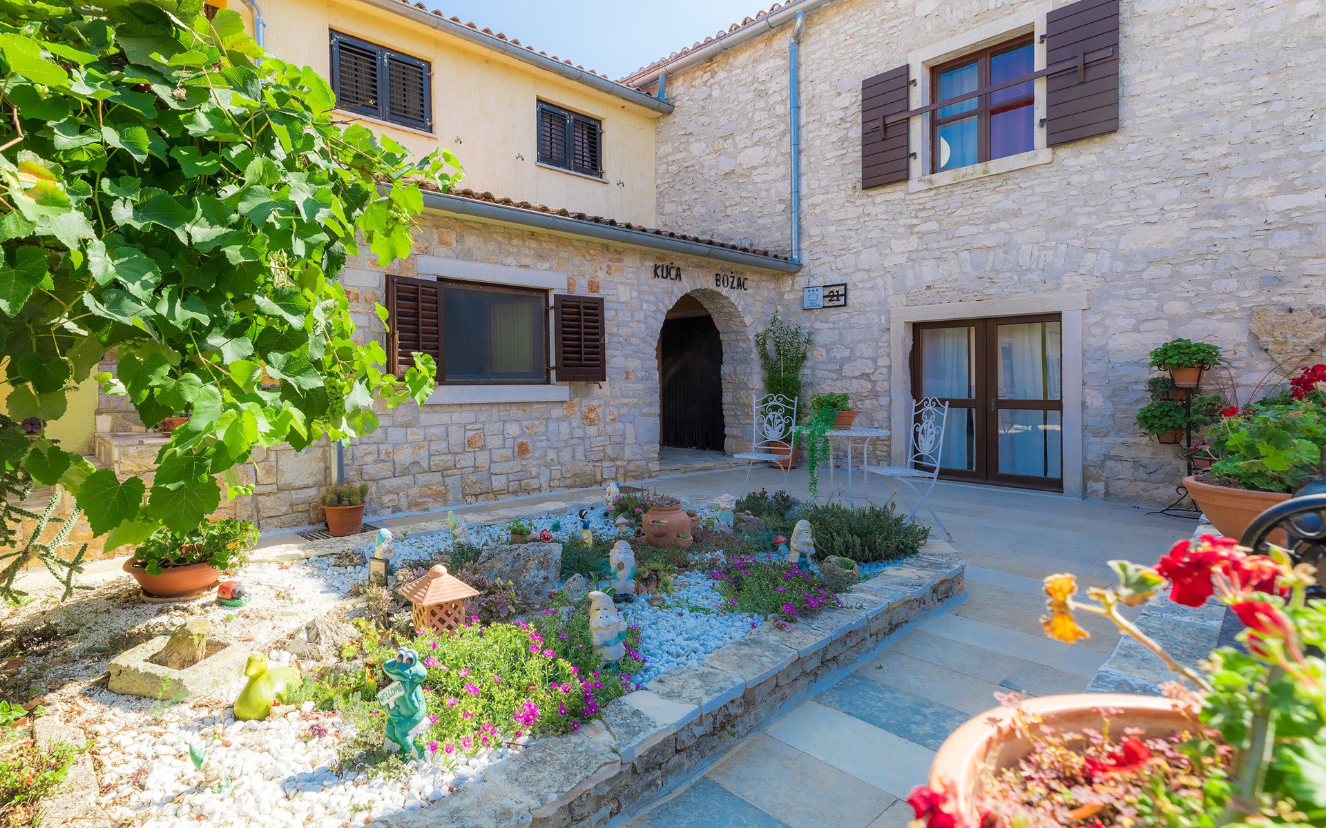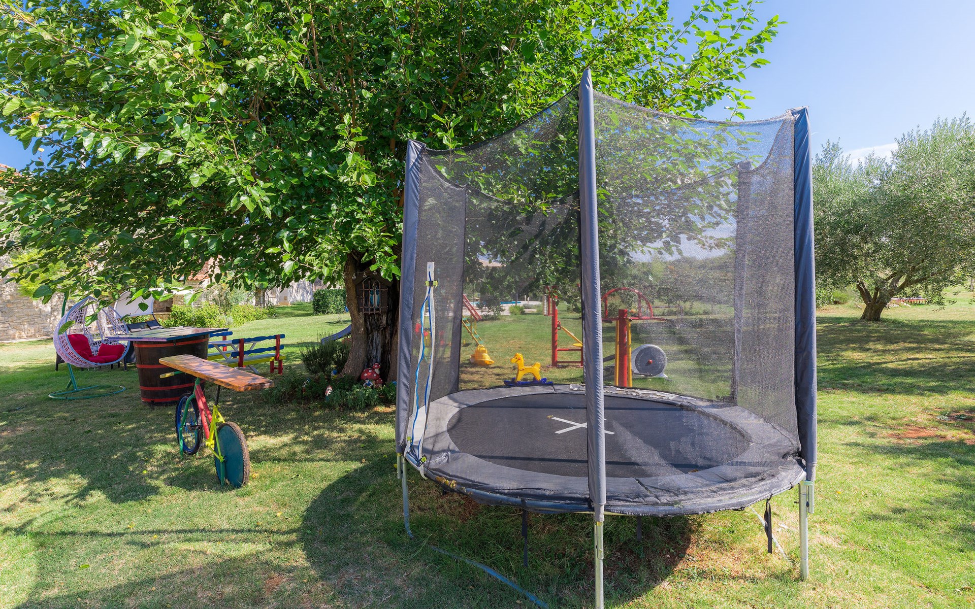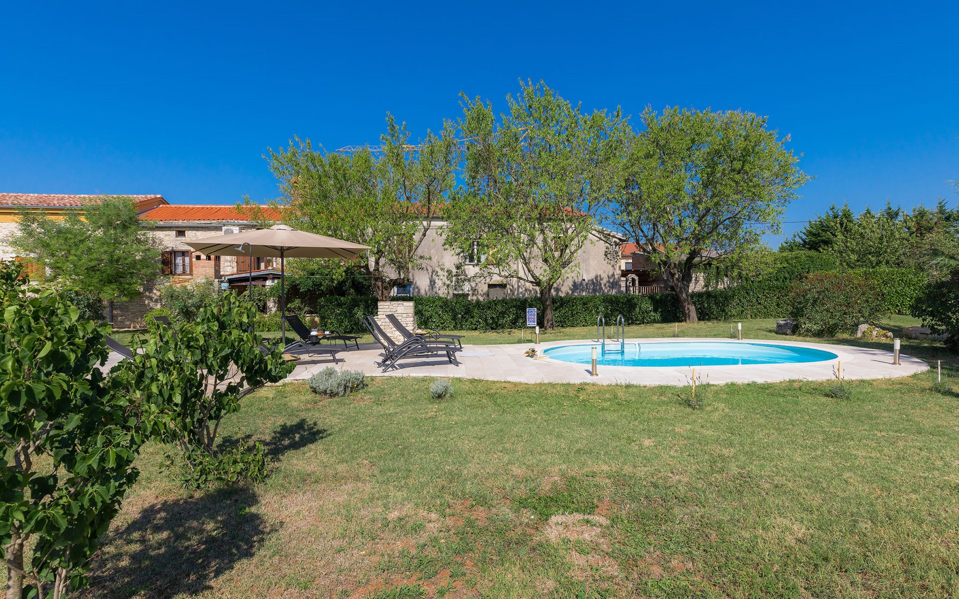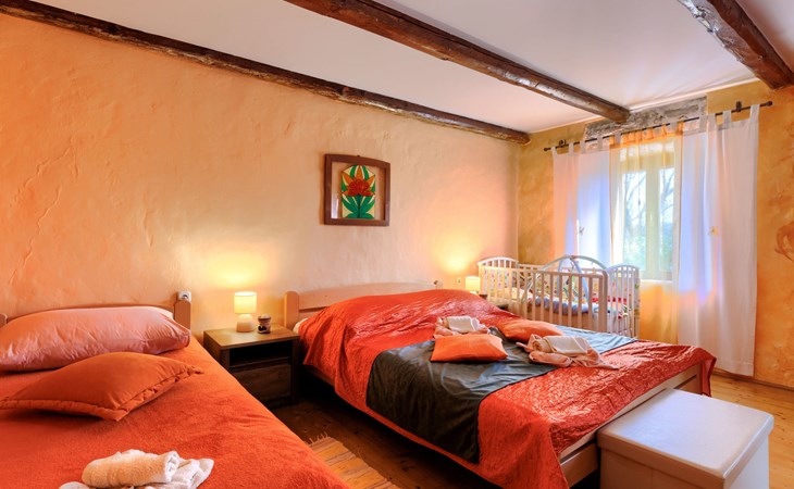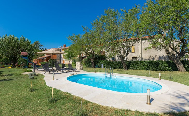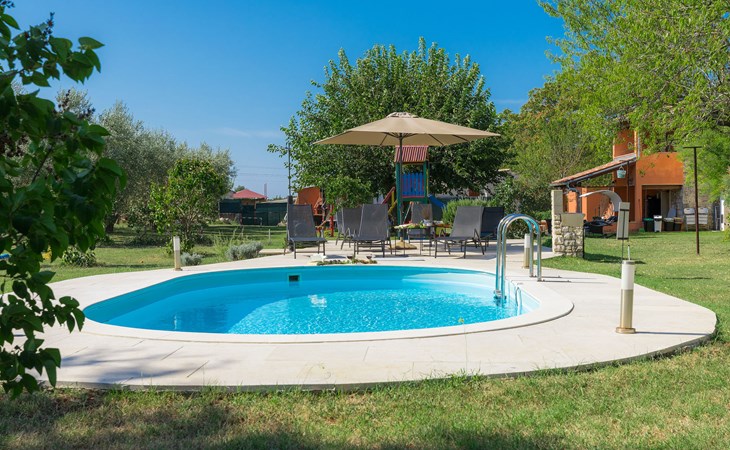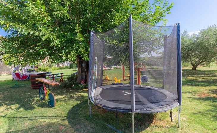 Semi-detached house "Bozac", 3 storeys, surrounded by meadows and fields. In the hamlet Guran 3 km from the centre of Vodnjan, 10 km from the sea. For shared use: property 2'000 m2, trees, meadow, swimming pool heated (8 x 5 m, seasonal availability: 01.May. - 01.Jun.). (swing, sandbox). Private: swimming pool (6 x 4 m, depth 130 cm, seasonal availability: 01.May. - 14.Oct.). Outdoor shower, terrace (16 m2), garden furniture, barbecue. In the house: internet access, washing machine. Available: bicycles (3) (extra). Breakfast and half board possible (extra). Parking (for 2 cars) on the premises. Supermarket 3 km, bus stop 3.2 km, pebble beach 10 km. The owner does not accept any youth groups. Local sale of farm products.