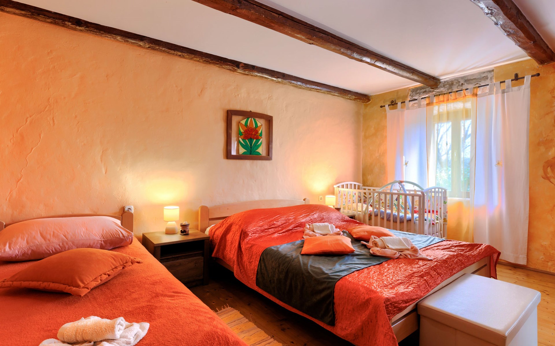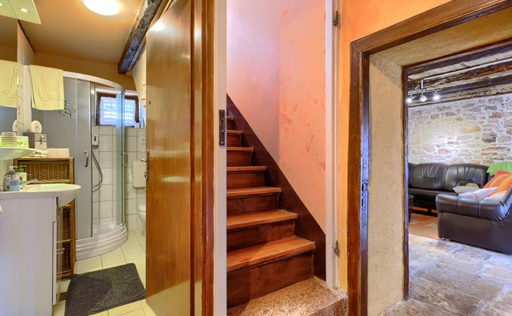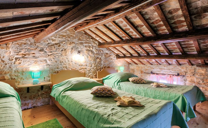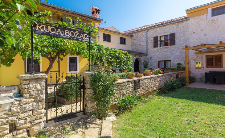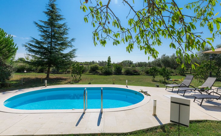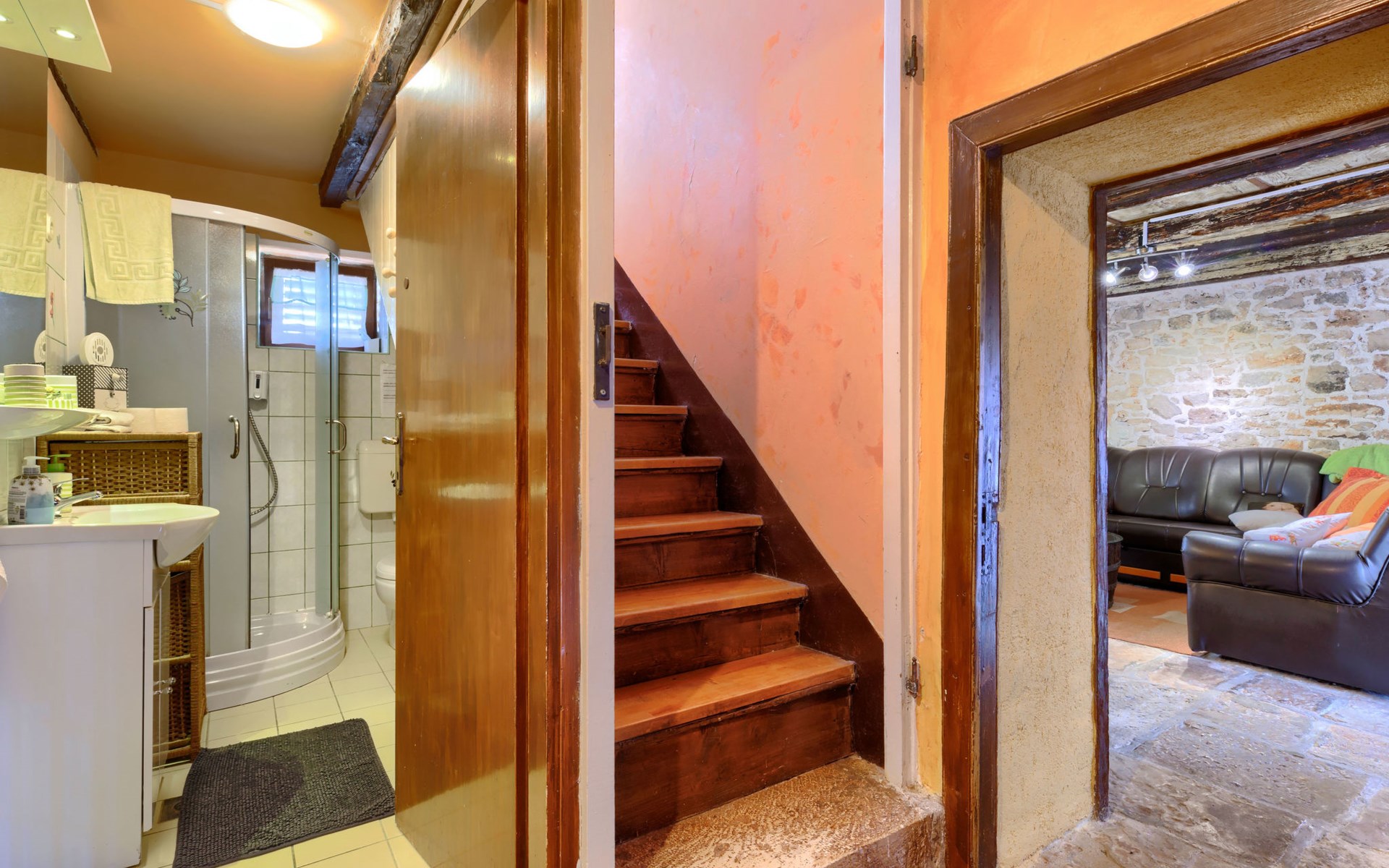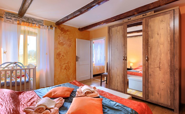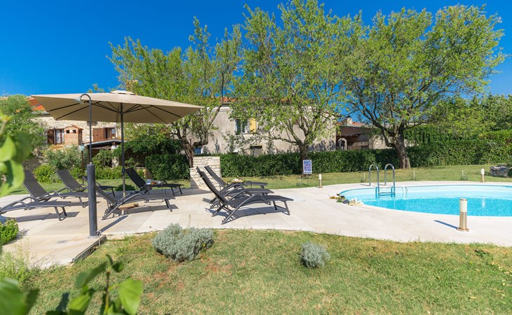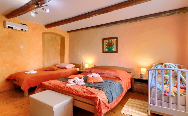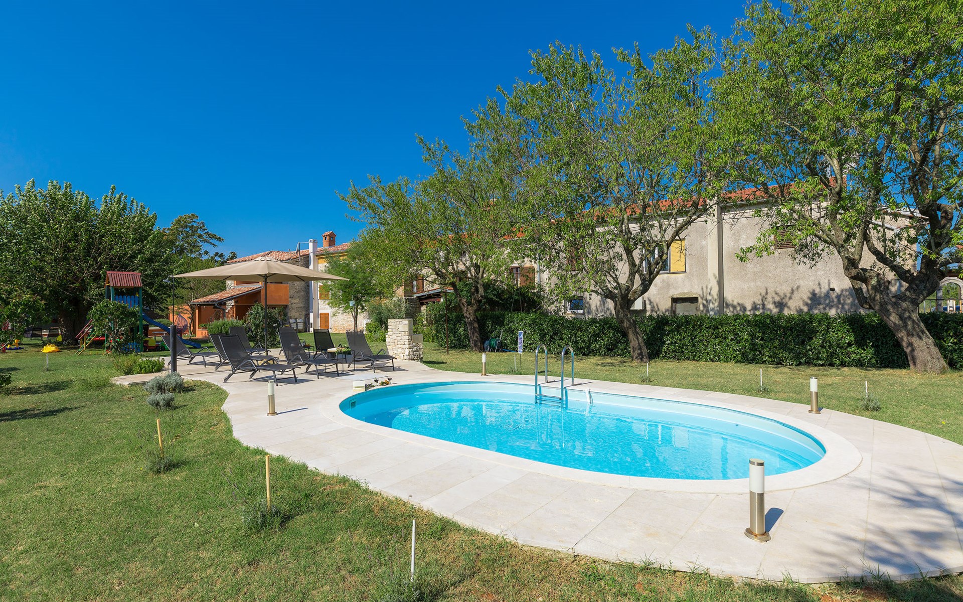 Semi-detached house "Bozac", 3 storeys, surrounded by meadows and fields. In the hamlet Guran 3 km from the centre of Vodnjan, 10 km from the sea. For shared use: property 2'000 m2, trees, meadow, swimming pool heated (8 x 5 m, seasonal availability: 01.May. - 01.Jun.). (swing, sandbox). Private: swimming pool (6 x 4 m, depth 130 cm, seasonal availability: 01.May. - 14.Oct.). Outdoor shower, terrace (16 m2), garden furniture, barbecue. In the house: internet access, washing machine. Available: bicycles (3) (extra). Breakfast and half board possible (extra). Parking (for 2 cars) on the premises. Supermarket 3 km, bus stop 3.2 km, pebble beach 10 km. The owner does not accept any youth groups. Local sale of farm products.