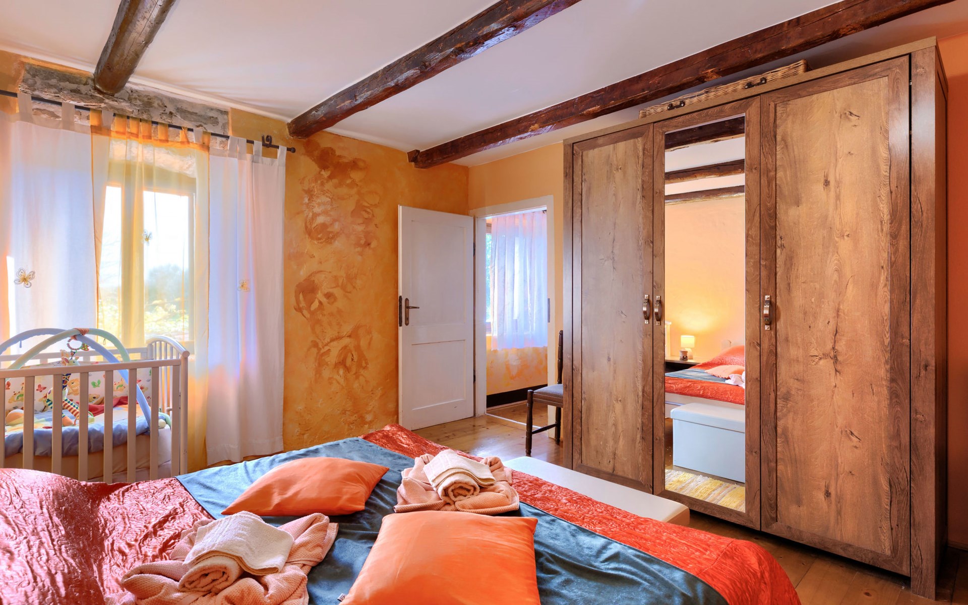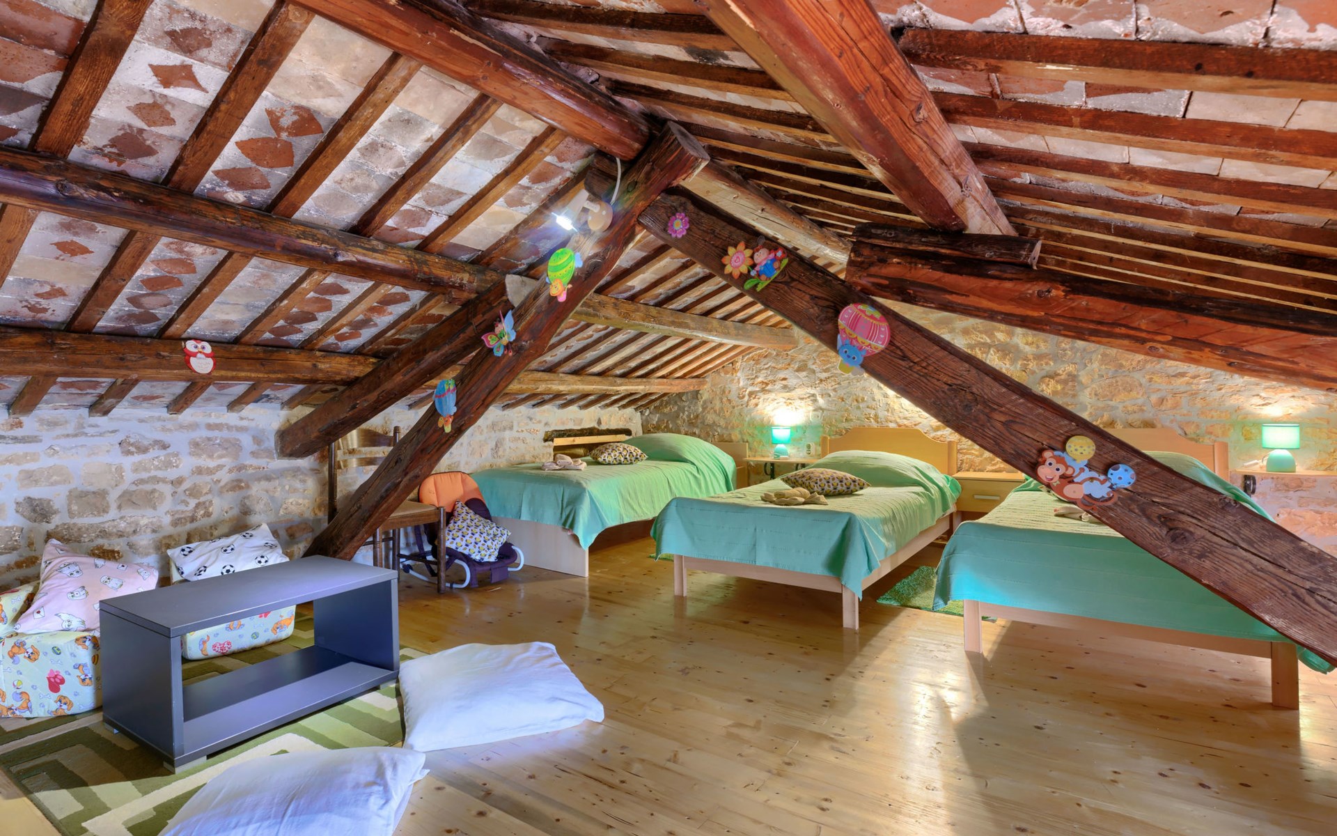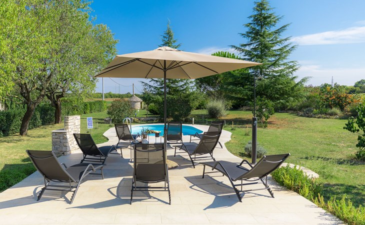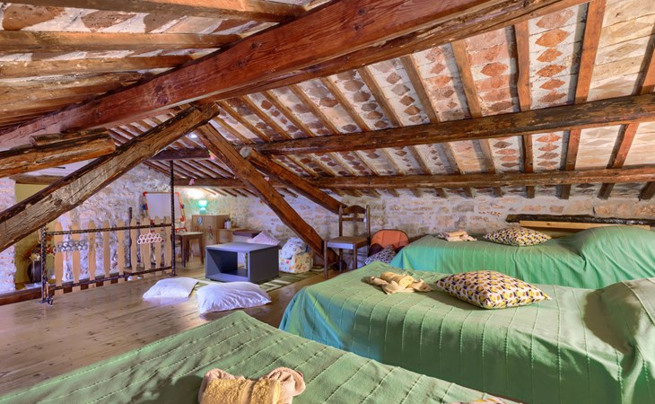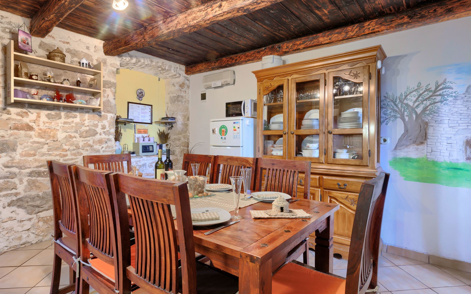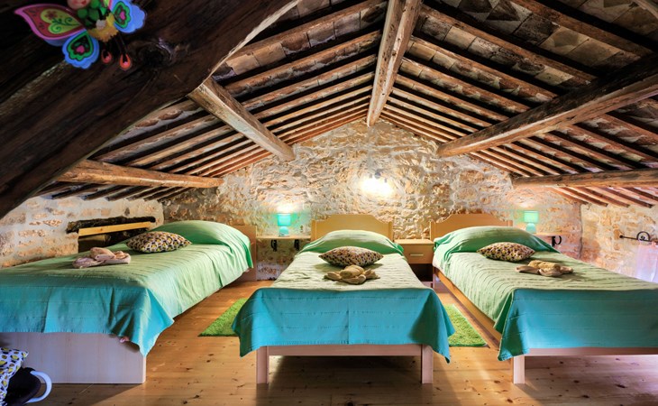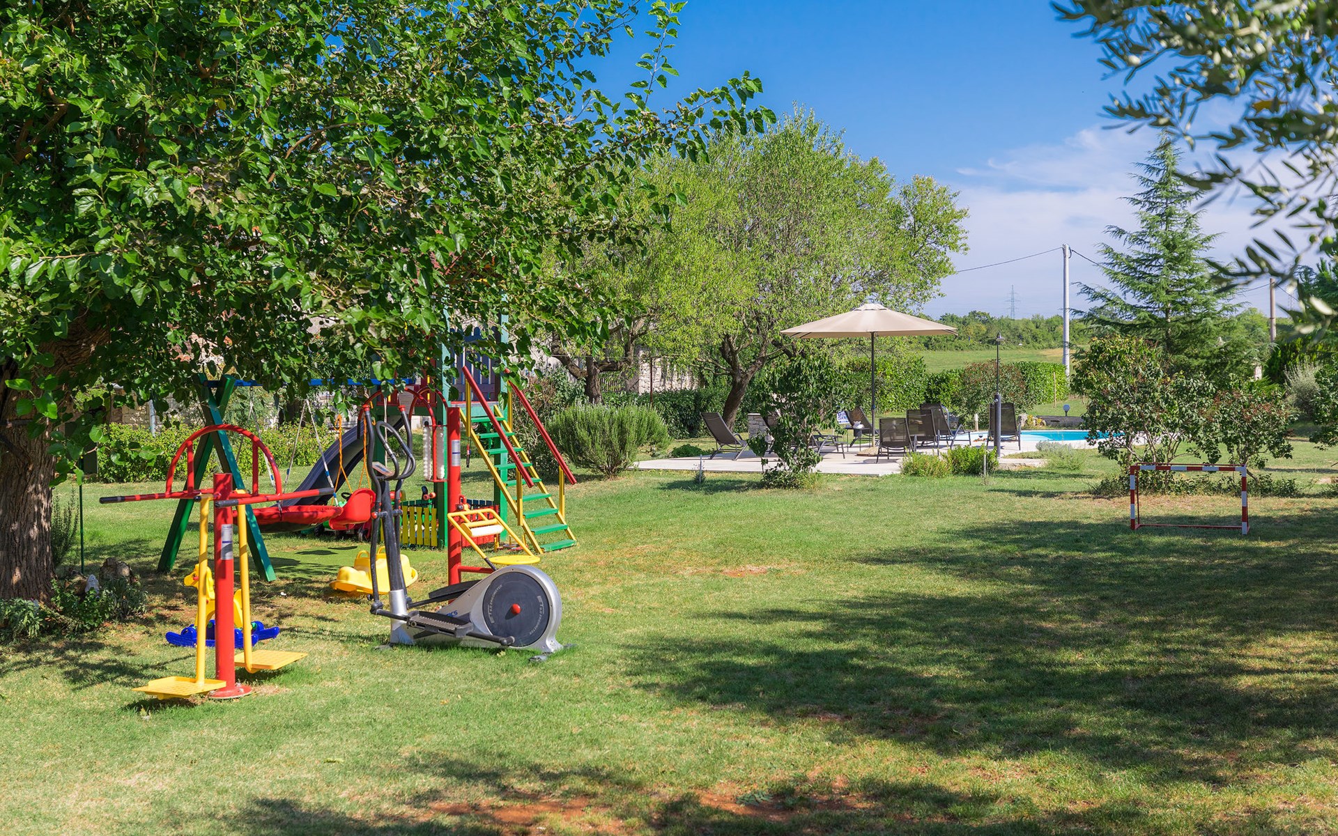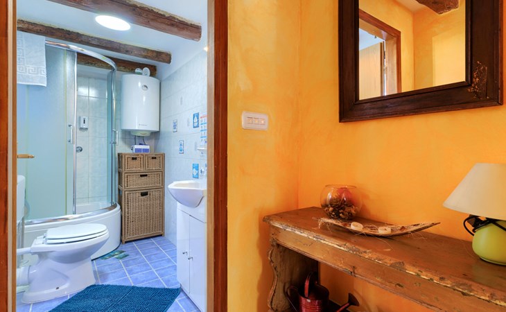 Semi-detached house "Bozac", 3 storeys, surrounded by meadows and fields. In the hamlet Guran 3 km from the centre of Vodnjan, 10 km from the sea. For shared use: property 2'000 m2, trees, meadow, swimming pool heated (8 x 5 m, seasonal availability: 01.May. - 01.Jun.). (swing, sandbox). Private: swimming pool (6 x 4 m, depth 130 cm, seasonal availability: 01.May. - 14.Oct.). Outdoor shower, terrace (16 m2), garden furniture, barbecue. In the house: internet access, washing machine. Available: bicycles (3) (extra). Breakfast and half board possible (extra). Parking (for 2 cars) on the premises. Supermarket 3 km, bus stop 3.2 km, pebble beach 10 km. The owner does not accept any youth groups. Local sale of farm products.