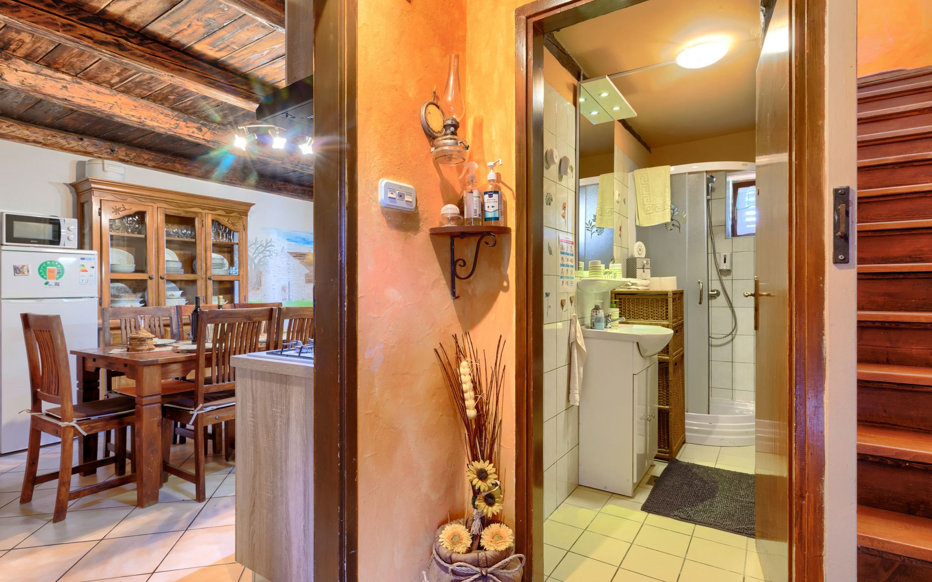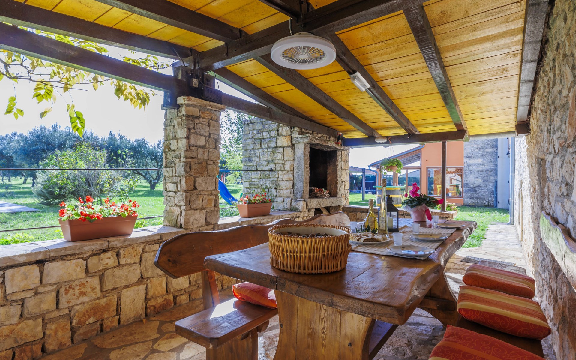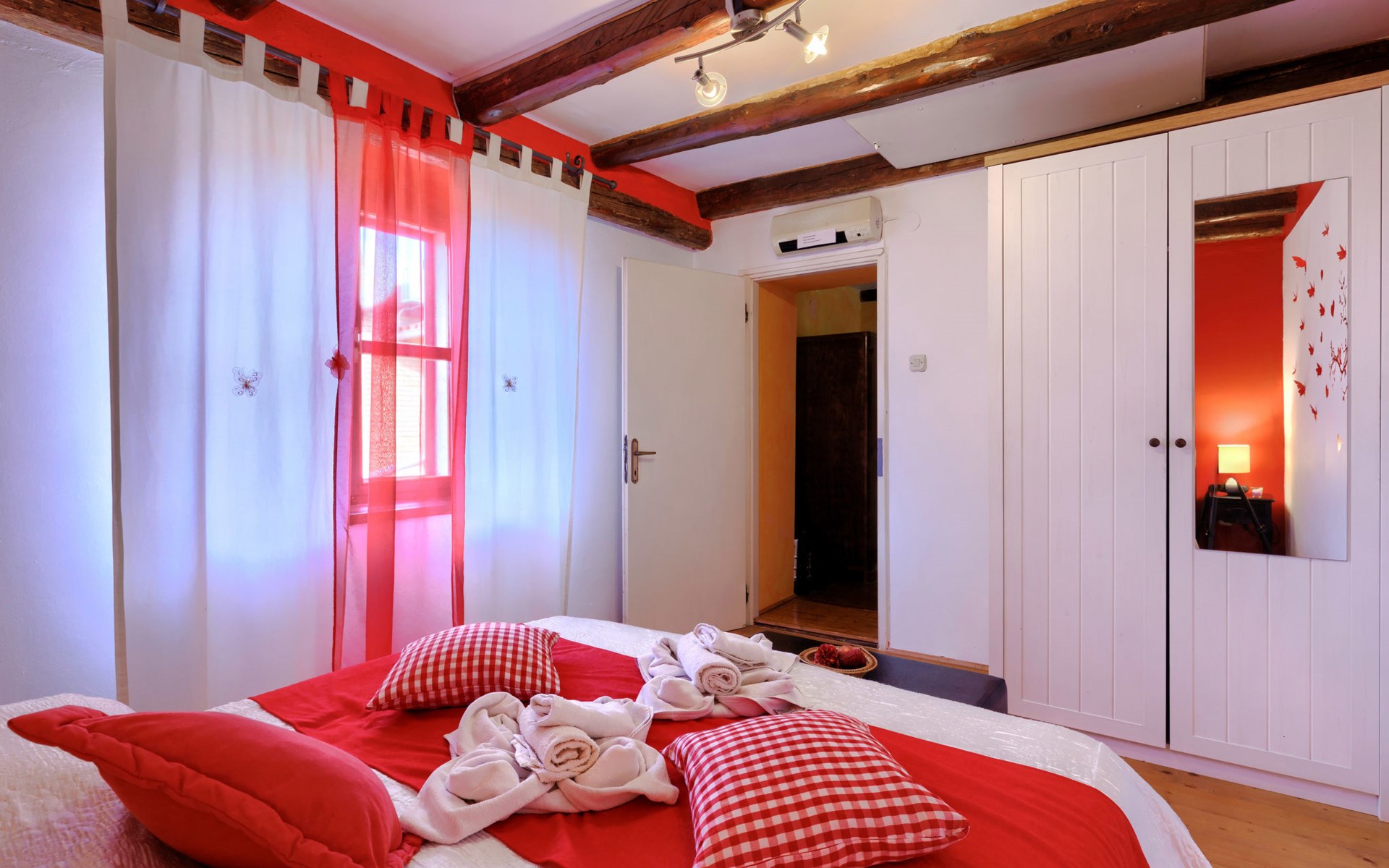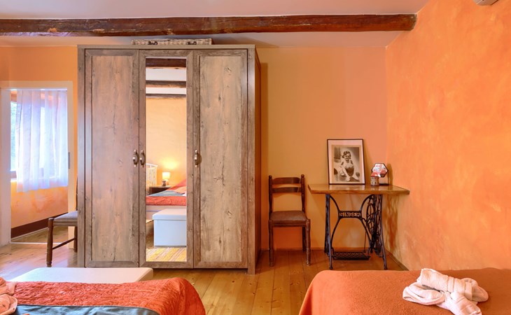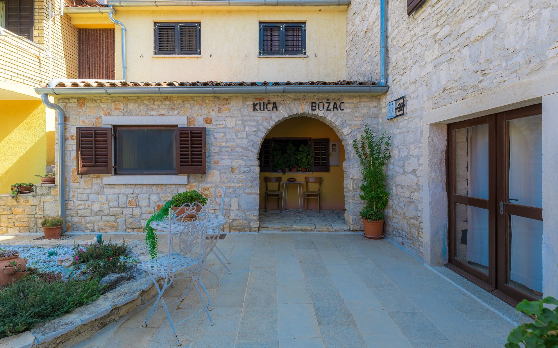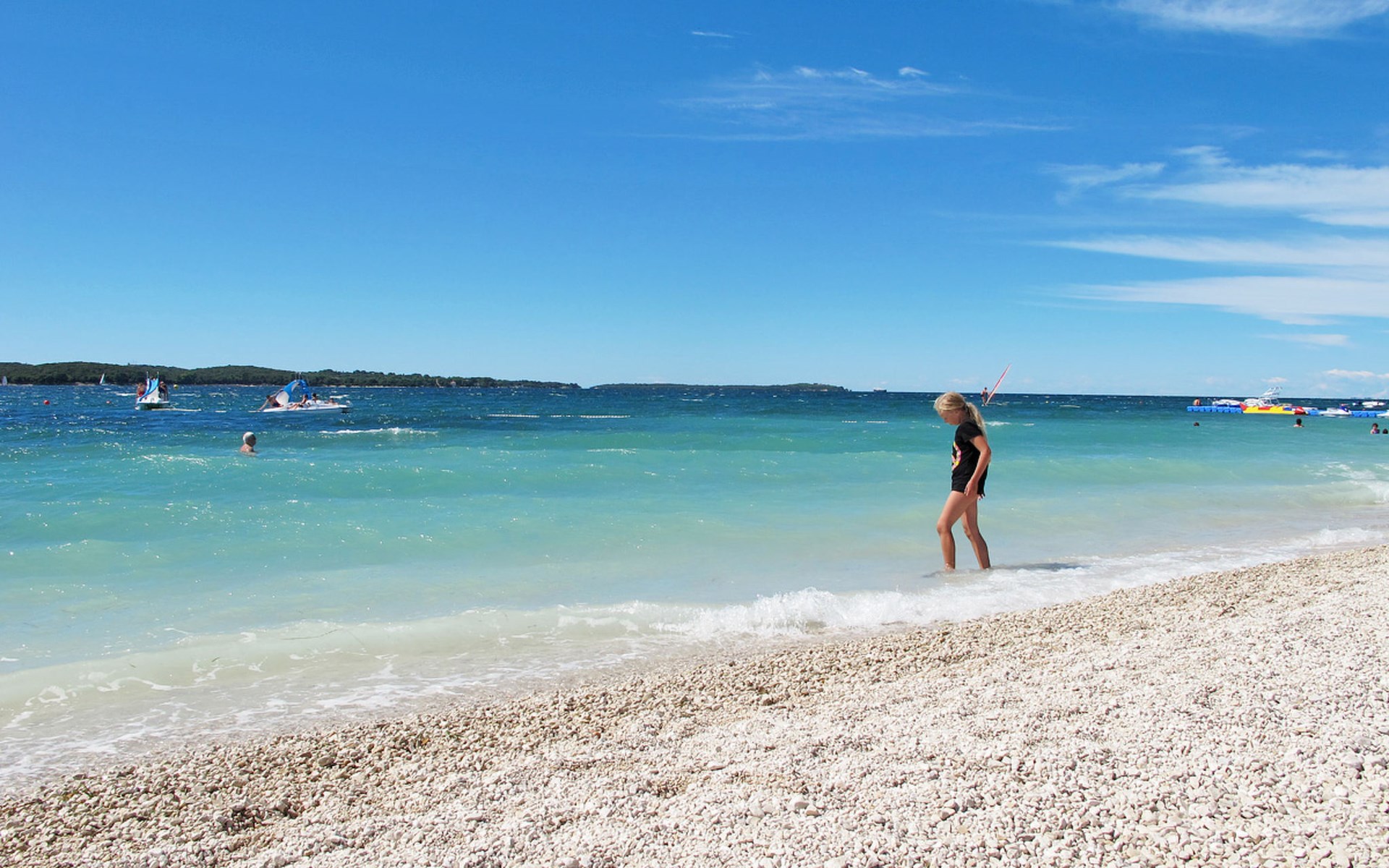 Semi-detached house "Bozac", 3 storeys, surrounded by meadows and fields. In the hamlet Guran 3 km from the centre of Vodnjan, 10 km from the sea. For shared use: property 2'000 m2, trees, meadow, swimming pool heated (8 x 5 m, seasonal availability: 01.May. - 01.Jun.). (swing, sandbox). Private: swimming pool (6 x 4 m, depth 130 cm, seasonal availability: 01.May. - 14.Oct.). Outdoor shower, terrace (16 m2), garden furniture, barbecue. In the house: internet access, washing machine. Available: bicycles (3) (extra). Breakfast and half board possible (extra). Parking (for 2 cars) on the premises. Supermarket 3 km, bus stop 3.2 km, pebble beach 10 km. The owner does not accept any youth groups. Local sale of farm products.