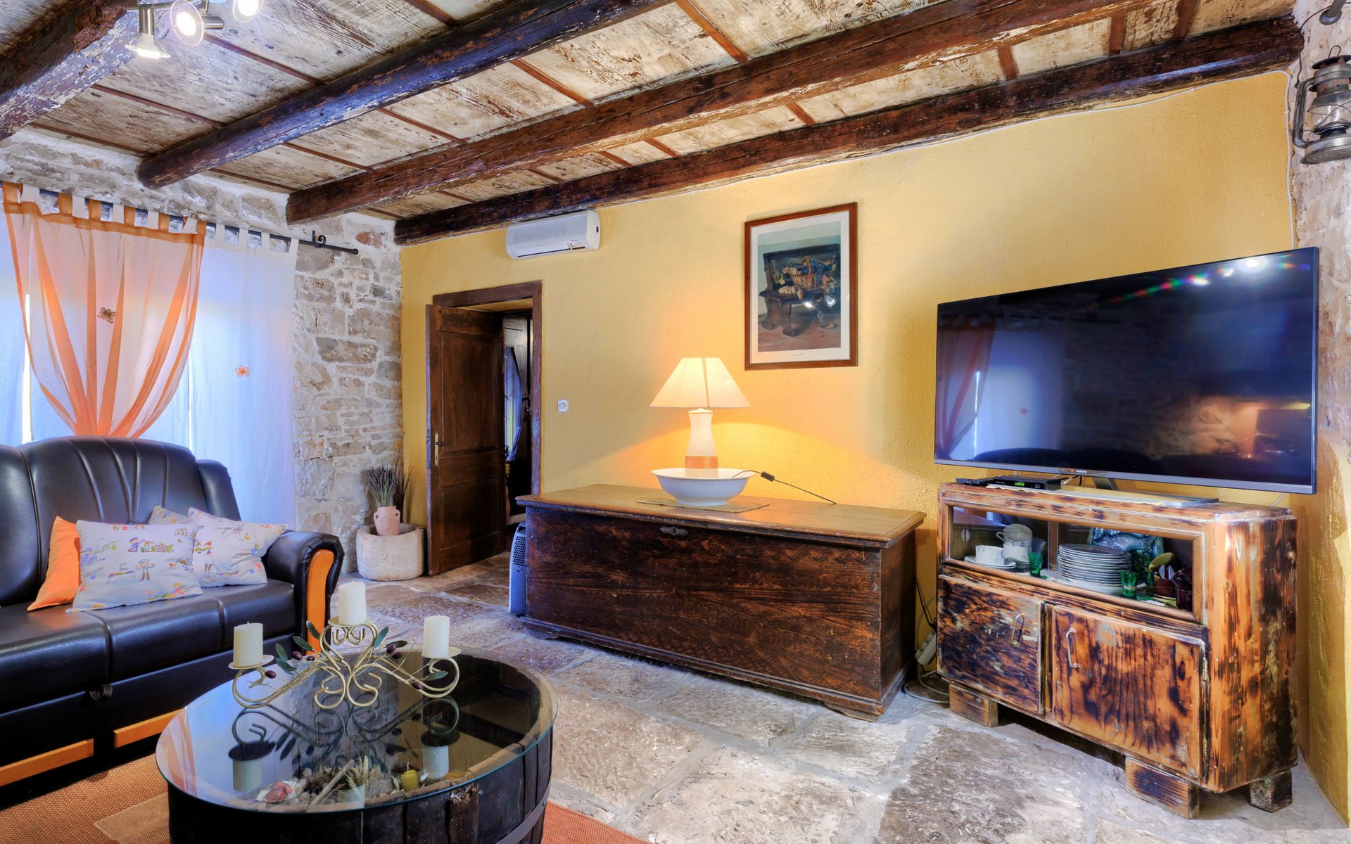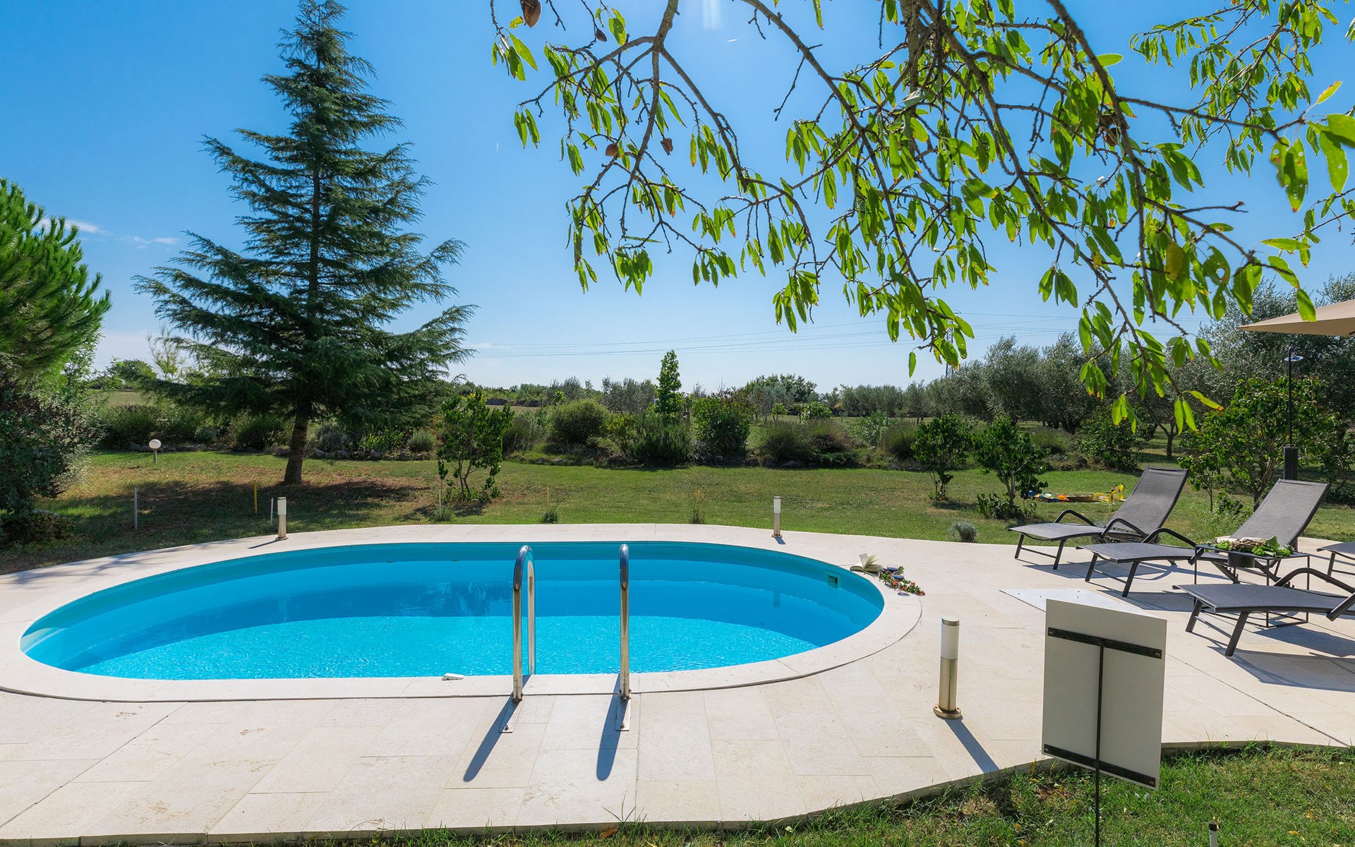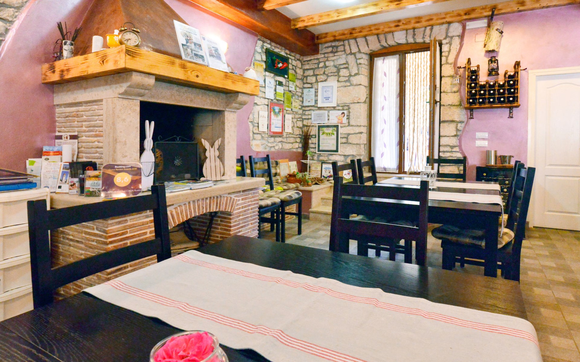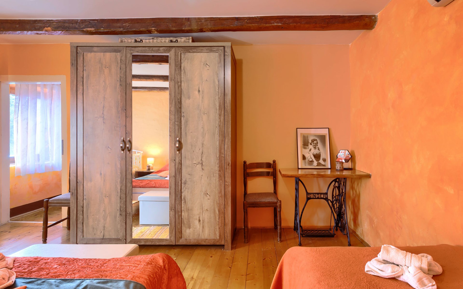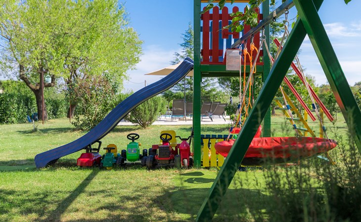 Semi-detached house "Bozac", 3 storeys, surrounded by meadows and fields. In the hamlet Guran 3 km from the centre of Vodnjan, 10 km from the sea. For shared use: property 2'000 m2, trees, meadow, swimming pool heated (8 x 5 m, seasonal availability: 01.May. - 01.Jun.). (swing, sandbox). Private: swimming pool (6 x 4 m, depth 130 cm, seasonal availability: 01.May. - 14.Oct.). Outdoor shower, terrace (16 m2), garden furniture, barbecue. In the house: internet access, washing machine. Available: bicycles (3) (extra). Breakfast and half board possible (extra). Parking (for 2 cars) on the premises. Supermarket 3 km, bus stop 3.2 km, pebble beach 10 km. The owner does not accept any youth groups. Local sale of farm products.
