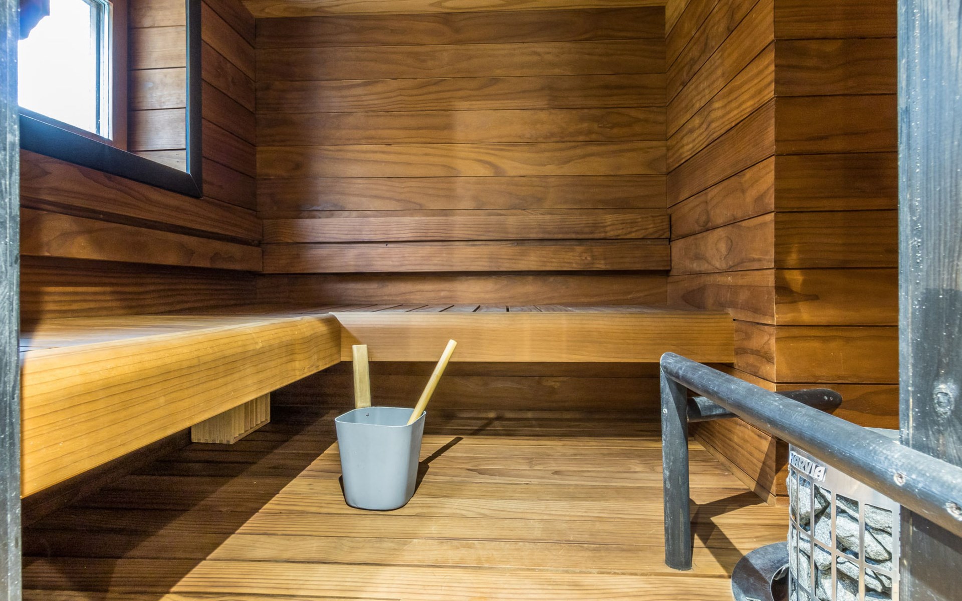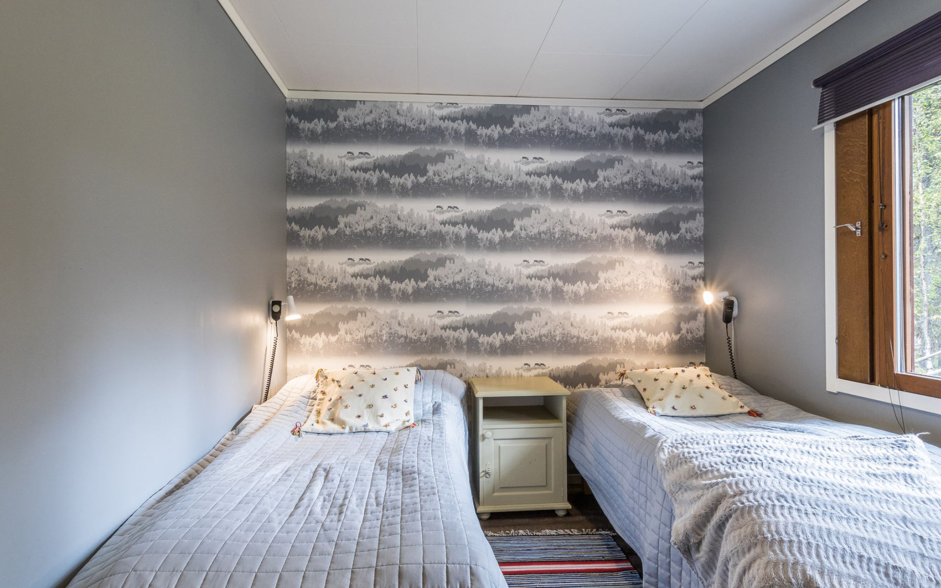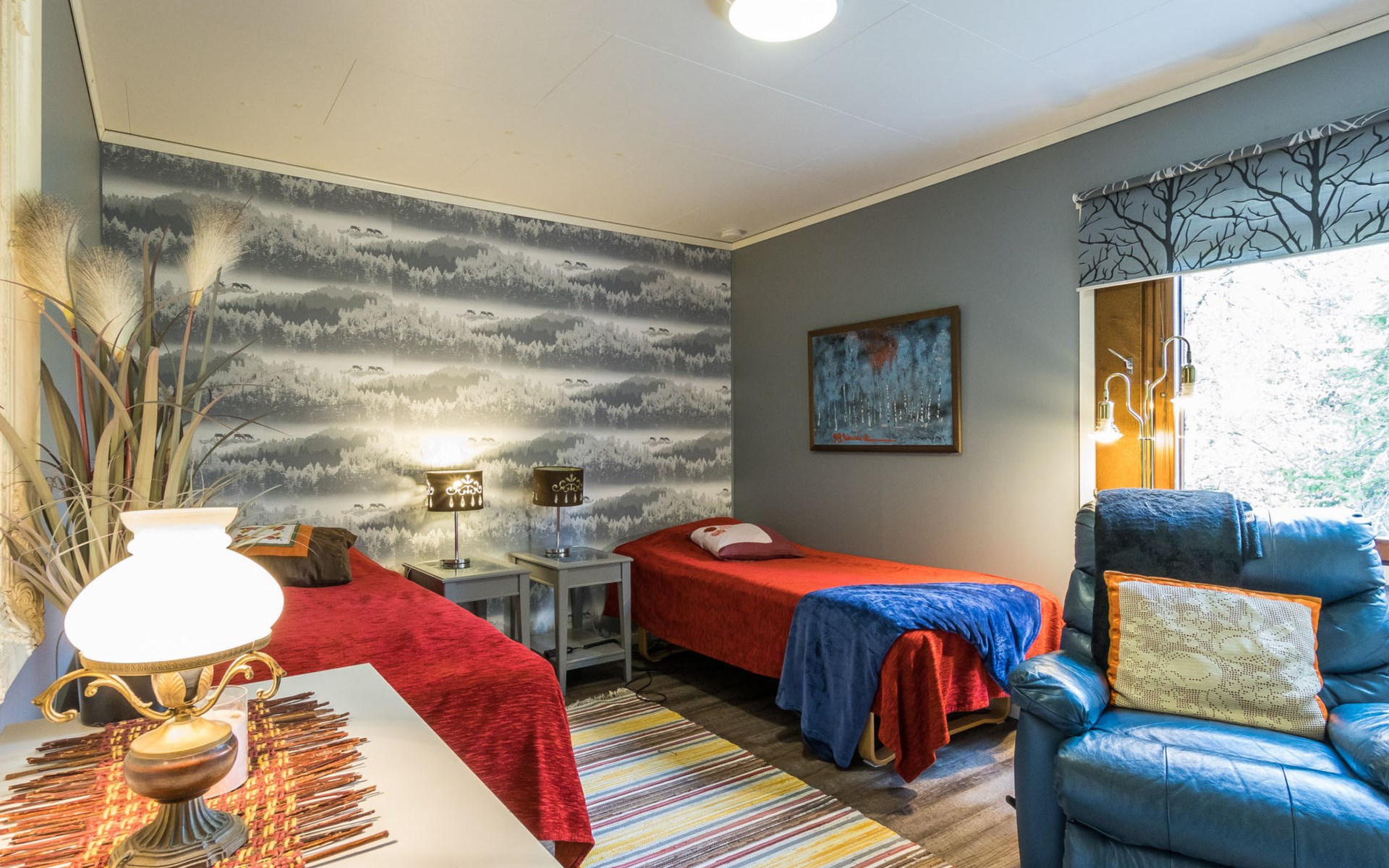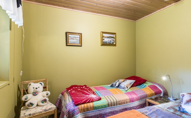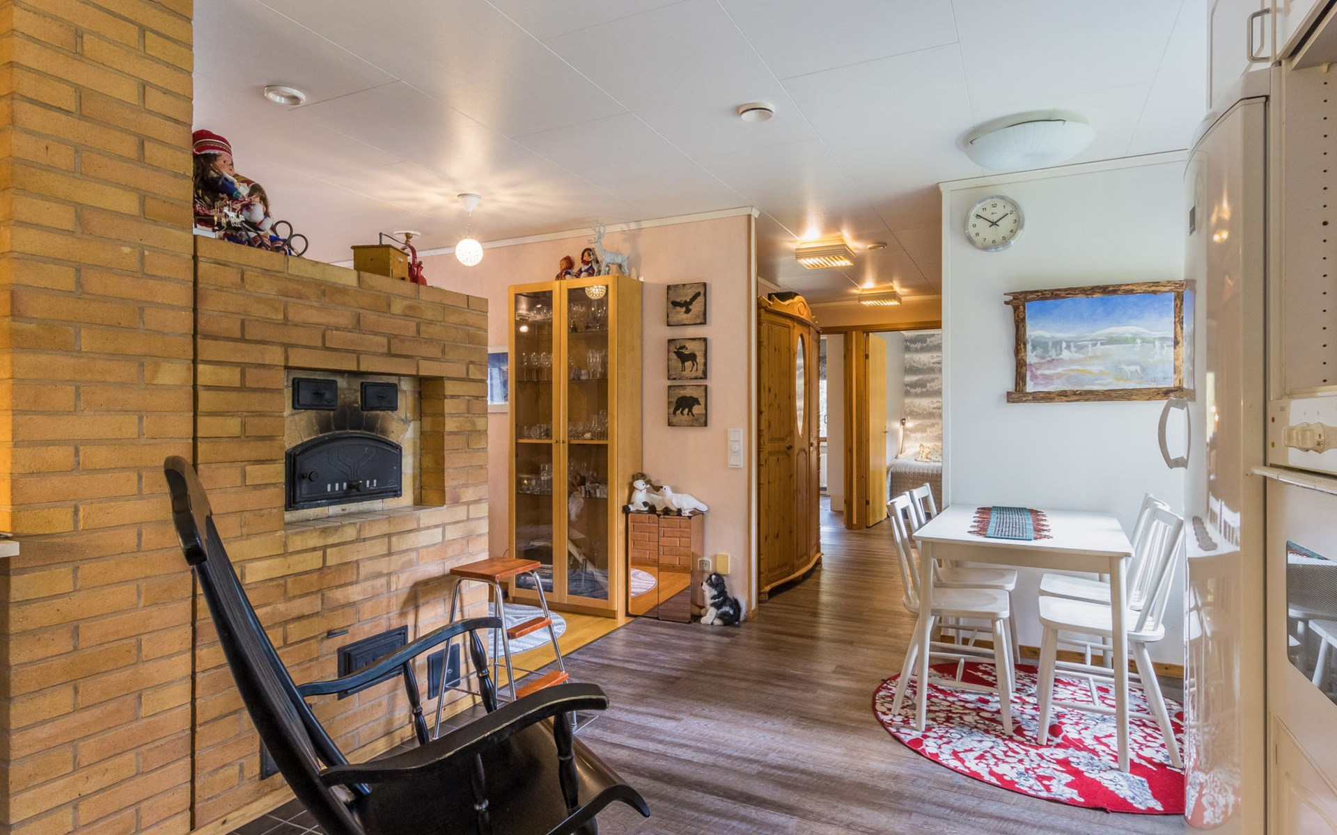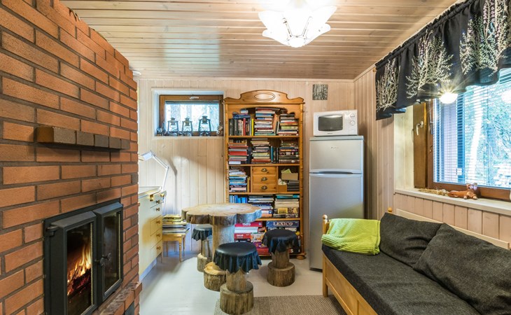 The ground floor offers bedroom with two single beds a cozy living area with a fireplace, a sauna with an electric stove, a shower, and a separate toilet. The bathroom and sauna were renovated in January 2020, and the bedrooms were updated in 2022.