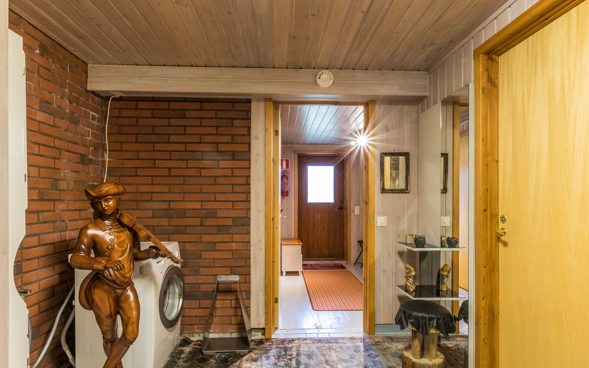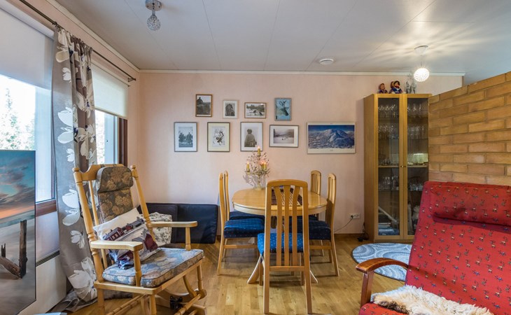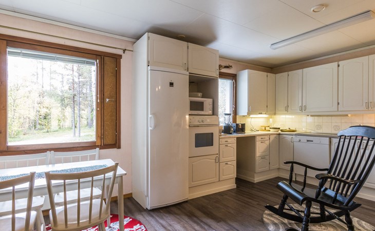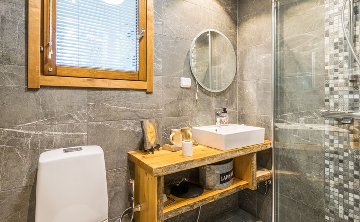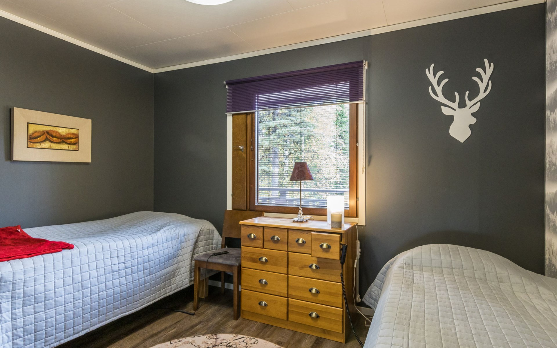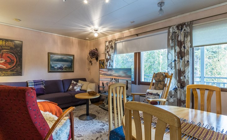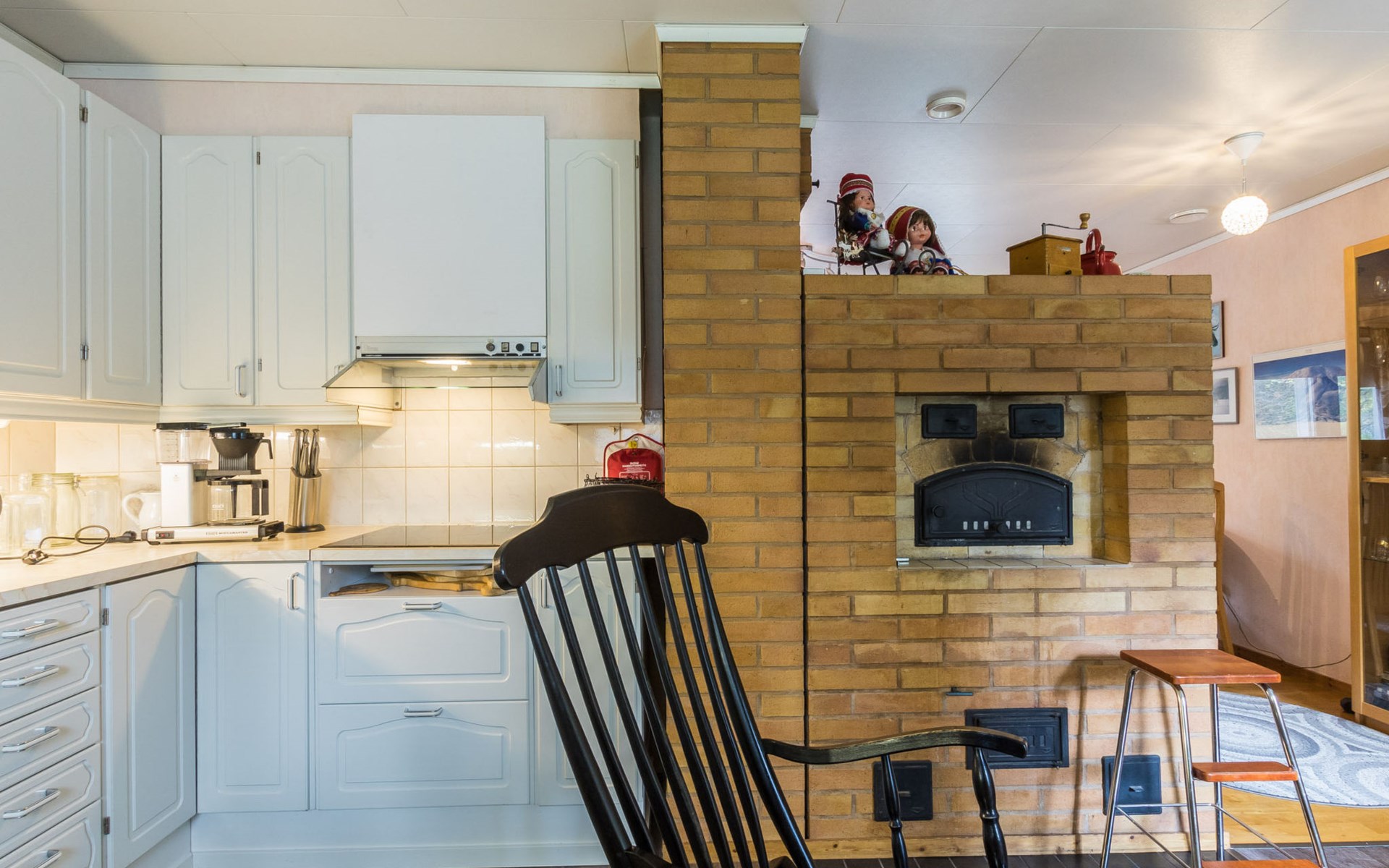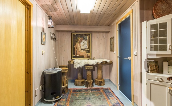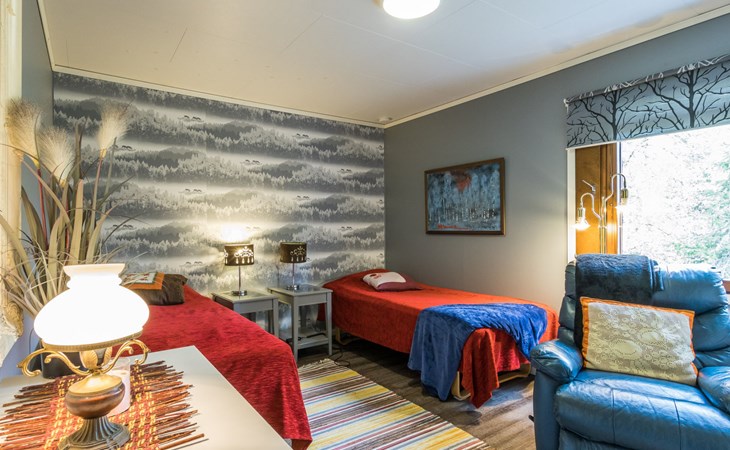 The ground floor offers bedroom with two single beds a cozy living area with a fireplace, a sauna with an electric stove, a shower, and a separate toilet. The bathroom and sauna were renovated in January 2020, and the bedrooms were updated in 2022.