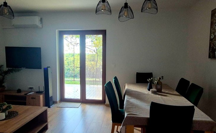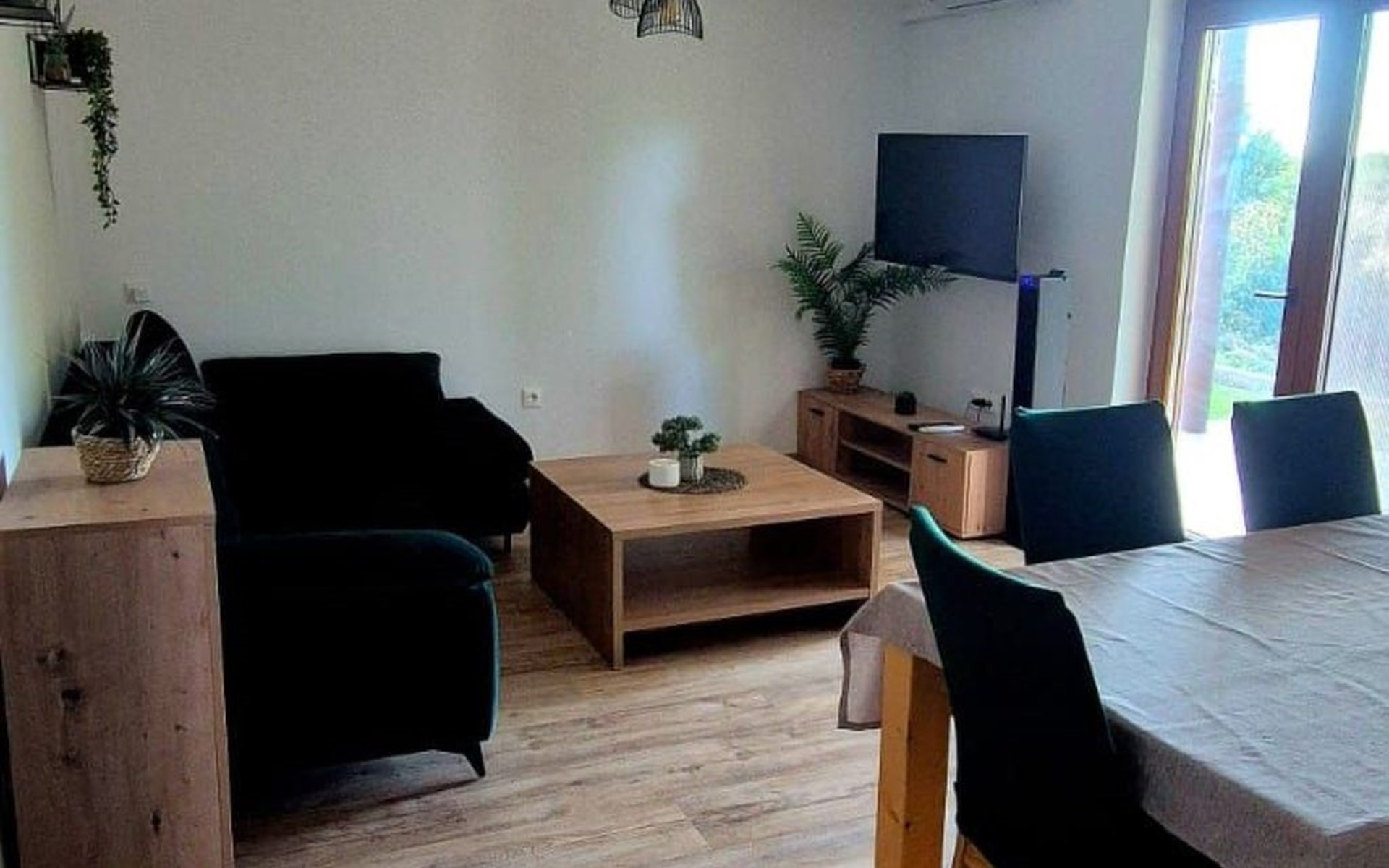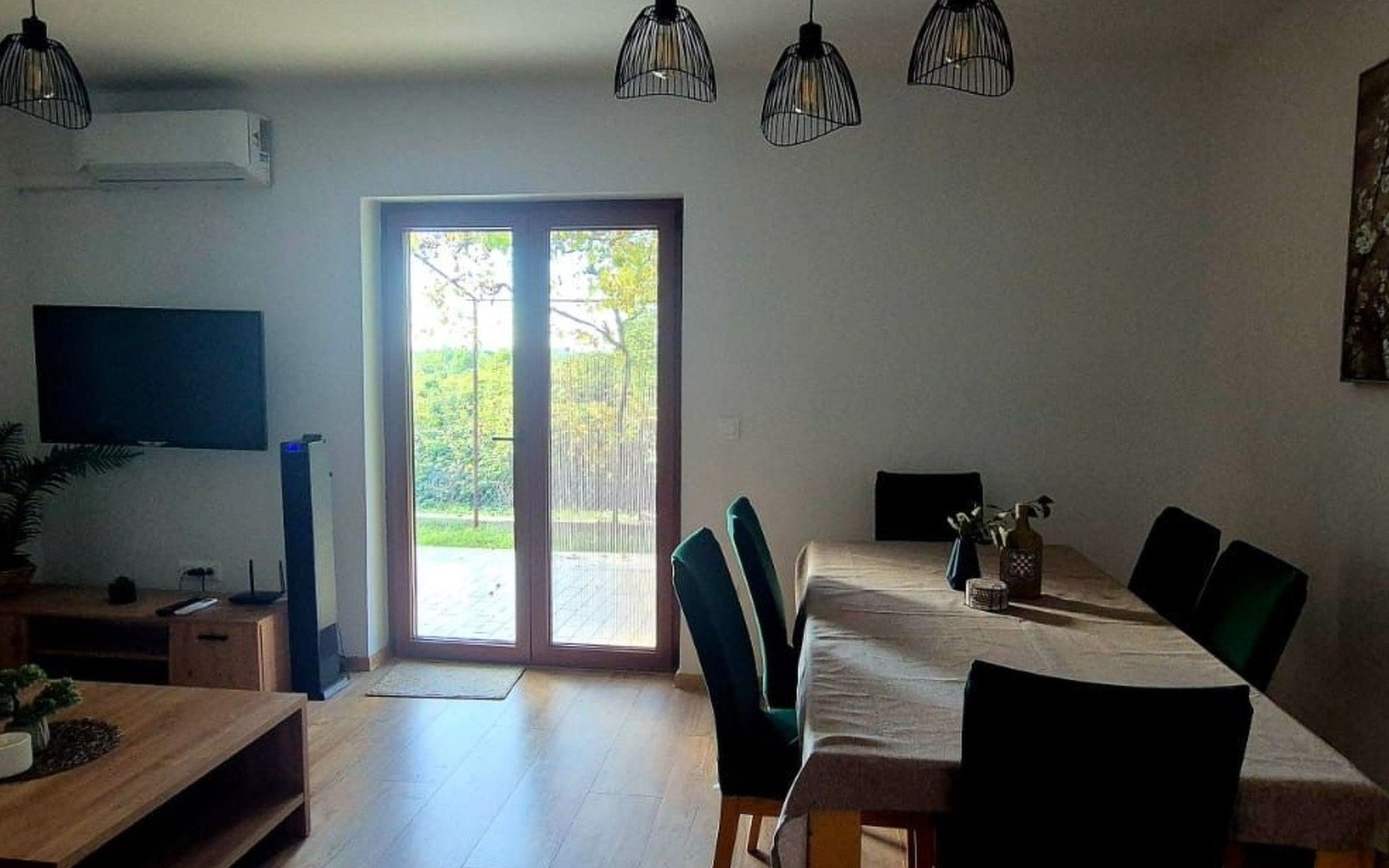 From the living room, you can access the covered terrace with outdoor furniture, perfect for morning coffee, outdoor dining, or evening relaxation.