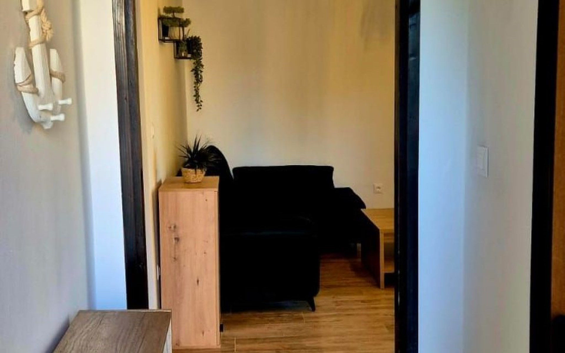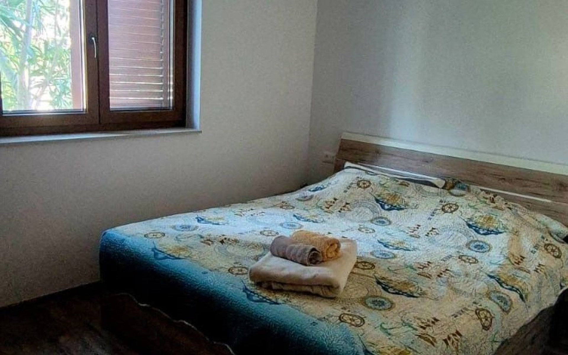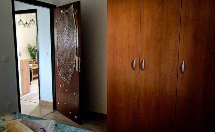 The apartment has two bedrooms – one with a double bed and the other with two separate beds, and the bathroom is modern and equipped with a washing machine and a walk-in shower.