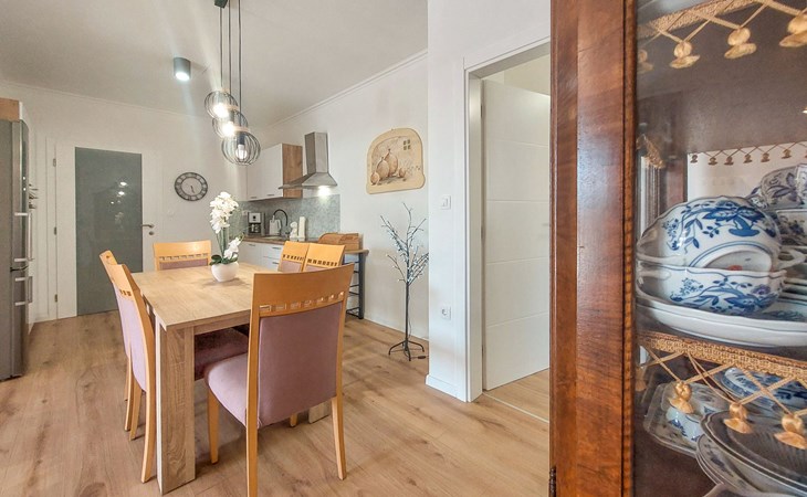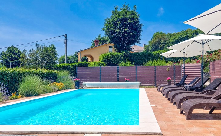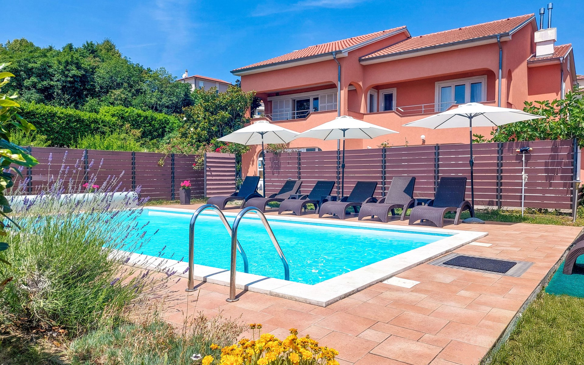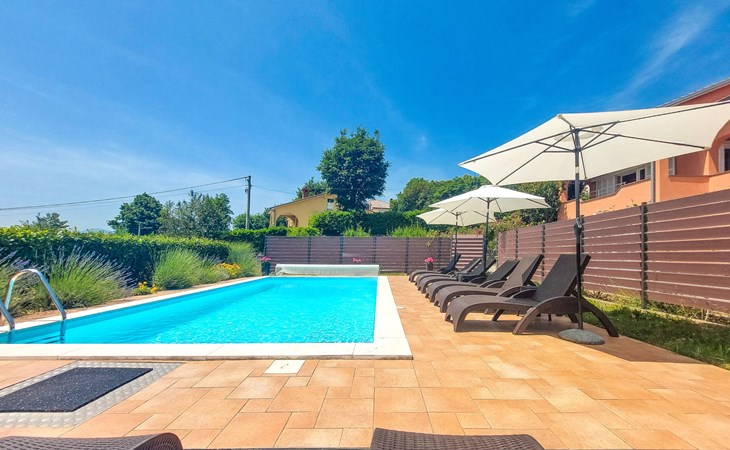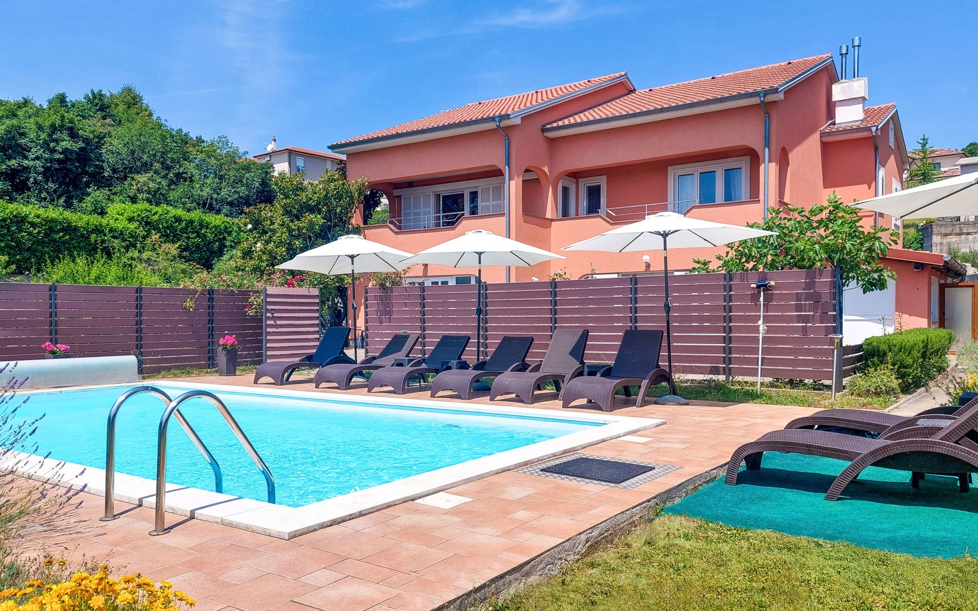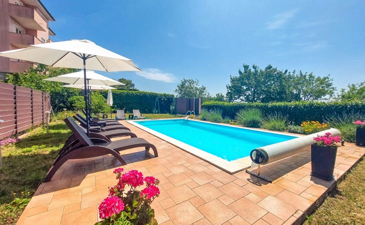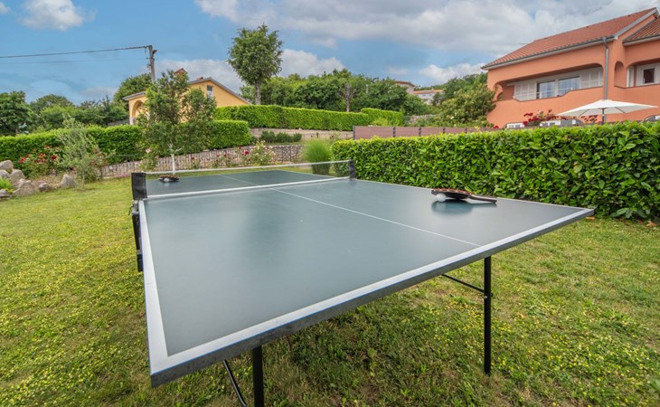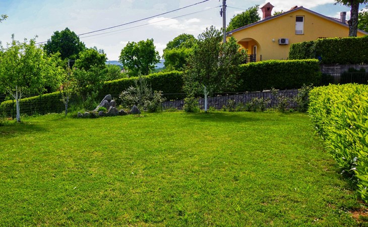 Kastav 6 km from Opatija: Comfortable 2-family house "Adrian". In the hamlet Krajevac 3 km from the centre of Viškovo, 3.3 km from the centre of Kastav, 9 km from the centre of Opatija, in a sunny position, 8 km from the sea. For shared use: property 2'000 m2 (fenced), well-kept garden with lawn 300 m2, flowers, swimming pool angular with privacy (8 x 4 m, depth 140 cm, seasonal availability: 15.May. - 20.Sep.). WC in the pool area, outdoor shower, poolhouse with fridge, table tennis, barbecue, children's playground (swing), pool maintenance by the owner/gardener. In the house: internet access. Parking at the house on the premises. Supermarket 3 km, shopping centre 3 km, restaurant 2.5 km, bakery 3 km, café 3 km, bus stop 500 m, pebble beach 8 km (small), public bathing area 10 km, concrete beach 8 km. Groups of teenagers on request only.