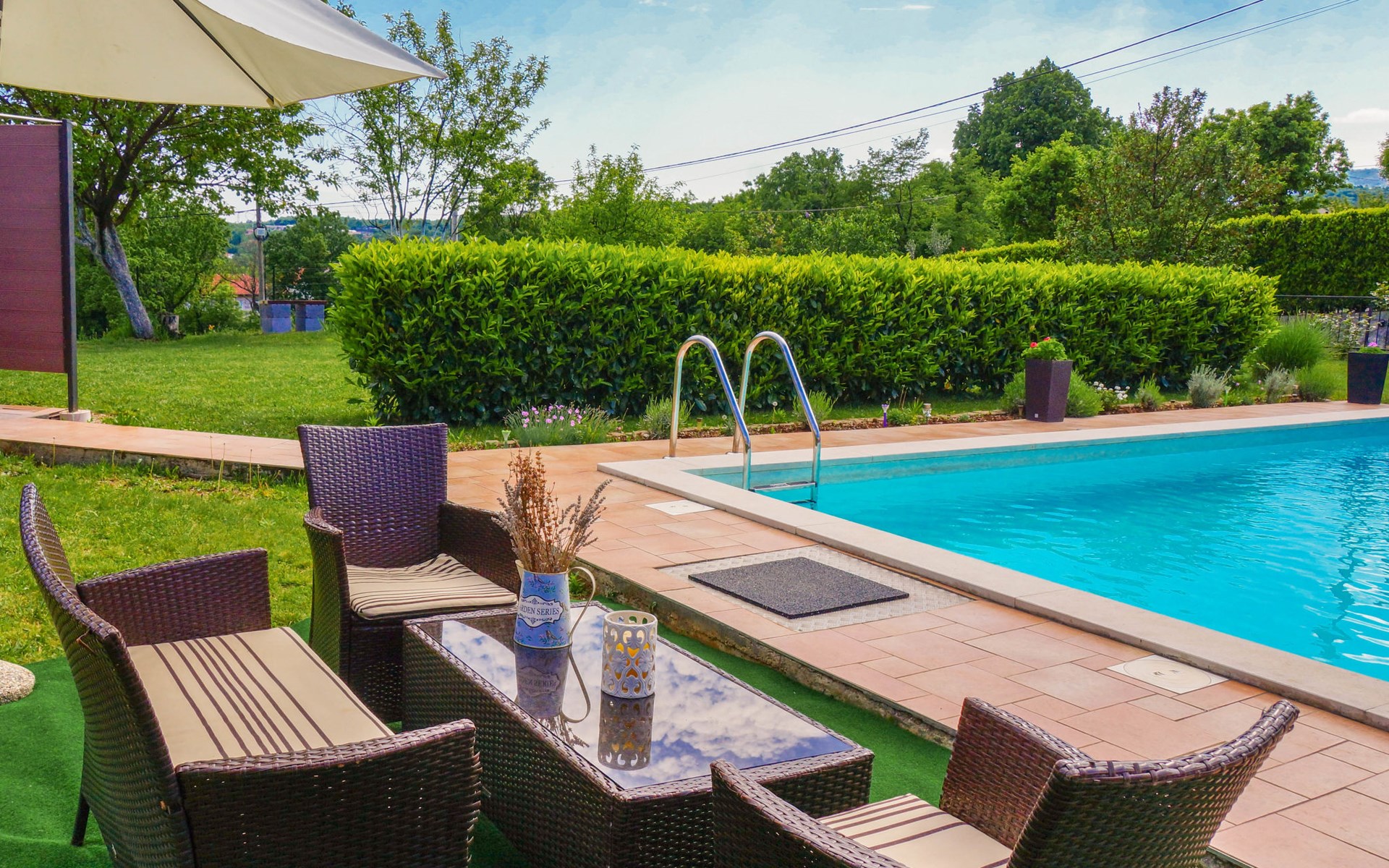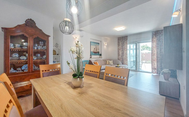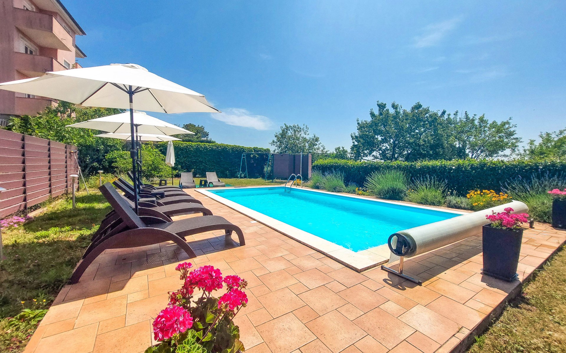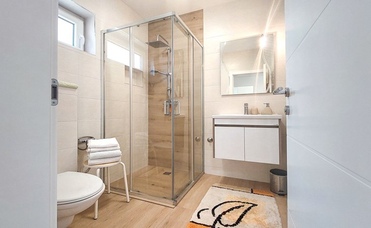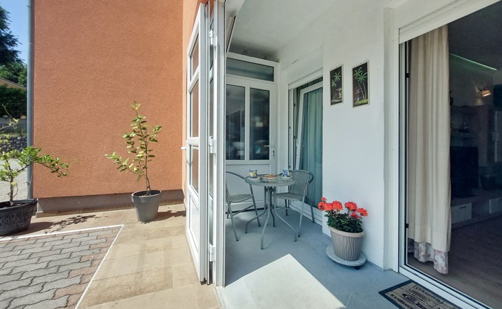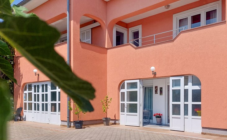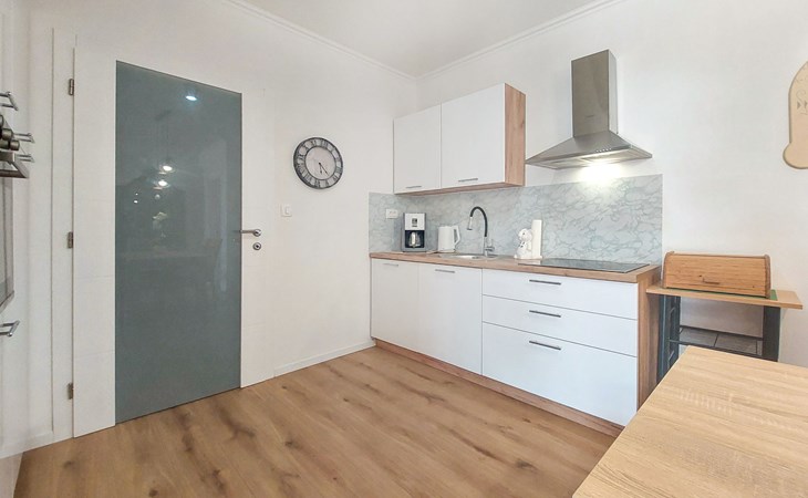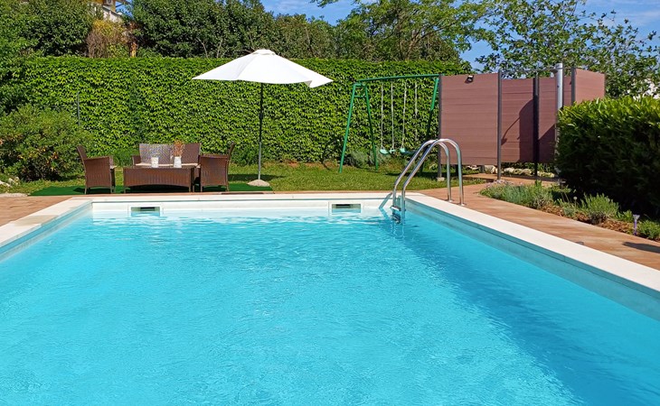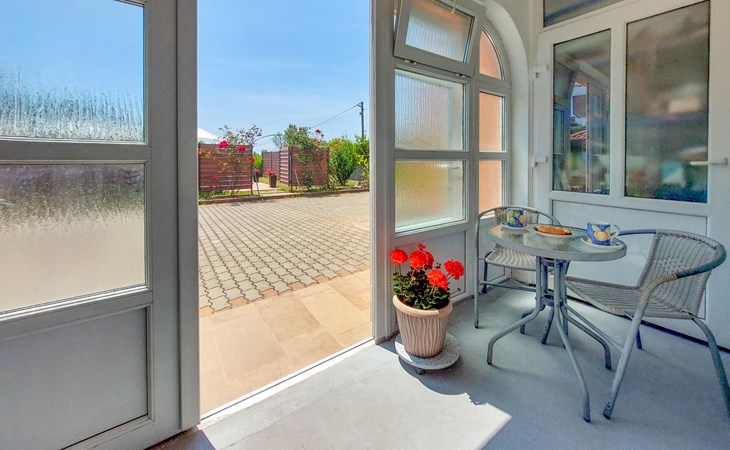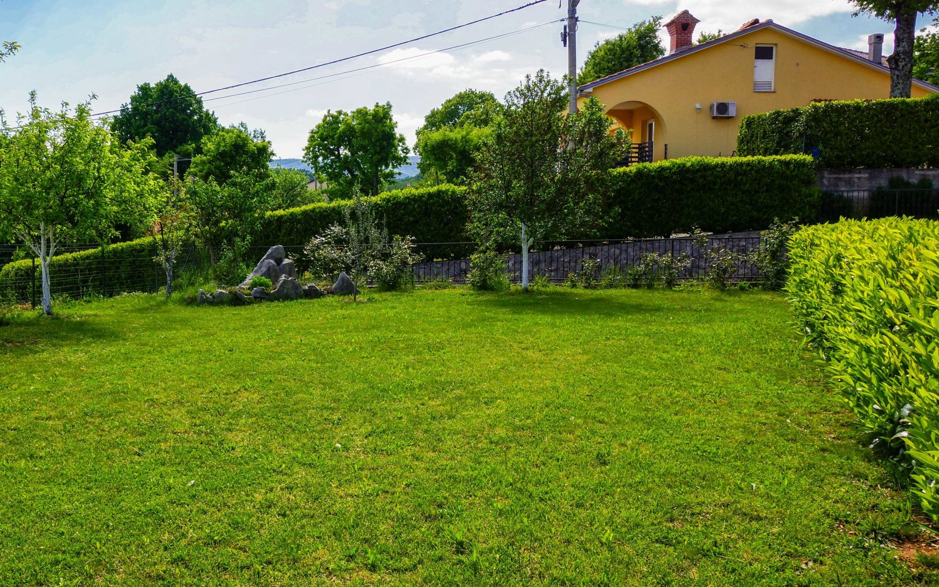Kastav 6 km from Opatija: Comfortable 2-family house "Adrian". In the hamlet Krajevac 3 km from the centre of Viškovo, 3.3 km from the centre of Kastav, 9 km from the centre of Opatija, in a sunny position, 8 km from the sea. For shared use: property 2'000 m2 (fenced), well-kept garden with lawn 300 m2, flowers, swimming pool angular with privacy (8 x 4 m, depth 140 cm, seasonal availability: 15.May. - 20.Sep.). WC in the pool area, outdoor shower, poolhouse with fridge, table tennis, barbecue, children's playground (swing), pool maintenance by the owner/gardener. In the house: internet access. Parking at the house on the premises. Supermarket 3 km, shopping centre 3 km, restaurant 2.5 km, bakery 3 km, café 3 km, bus stop 500 m, pebble beach 8 km (small), public bathing area 10 km, concrete beach 8 km. Groups of teenagers on request only.