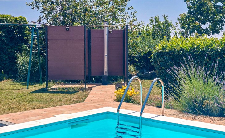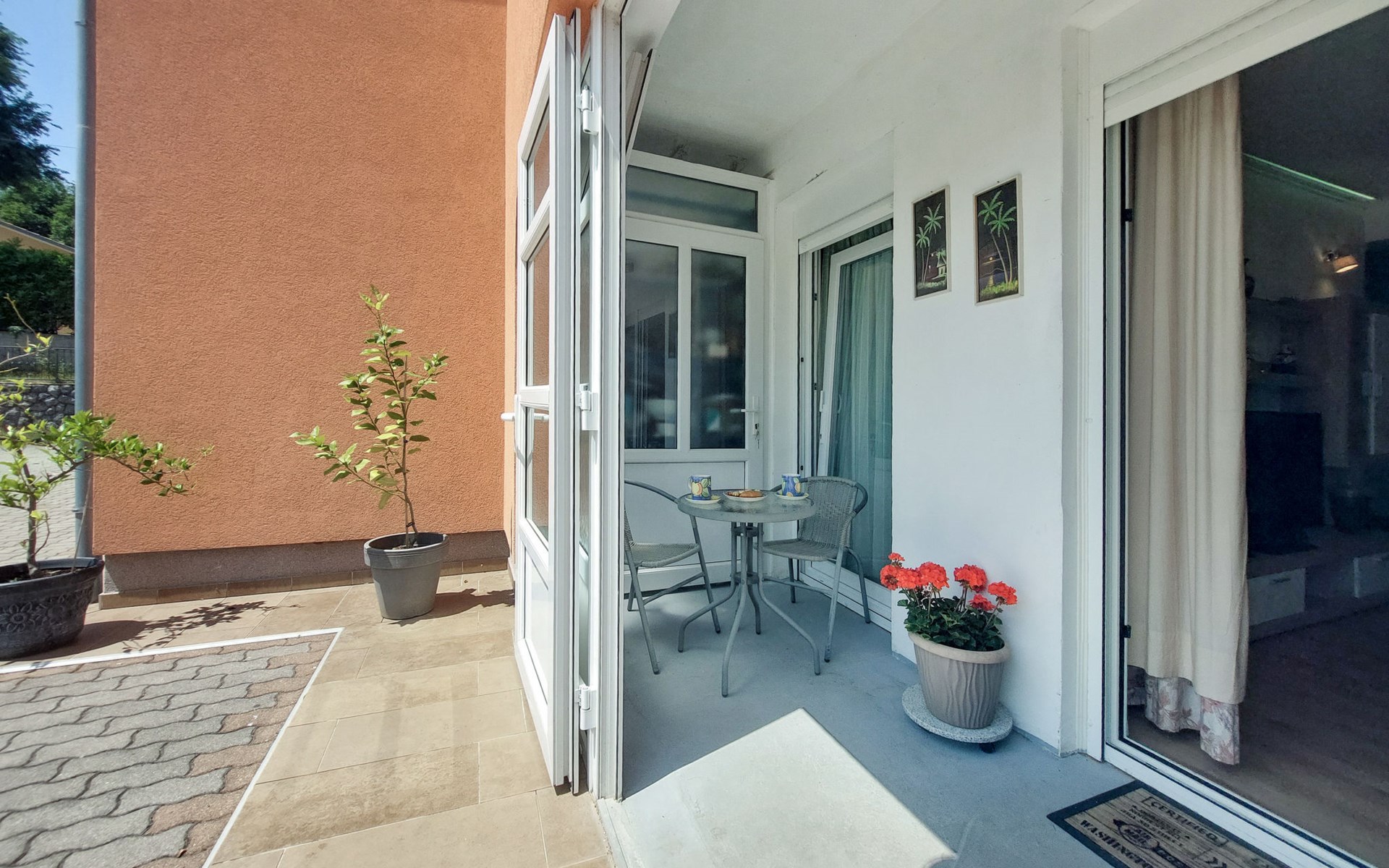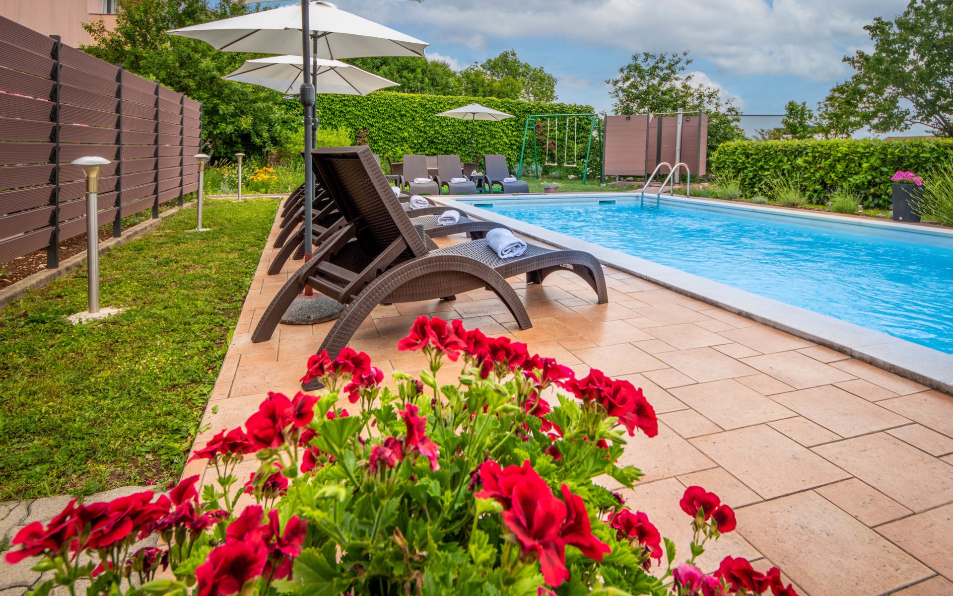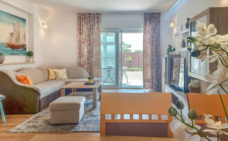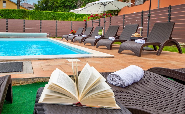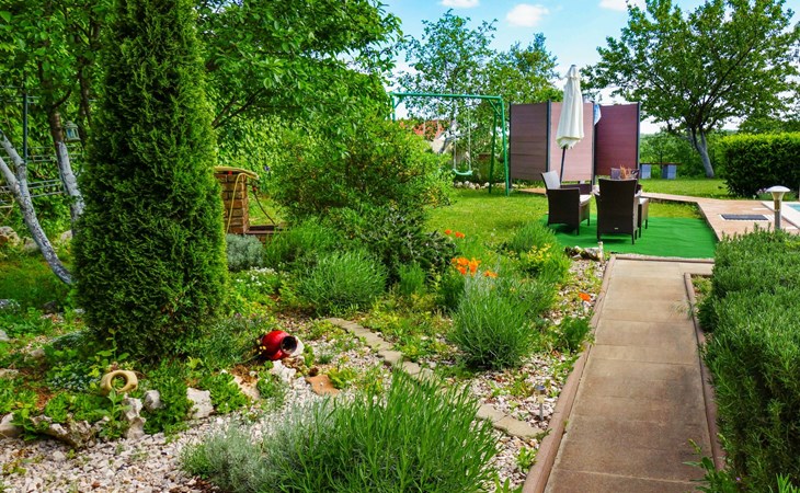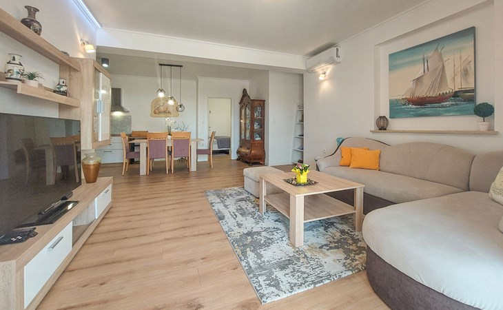 Kastav 6 km from Opatija: Comfortable 2-family house "Adrian". In the hamlet Krajevac 3 km from the centre of Viškovo, 3.3 km from the centre of Kastav, 9 km from the centre of Opatija, in a sunny position, 8 km from the sea. For shared use: property 2'000 m2 (fenced), well-kept garden with lawn 300 m2, flowers, swimming pool angular with privacy (8 x 4 m, depth 140 cm, seasonal availability: 15.May. - 20.Sep.). WC in the pool area, outdoor shower, poolhouse with fridge, table tennis, barbecue, children's playground (swing), pool maintenance by the owner/gardener. In the house: internet access. Parking at the house on the premises. Supermarket 3 km, shopping centre 3 km, restaurant 2.5 km, bakery 3 km, café 3 km, bus stop 500 m, pebble beach 8 km (small), public bathing area 10 km, concrete beach 8 km. Groups of teenagers on request only.
