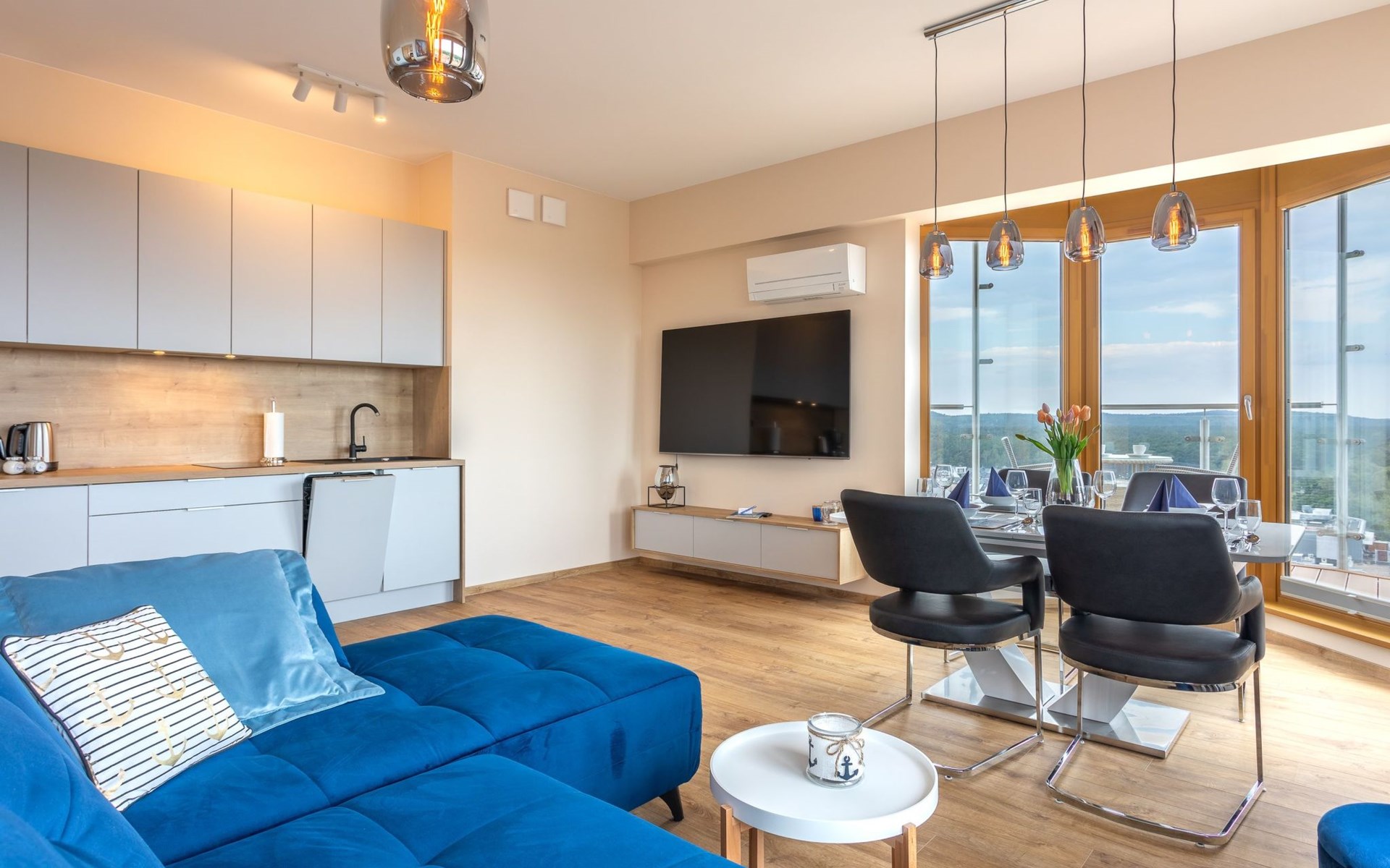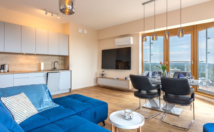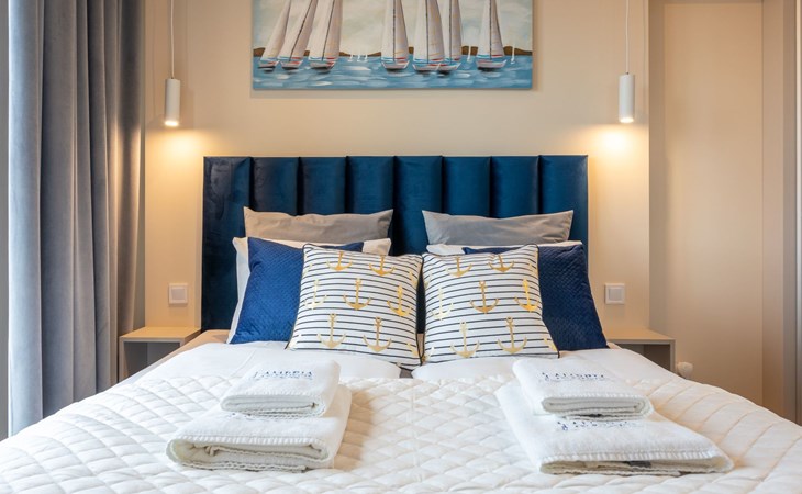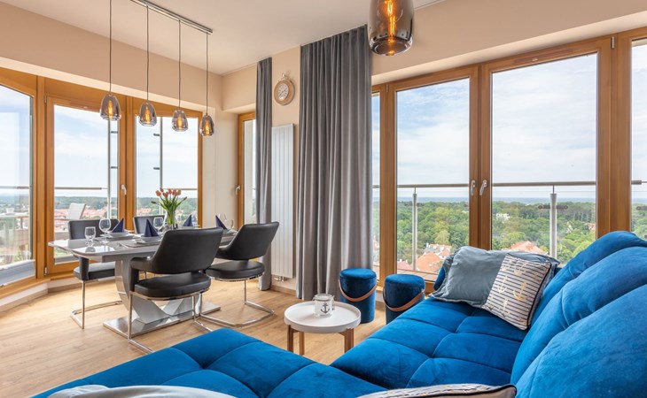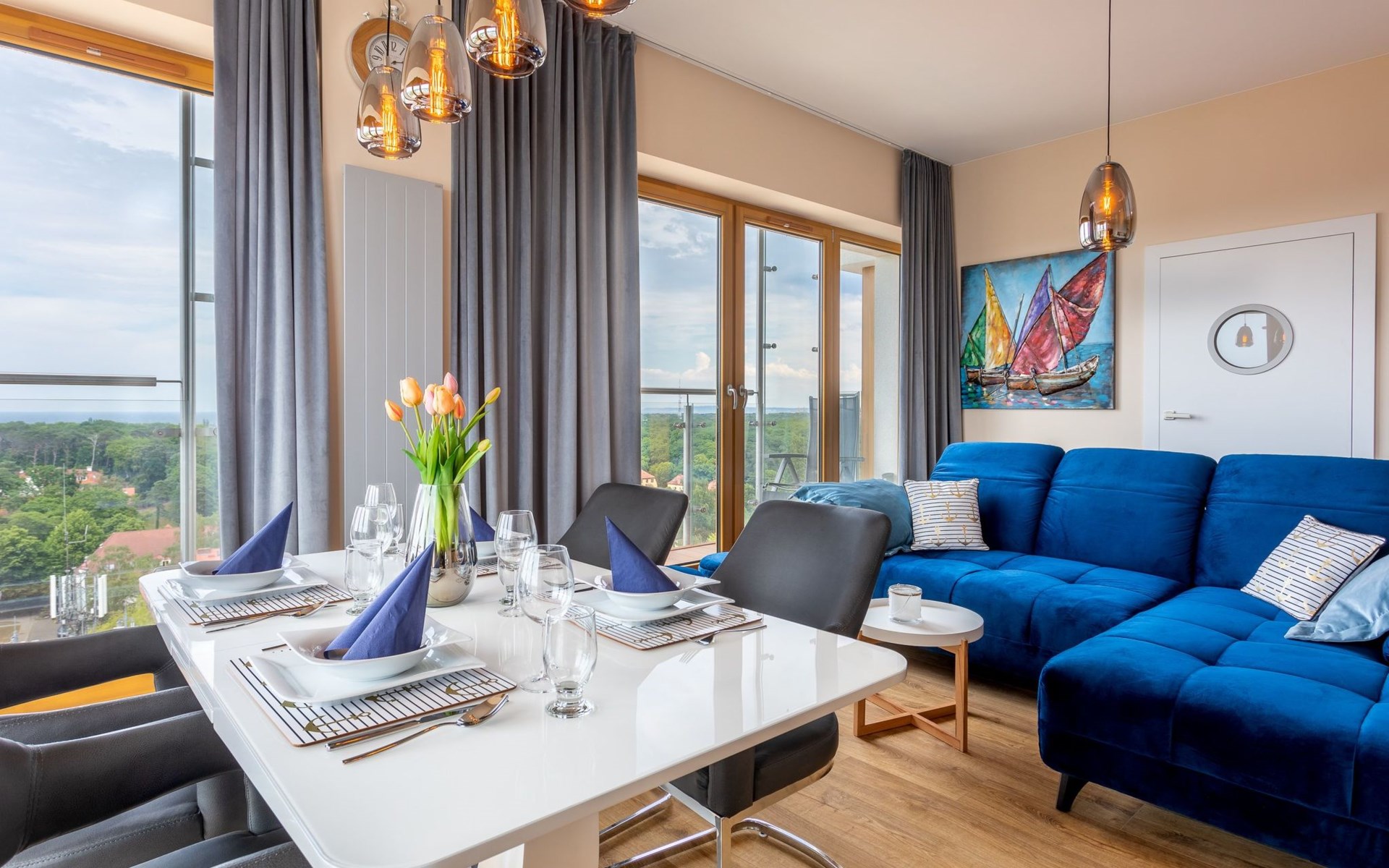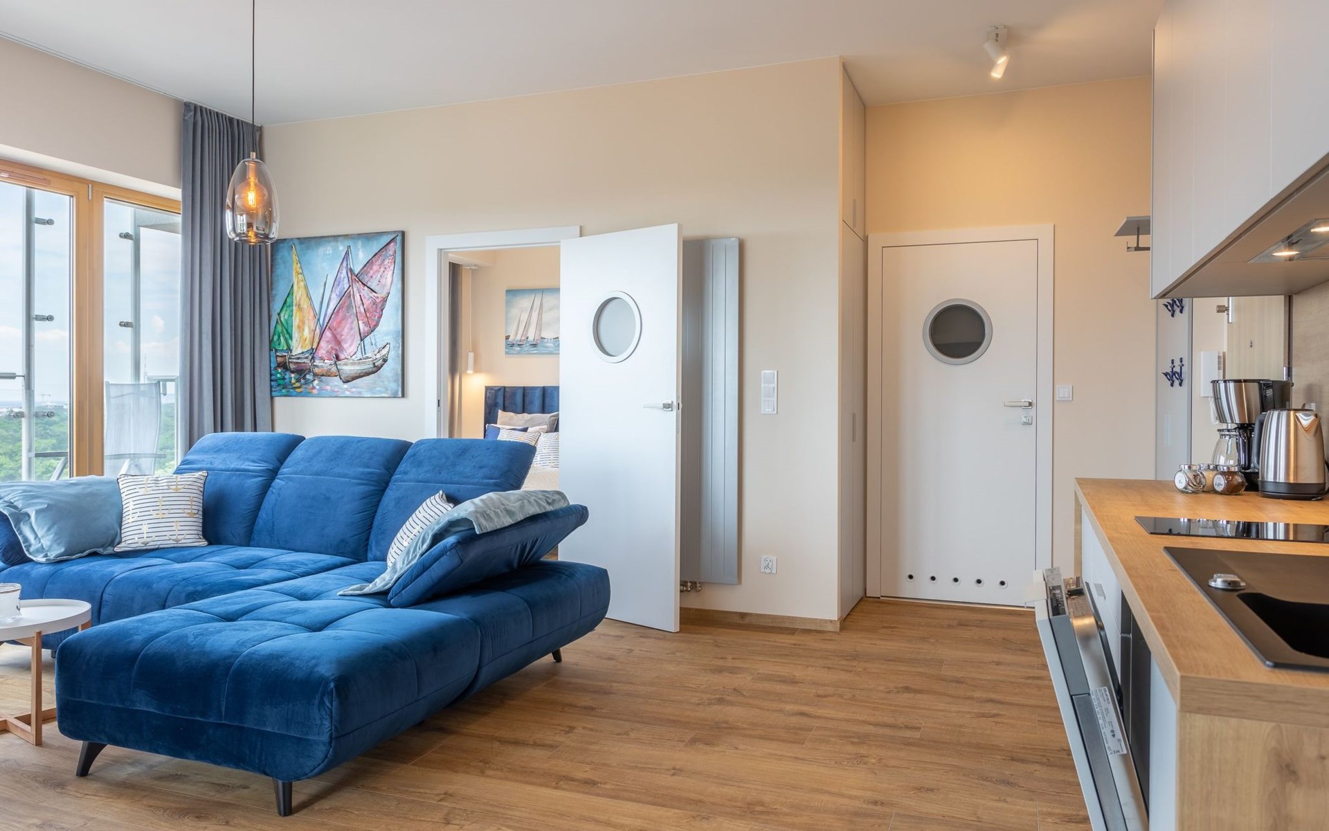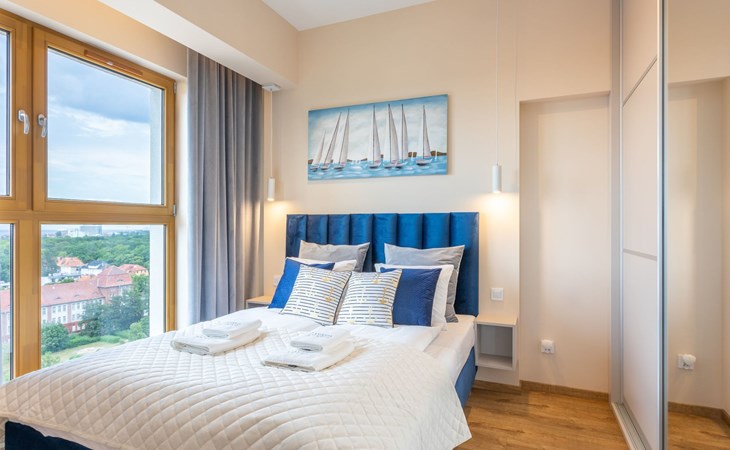 The "Tower 102" flat in Świnoujście is particularly appreciated by our guests for its excellent location, the highest quality of equipment and a breathtaking view of the Baltic Sea and the panorama of Świnoujście from the windows. It is an air-conditioned flat on the eleventh floor with one bedroom, a living room with a well-equipped kitchenette and a modern bathroom with a total area of 49 m2, as well as a large balcony, which is especially appreciated by guests because it allows moments of relaxation in the fresh air and at the same time in a quiet place. The interior is very bright, white, grey and beige dominate, evoking associations with sand, beach and sun, broken with a deep blue tone. In addition, thanks to the large and numerous glazed areas, a lot of daylight enters the interior, which also visually enlarges the space and gives it momentum. Attention is also drawn to expressive and very modern accessories as well as interesting shapes and textures - all with delicate and original marine motifs. The glazed doors, which echo the style of the windows in the ship's cabins, seem to be an extremely interesting solution. Without a doubt, you must go on board this deck!