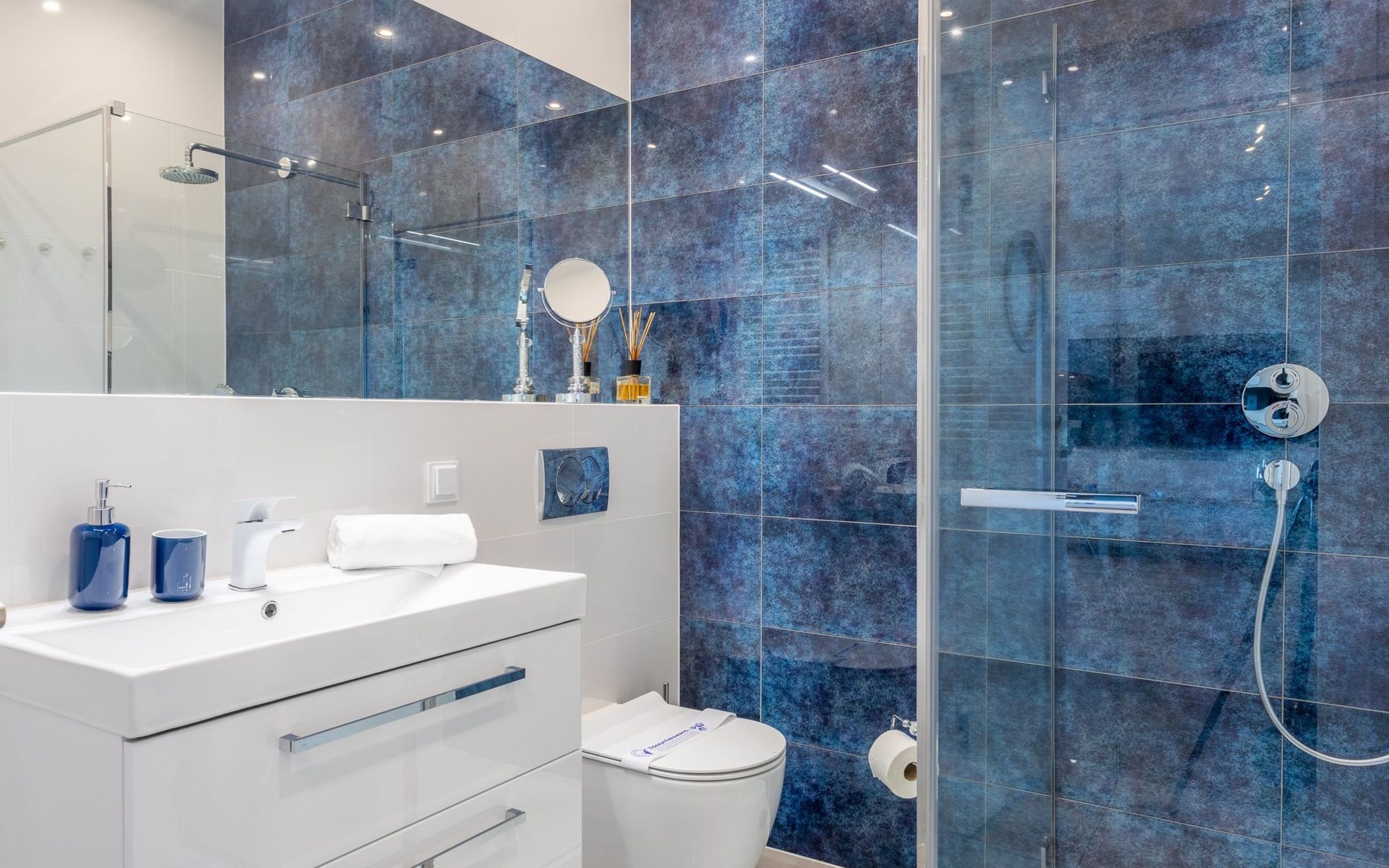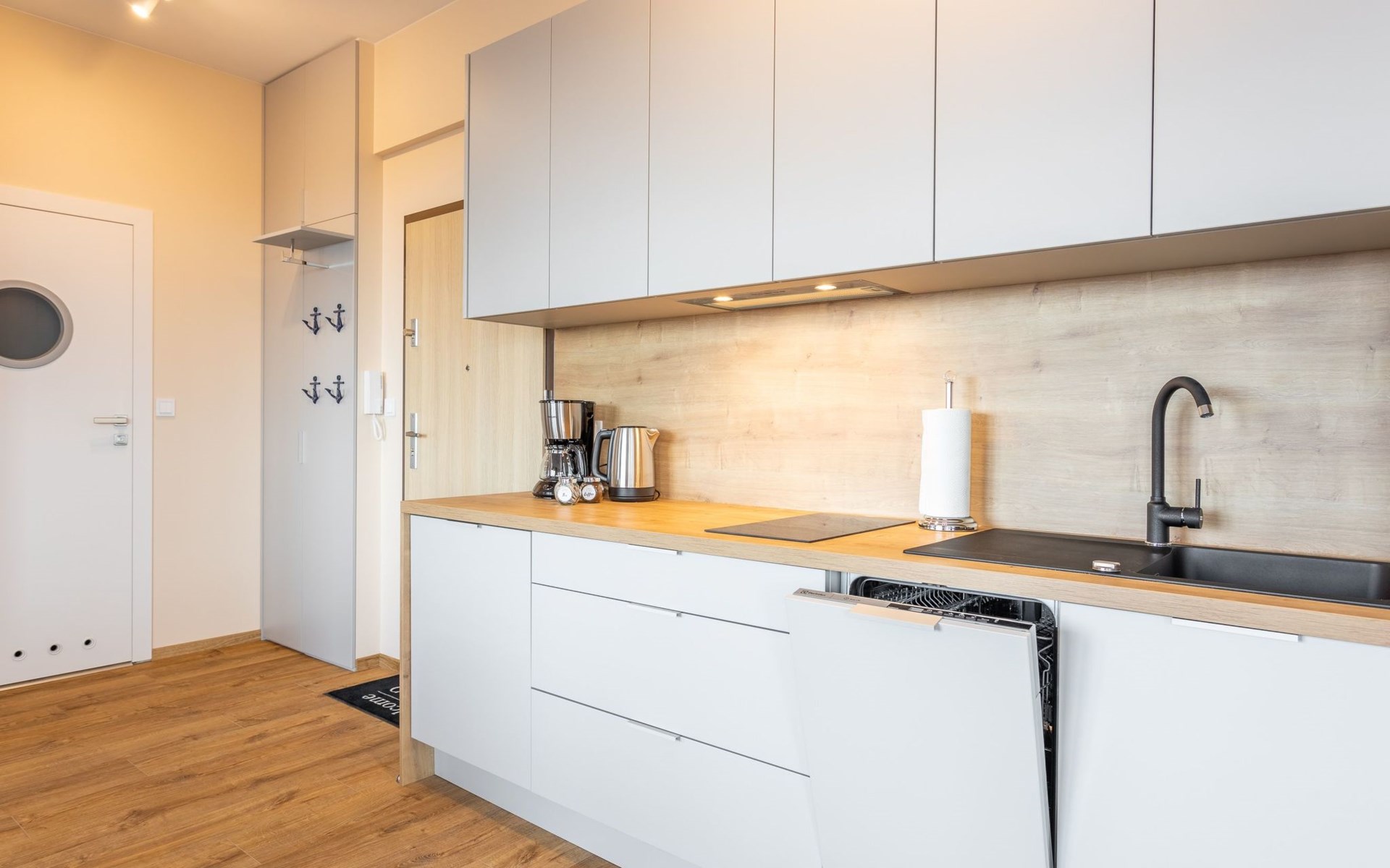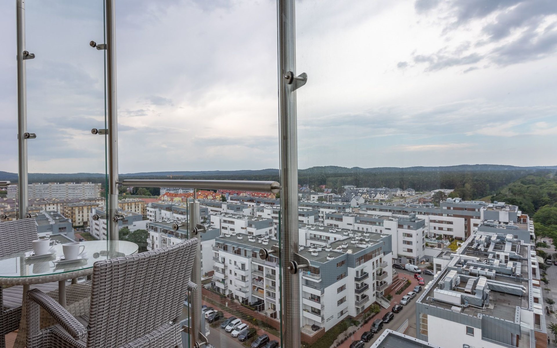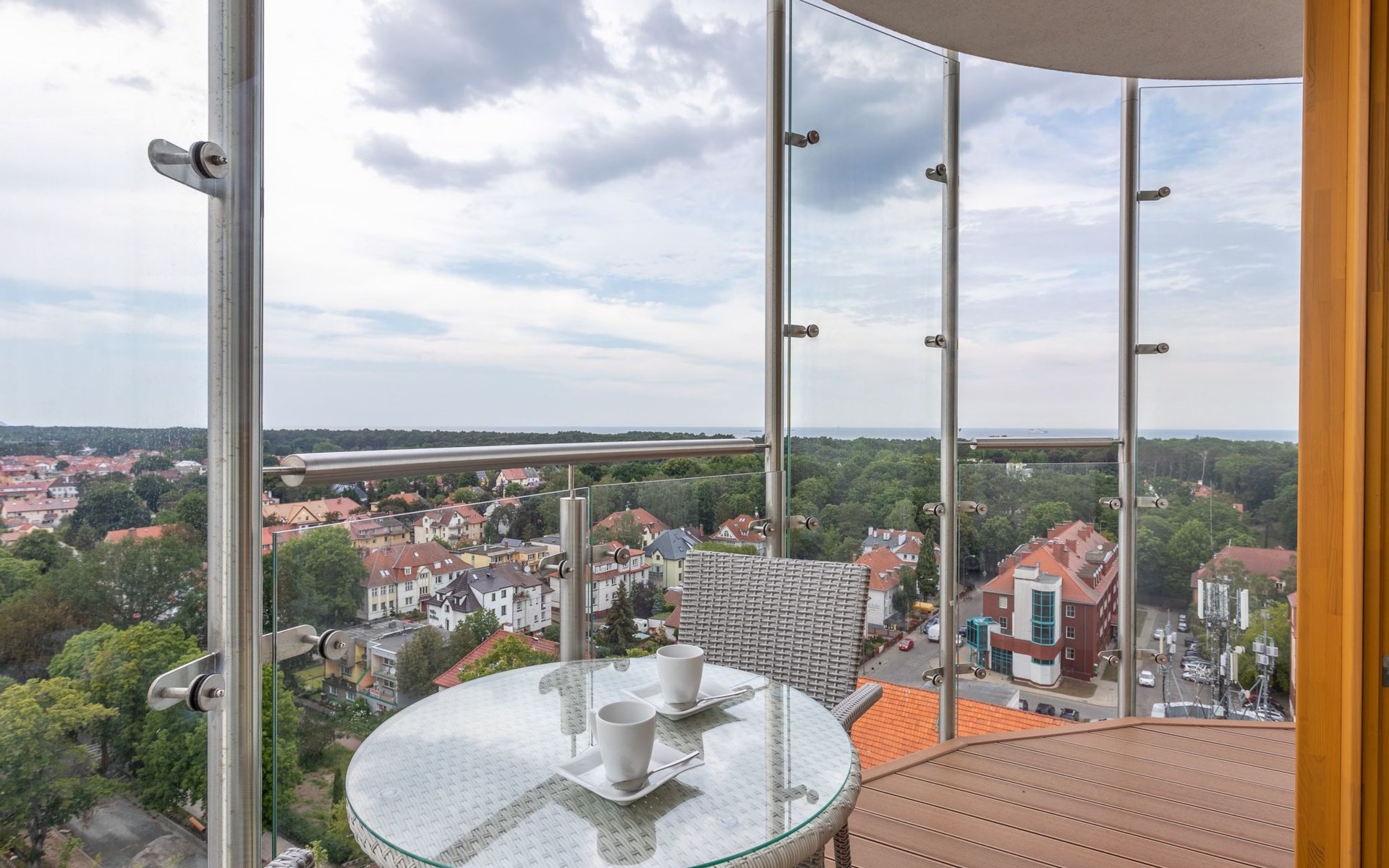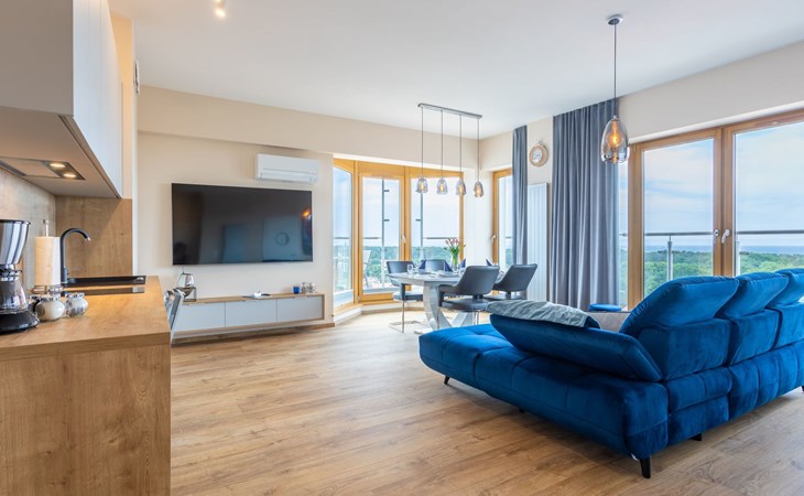 The "Tower 102" flat in Świnoujście is particularly appreciated by our guests for its excellent location, the highest quality of equipment and a breathtaking view of the Baltic Sea and the panorama of Świnoujście from the windows. It is an air-conditioned flat on the eleventh floor with one bedroom, a living room with a well-equipped kitchenette and a modern bathroom with a total area of 49 m2, as well as a large balcony, which is especially appreciated by guests because it allows moments of relaxation in the fresh air and at the same time in a quiet place. The interior is very bright, white, grey and beige dominate, evoking associations with sand, beach and sun, broken with a deep blue tone. In addition, thanks to the large and numerous glazed areas, a lot of daylight enters the interior, which also visually enlarges the space and gives it momentum. Attention is also drawn to expressive and very modern accessories as well as interesting shapes and textures - all with delicate and original marine motifs. The glazed doors, which echo the style of the windows in the ship's cabins, seem to be an extremely interesting solution. Without a doubt, you must go on board this deck!