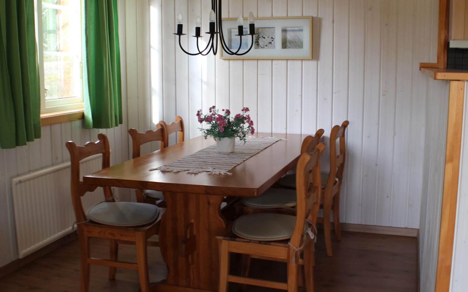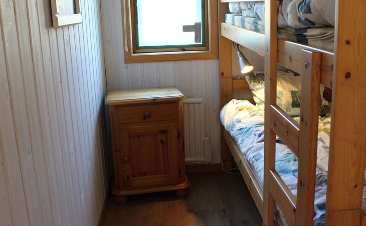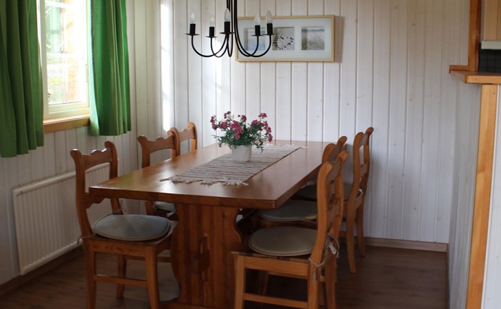 The holiday house can accommodate six people. The master bedroom is furnished with a double bed and a wardrobe. The two other smaller bedrooms each have a bunk bed. The open living and dining room with an open kitchen provides a sofa suite with armchairs, satellite TV and a dining table with six chairs. The kitchen is fully-equipped with a stove, oven, fridge-freezer, microwave, toaster, kettle, coffee machine and dishwasher. The bathroom comprises a shower, washbasin and toilet. There is also a washing machine for shared use with guests from a neighbouring house, in a separate building.