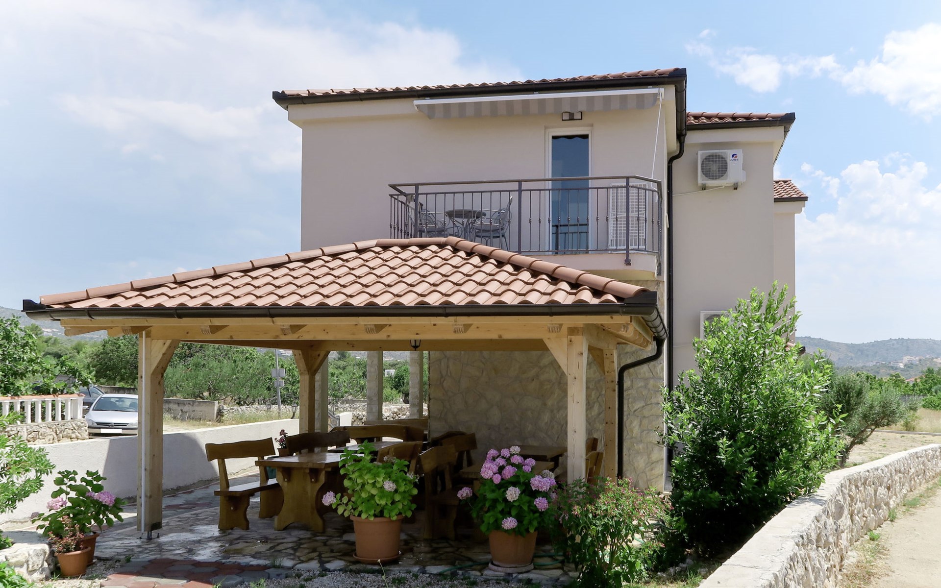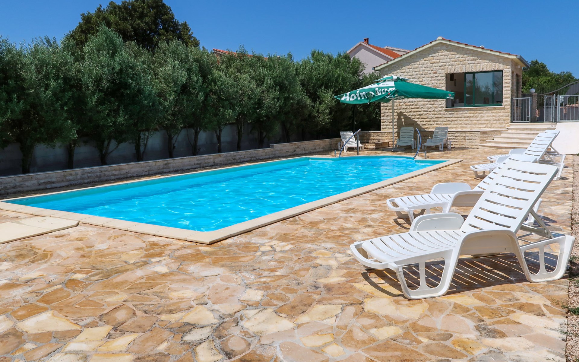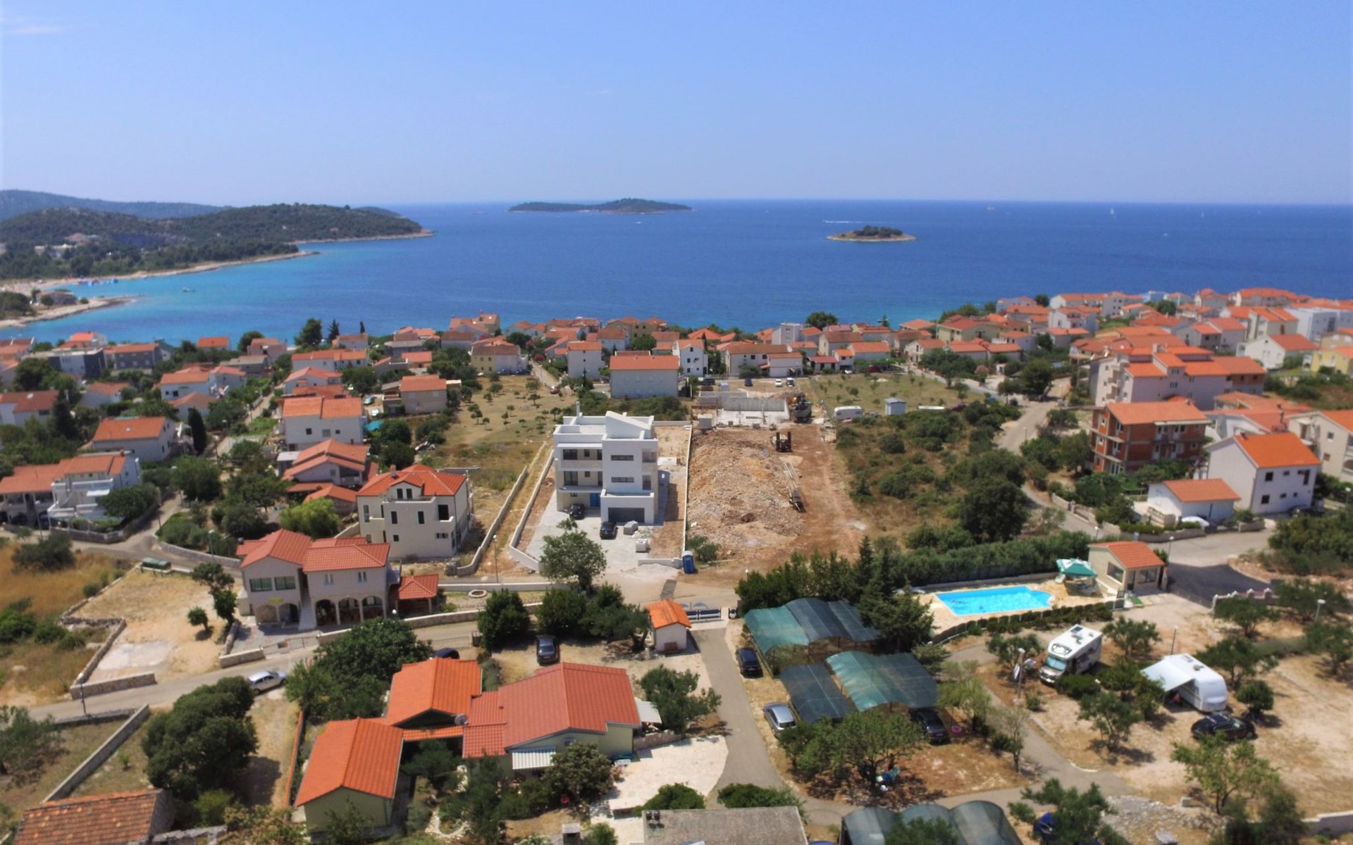 Holiday development "Camp Marko". 1 km from the centre of Rogoznica, 300 m from the sea, 300 m from the beach. For shared use: property 6'000 m2, swimming pool (10 x 5 m, depth 180 cm, seasonal availability: 21.May. - 01.Oct. pool opening hours: 10:00-18:00). Outdoor shower, barbecue. In the complex: restaurant, washing machine (for shared use). Parking on the premises. Shop 1 km, bus stop "Rogoznica" 2.4 km, rocky beach 300 m.